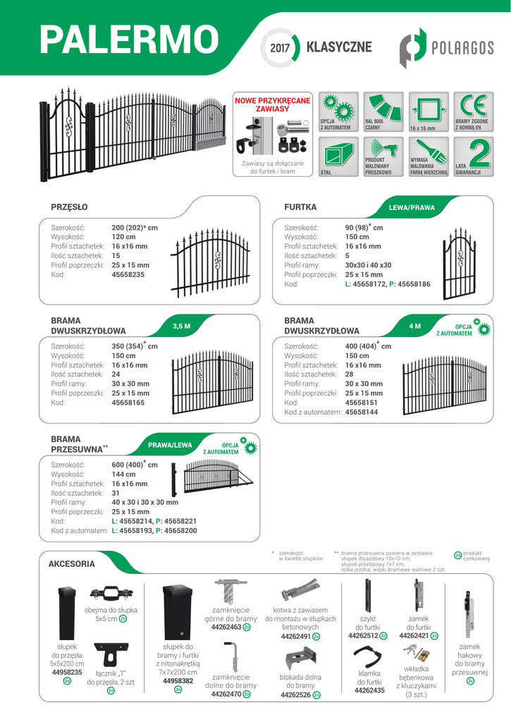 palermo KLASYCZNE nowe PRZYKRĘCANE zawiasy Zawiasy są dołączane do furtek i bram PRZĘSŁO FURTKA Szerokość: 200 (202)* cm Wysokość: 120 cm Profil sztachetek: 16 x16 mm Ilość sztachetek:15 Profil poprzeczki: 25 x 15 mm Kod: 45658235 Szerokość: Wysokość: Profil sztachetek: Ilość sztachetek: Profil ramy: Profil poprzeczki: Kod: BRAMA DWUSKRZYDŁOWA PRAWA/LEWA 90 (98)* cm 150 cm 16 x16 mm 5 30x30 i 40 x30 25 x 15 mm L: 45658172, P: 45658186 BRAMA DWUSKRZYDŁOWA 3,5 M 4M OPCJA Z AUTOMATEM Szerokość: 400 (404)* cm Wysokość: 150 cm Profil sztachetek: 16 x16 mm Ilość sztachetek:28 Profil ramy: 30 x 30 mm Profil poprzeczki: 25 x 15 mm Kod: 45658151 Kod z automatem: 45658144 Szerokość: 350 (354)* cm Wysokość: 150 cm Profil sztachetek: 16 x16 mm Ilość sztachetek:24 Profil ramy: 30 x 30 mm Profil poprzeczki: 25 x 15 mm Kod: 45658165 BRAMA PRZESUWNA** LEWA/PRAWA OPCJA Z AUTOMATEM Szerokość: 600 (400)* cm Wysokość: 144 cm Profil sztachetek: 16 x16 mm Ilość sztachetek:31 Profil ramy: 40 x 30 i 30 x 30 mm Profil poprzeczki: 25 x 15 mm Kod: L: 45658214, P: 45658221 Kod z automatem: L: 45658193, P: 45658200 * szerokość w świetle słupków akcesoria obejma do słupka 5x5 cm słupek do przęsła 5x5x200 cm 44958235 łącznik „T” do przęsła, 2 szt zamknięcie górne do bramy 44262463 słupek do bramy i furtki z nitonakrętką 7x7x200 cm 44958382 zamknięcie dolne do bramy 44262470 ** brama przesuwna zawiera w zestawie: słupek dojazdowy 10x10 cm, słupek przelotowy 7x7 cm, rolka jezdna, wózki bramowe wahliwe 2 szt. kotwa z zawiasem do montażu w słupkach betonowych 44262491 blokada dolna do bramy 44262526 szyld do furtki 44262512 klamka do furtki 44262435 produkt cynkowany zamek do furtki 44262421 wkładka bębenkowa z kluczykami (3 szt.) zamek hakowy do bramy przesuwnej