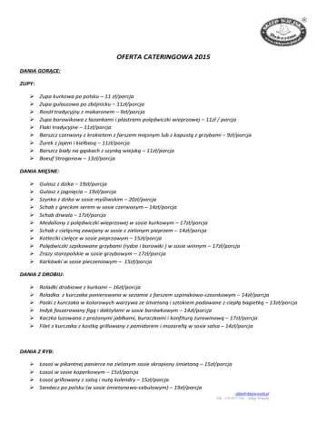 OFERTA CATERINGOWA 2015 DANIA GORĄCE: ZUPY: Zupa kurkowa po polsku – 11 zł/porcja Zupa gulaszowa po zbójnicku – 11zł/porcja Rosół tradycyjny z makaronem – 9zł/porcja Zupa borowikowa z łazankami i plastrami polędwiczki wieprzowej – 11zł / porcja Flaki tradycyjne – 11zł/porcja Barszcz czerwony z krokietem z farszem mięsnym lub z kapustą z grzybami – 9zł/porcja Żurek z jajem i kiełbasą – 11zł/porcja Barszcz biały na gąskach z szynką wiejską – 11zł/porcja Boeuf Strogonow – 13zł/porcja DANIA MIĘSNE: Gulasz z dzika – 19zł/porcja Gulasz z jagnięcia – 19zł/porcja Szynka z dzika w sosie myśliwskim – 20zł/porcja Schab z greckim serem w sosie czerwonym – 14zł/porcja Schab drwala – 17zł/porcja Medaliony z polędwiczki wieprzowej w sosie kurkowym – 17zł/porcja Schab z cielęciną zawijany w sosie z zielonym pieprzem – 14zł/porcja Kotleciki cielęce w sosie pieprzowym – 15zł/porcja Polędwiczki szpikowane grzybami (rydze i borowiki ) w sosie winnym – 17zł/porcja Zrazy staropolskie w sosie grzybowym – 17zł/porcja Karkówki w sosie pieczeniowym – 15zł/porcja DANIA Z DROBIU: Roladki drobiowe z kurkami – 16zł/porcja Roladka z kurczaka panierowana w sezamie z farszem szpinakowo-czosnkowym – 14zł/porcja Paski z kurczaka w kolorowych warzywa ze śmietaną i sztokiem podawane z ciepłą bagietką – 13zł/porcja Indyk faszerowany figą i daktylami w sosie borówkowym – 14zł/porcja Kaczka luzowana z prażonymi jabłkami, buraczkami i konfiturą żurawinową – 17zł/porcja Filet z kurczaka z kostką grillowany z pomidorem i mozarellą w sosie salsa – 14zł/porcja DANIA Z RYB: Łosoś w pikantnej panierce na zielonym sosie skropiony śmietaną – 15zł/porcja Łosoś w sosie koperkowym – 15zł/porcja Łosoś grillowany z salsą i nutą kolendry – 15zł/porcja Sandacz po polsku (w sosie śmietanowo-cebulowym) – 19zł/porcja [email protected] Tel: 519-057-784, Sklep Wiejski Sandacz smażony na maśle ziołowym – 19zł/porcja DODATKI: Ziemniaki z wody – 4 zł/porcja Ziemniaki opiekane – 4 zł/porcja Złociste ćwiartki ziemniaczane – 4 zł/porcja Kluski francuskie – 4 zł/porcja Kluski śląskie – 4 zł/porcja Pyzy – 4 zł/szt Kopytka – 4 zł/porcja Ryż rozmaitości – 4 zł/porcja Bukiet warzyw z wody – 4 zł/porcja Fasolka szparagowa – 4 zł/porcja Kulki z marchewki glazurowane – 4 zł/porcja Bukiet surówek – 4 zł/porcja Warzywa grillowane – 5 zł/porcja PRZEKĄSKI ZIMNE: (półmisek na ok. 8-10osób): Półmisek wędlin swojskich ze świeżo tartym chrzanem i grzybami marynowanymi – 60zł Pasztet z gęsich wątróbek – 40zł Krążki pasztetowe z konfiturą żurawinową – 50 zł Jaja faszerowane: jaja w majonezie, jaja z kawiorem, jaja z farszami (pieczarkowy, koperkowy, szynkowy) – 40zł Kaczka na bukiecie owocowym – 50zł Przekładaniec lordowski w sosie czosnkowym – 40zł Roladka z cukinii z serem i marynowanymi pomidorkami – 40zł Rolada cielęca w sosie ziołowym – 50zł Bukiet serów (brie, rokpol, camembert, ser żółty z dziurami, 2 sery smakowe) – 60zł Tatar tradycyjny – 70zł Smalec tradycyjny podawany z kiełbasą i kiszonym ogórkiem - 40zł Szynka parmeńska podawana na grillowane gruszce z sosem balsamico – 60zł/półmisek Tortilla z serkiem szczypiorkowym i kurczakiem curry – 50zł/półmisek PRZEKĄSKI KOKTAILOWE: Kanapki bankietowe (szynka, salami, łosoś, ser żółty)– 3,5zł/szt. Babeczki koktajlowe z farszami ( serowy, rybny, mięsny) – 4 zł/ szt. Tartinki z pastami smakowymi – 3 zł/szt. Koreczki – 2 zł/szt. GALARETY MIĘSNE: Roladka drobiowa z pikantnymi warzywami – 8zł/porcja Roladka z kaczki w galarecie Porto – 10 zł/porcja [email protected] Tel: 519-057-784, Sklep Wiejski Rolada z jelenia z czosnkiem kiszonym i słoniną – 10 zł/porcja Indyk pieczony w miodzie i malinach – 9 zł/porcja Sarnina po myśliwsku – 11zł/porcja Polędwiczki z brokułą – 9zł/porcja Schab po warszawsku – 9zł/porcja Schab z owocami w winnej galarecie(śliwka ,morela) – 8zł/porcja Szynka wiejska zawijana z sałatką jarzynową – 8zł/porcja Tymbaliki drobiowe – 7zł/porcja Nóżki wieprzowe – 7zł/porcja Rolada z ozorków i pieczonej papryki – 8zł/porcja GALARETY RYBNE: Łosoś z solą w zielonej otoczce – 10zł/porcja Łosoś w galarecie – 10zł/porcja Pstrąg w galarecie – 9zł/porcja Szczupak faszerowany w galarecie – 9zł/porcja Sandacz z sosem tatarskim – 11zł/porcja SAŁATKI: (8-10 os.) Sałatka meksykańska – 40zł Wiosenna sałatka z kurczakiem i grzankami – 40zł Sałatka tropikalna w świeżym ananasie – 40zł Sałatka z mini mozarelli i pomidorków cherry – 40zł Sałatka z szynką żółtym serem kukurydzą i papryką – 40zł Sałatka z kurczaka z rusztu sałaty lodowej i borówek w sosie miodowo musztardowym – 40zł Sałatka jarzynowa tradycyjna – 40zł Sałatka grecka – 40zł Sałatka ze schabu pieczonego i kurek marynowanych – 40zł Sałatka brokułowa z szynką, jajem i rodzynkami – 40zł Sałatka arabska z makaronu arabskiego kurczaka i pieczarek – 40zł Sałatka z makaronu sojowego i kurczaka lub pałeczek krabowych – 40zł Sałatka cesarska – 40zł Sałatka z kaczki z dresingiem jagodowym - 40zł Sałatka bacy – 40zł RYBY: (półmisek na ok. 8-10osób): Śledź w trzech smakach – 40zł Śledź w oleju z cebulą – 40zł Bukiet ryb wędzonych (pstrąg, łosoś, węgorz) – 120zł Łosoś na musie chrzanowym – 70zł Rurki z łososia z twarożkiem cytrynowo-szczypiorkowym – 70 zł [email protected] Tel: 519-057-784, Sklep Wiejski Tatar z łososia – 70zł Różyczki z łososia podawane na placuszkach warzywnych skropione kwaśną śmietaną – 70zł Tortilla z serkiem szczypiorkowym i łososiem – 60zł DODATKI (półmisek na 10 osób): Masło – 10zł Masła smakowe – 20zł Chrzan – 5zł Ćwikła – 5zł Warzywa świeże i konserwowe – 20 zł 