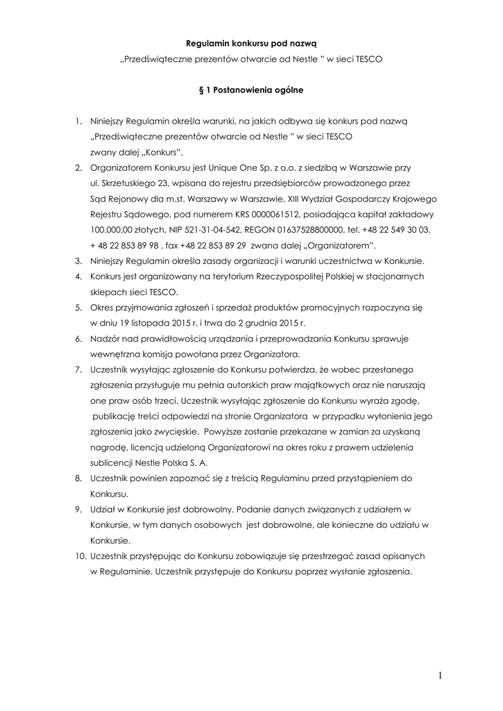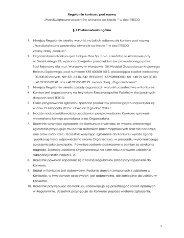 Regulamin konkursu pod nazwą „Przedświąteczne prezentów otwarcie od Nestle ” w sieci TESCO § 1 Postanowienia ogólne 1. Niniejszy Regulamin określa warunki, na jakich odbywa się konkurs pod nazwą „Przedświąteczne prezentów otwarcie od Nestle ” w sieci TESCO zwany dalej „Konkurs”. 2. Organizatorem Konkursu jest Unique One Sp. z o.o. z siedzibą w Warszawie przy ul. Skrzetuskiego 23, wpisana do rejestru przedsiębiorców prowadzonego przez Sąd Rejonowy dla m.st. Warszawy w Warszawie, XIII Wydział Gospodarczy Krajowego Rejestru Sądowego, pod numerem KRS 0000061512, posiadająca kapitał zakładowy 100.000,00 złotych, NIP 521-31-04-542, REGON 01637528800000, tel. +48 22 549 30 03, + 48 22 853 89 98 , fax +48 22 853 89 29 zwana dalej „Organizatorem”. 3. Niniejszy Regulamin określa zasady organizacji i warunki uczestnictwa w Konkursie. 4. Konkurs jest organizowany na terytorium Rzeczypospolitej Polskiej w stacjonarnych sklepach sieci TESCO. 5. Okres przyjmowania zgłoszeń i sprzedaż produktów promocyjnych rozpoczyna się w dniu 19 listopada 2015 r. i trwa do 2 grudnia 2015 r. 6. Nadzór nad prawidłowością urządzania i przeprowadzania Konkursu sprawuje wewnętrzna komisja powołana przez Organizatora. 7. Uczestnik wysyłając zgłoszenie do Konkursu potwierdza, że wobec przesłanego zgłoszenia przysługuje mu pełnia autorskich praw majątkowych oraz nie naruszają one praw osób trzeci. Uczestnik wysyłając zgłoszenie do Konkursu wyraża zgodę, publikację treści odpowiedzi na stronie Organizatora w przypadku wyłonienia jego zgłoszenia jako zwycięskie. Powyższe zostanie przekazane w zamian za uzyskaną nagrodę, licencją udzieloną Organizatorowi na okres roku z prawem udzielenia sublicencji Nestle Polska S. A. 8. Uczestnik powinien zapoznać się z treścią Regulaminu przed przystąpieniem do Konkursu. 9. Udział w Konkursie jest dobrowolny. Podanie danych związanych z udziałem w Konkursie, w tym danych osobowych jest dobrowolne, ale konieczne do udziału w Konkursie. 10. Uczestnik przystępując do Konkursu zobowiązuje się przestrzegać zasad opisanych w Regulaminie. Uczestnik przystępuje do Konkursu poprzez wysłanie zgłoszenia. 1 § 2 Uczestnicy 1. Udział w Konkursie mogą brać wyłącznie osoby fizyczne, które ukończyły 18 lat, posiadające pełną zdolność do czynności prawnych, zamieszkałe na terytorium Rzeczypospolitej Polskiej, nabywające określone w niniejszym Regulaminie produkty promocyjne, jako konsumenci w rozumieniu art. 221 Kodeksu cywilnego (Dz.U. z 2014 r. poz. 121 z późn. zm.). 2. Uczestnikiem Konkursu jest podmiot spełniający wymagania określone w Regulaminie, który dokona prawidłowego zgłoszenia do Konkursu zgodnie z §3 (dalej „Uczestnik”). 3. Nagród w Konkursie nie mogą otrzymać pracownicy i członkowie rodziny pracowników Organizatora oraz pracownicy i członkowie rodziny pracowników Firmy Nestle Polska S.A. z siedzibą w Warszawie 02-678, przy ul. Szturmowej 2. Przez członków rodziny rozumie się: wstępnych, zstępnych, rodzeństwo, małżonków, małżonków i zstępnych rodzeństwa, rodziców i rodzeństwo małżonków oraz osoby pozostające w stosunku przysposobienia. §3 Zasady konkursu – dokonywanie zgłoszeń 1. W Konkursie biorą udział produkty marek : Winiary, Kit Kat, Princessa, Zbożaki, Nescafe Dolce Gusto, Nescafe, Nesvita, Maxer, Smarties, JoJo, After Eight a w następujących markach wymienione grupy produktów: batony Lion, wafle i kakao Nesquick oraz lody Nestlé - dostępne w sieci Tesco w okresie wskazanym w §1 ust. 5 (zwane dalej „Produktami Promocyjnymi”). 2. Sprzedaż Produktów Promocyjnych umożliwiających udział w Konkursie rozpoczyna się 19 listopada 2015 r. i trwa do 2 grudnia 2015 r. Poza tym okresem Produkty Promocyjne są dostępne w sprzedaży, jednak ich zakup nie uprawnia do udziału w Konkursie. 3. Aby wziąć udział w Konkursie należy: 1) Dokonać zakupu Produktów Promocyjnych za min. 25 zl (słownie: dwadzieścia pięć) brutto w stacjonarnym sklepie sieci Tesco, potwierdzonego jednym paragonem fiskalnym i zachować powyższy paragon fiskalny; 2) Dokonać prawidłowego zgłoszenia swojego udziału w Konkursie za pomocą wiadomości tekstowej SMS odpowiadając na pytanie: „Jak Nestlé umili Ci święta?” i przesłać treść odpowiedzi SMS’em pod numer 7057 wpisując w treść SMS’a: NESTLE.numer z paragonu fiskalnego.treść odpowiedzi. (dalej „Zgłoszenie”). 4. Koszt wysyłki SMS-a to 0,50 zł bez VAT (0,62 zł z VAT). Koszt wysłania wiadomości SMS ponoszą Uczestnicy Konkursu. 5. W odpowiedzi na prawidłowo przesłane Zgłoszenie, Uczestnicy otrzymują zwrotnego, bezpłatnego SMS informującego o przyjęciu ich Zgłoszenia do Konkursu. 2 6. Liczba znaków w treści SMS’a nie powinna przekroczyć 160 znaków (w tym prefiks – NESTLE.numer z paragonu z fiskalnego.). W zależności od sposobu rozliczania wiadomości SMS stosowanego przez operatorów telefonii komórkowej lub/i uwarunkowań technicznych modelu telefonu użytego w tym celu przez Uczestnika Konkursu, faktyczna długość wiadomości SMS zgłoszonej do Konkursu przez Uczestnika może być różna. W szczególności dotyczy to wiadomości SMS zawierających polskie znaki diakrytyczne, w związku z czym przed wysłaniem Zgłoszenia Uczestnik Konkursu powinien upewnić się, że treść Zgłoszenia nie przekracza liczby znaków wskazanej powyżej. W przypadku, jeśli liczba znaków w SMS przekroczy 160 znaków, Komisja Konkursowa wyłaniając zwycięskie odpowiedzi weźmie pod uwagę tylko pierwsze 160 znaków. 7. Jeden, dany paragon fiskalny można zgłosić do Konkursu tylko raz. Daną treść odpowiedzi Uczestnik może zgłosić tylko raz. 8. Termin przyjmowania Zgłoszeń rozpoczyna się 19 listopada 2015 r. o godz. 0:00:00 i mija dnia 2 grudnia 2015 r. o godz. 23:59:59. Decyduje data i godzina dostarczenia Zgłoszenia do Organizatora. 9. Każdy Uczestn