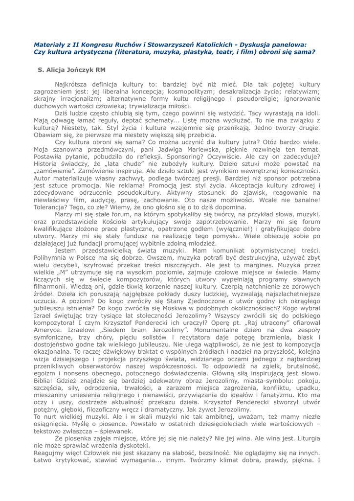Materiały z II Kongresu Ruchów i Stowarzyszeń Katolickich - Dyskusja panelowa: Czy kultura artystyczna (literatura, muzyka, plastyka, teatr, i film) obroni się sama? S. Alicja Jończyk RM Najkrótsza definicja kultury to: bardziej być niż mieć. Dla tak pojętej kultury zagrożeniem jest: jej liberalna koncepcja; kosmopolityzm; desakralizacja życia; relatywizm; skrajny irracjonalizm; alternatywne formy kultu religijnego i pseudoreligie; ignorowanie duchowych wartości człowieka; trywializacja miłości. Dziś ludzie często chlubią się tym, czego powinni się wstydzić. Tacy wyrastają na idoli. Mają odwagę łamać reguły, deptać schematy... Listę można wydłużać. To nie ma związku z kulturą? Niestety, tak. Styl życia i kultura wzajemnie się przenikają. Jedno tworzy drugie. Obawiam się, że pierwsze ma niestety większą siłę przebicia. Czy kultura obroni się sama? Co można uczynić dla kultury jutra? Otóż bardzo wiele. Moja szanowna przedmówczyni, pani Jadwiga Marlewska, pięknie rozwinęła ten temat. Postawiła pytanie, pobudziła do refleksji. Sponsoring? Oczywiście. Ale czy on zadecyduje? Historia świadczy, że „lata chude” nie zubożyły kultury. Dzieło sztuki może powstać na „zamówienie”. Zamówienie inspiruje. Ale dzieło sztuki jest wynikiem wewnętrznej konieczności. Autor materializuje własny zachwyt, podlega twórczej presji. Bardziej niż sponsor potrzebna jest sztuce promocja. Nie reklama! Promocją jest styl życia. Akceptacja kultury zdrowej i zdecydowane odrzucenie pseudokultury. Aktywny stosunek do zjawisk, reagowanie na niewłaściwy film, audycję, prasę, zachowanie. Oto nasze możliwości. Wcale nie banalne! Tolerancja? Tego, co złe? Wiemy, że ono głośno się o to dziś dopomina. Marzy mi się stałe forum, na którym spotykaliby się twórcy, na przykład słowa, muzyki, oraz przedstawiciele Kościoła artykułujący swoje zapotrzebowanie. Marzy mi się forum kwalifikujące złożone prace plastyczne, opatrzone godłem (wyłącznie!) i gratyfikujące dobre utwory. Marzy mi się stały fundusz na realizację tego pomysłu. Wiele obiecuję sobie po działającej już fundacji promującej wybitnie zdolną młodzież. Jestem przedstawicielką świata muzyki. Mam komunikat optymistycznej treści. Polihymnia w Polsce ma się dobrze. Owszem, muzyka potrafi być destrukcyjna, używać zbyt wielu decybeli, szyfrować przekaz treści niszczących. Ale jest to margines. Muzyka przez wielkie „M” utrzymuje się na wysokim poziomie, zajmuje czołowe miejsce w świecie. Mamy liczących się w świecie kompozytorów, których utwory wypełniają programy sławnych filharmonii. Wiedzą oni, gdzie tkwią korzenie naszej kultury. Czerpią natchnienie ze zdrowych źródeł. Dzieła ich poruszają najgłębsze pokłady duszy ludzkiej, wyzwalają najszlachetniejsze uczucia. A poziom? Do kogo zwróciły się Stany Zjednoczone o utwór godny ich okrągłego jubileuszu istnienia? Do kogo zwróciła się Moskwa w podobnych okolicznościach? Kogo wybrał Izrael świętując trzy tysiące lat stołeczności Jerozolimy? Wszyscy zwrócili się do polskiego kompozytora! I czym Krzysztof Penderecki ich uraczył? Operę pt. „Raj utracony” ofiarował Ameryce. Izraelowi „Siedem bram Jerozolimy”. Monumentalne dzieło na dwa zespoły symfoniczne, trzy chóry, pięciu solistów i recytatora daje potęgę brzmienia, blask i dostojeństwo godne tak wielkiego jubileuszu. Nie ulega wątpliwości, że nie jest to kompozycja okazjonalna. To raczej dźwiękowy traktat o wspólnych źródłach i nadziei na przyszłość, kolejna wizja dzisiejszego i projekcja przyszłego świata, widzianego oczami jednego z najbardziej przenikliwych obserwatorów naszej współczesności. To odpowiedź na zgiełk, brutalność, egoizm i nonsens obecnego, potocznego doświadczenia. Główną siłą inspirującą jest słowo. Biblia! Gdzież znajdzie się bardziej adekwatny obraz Jerozolimy, miasta-symbolu: pokoju, szczęścia, siły, odrodzenia, trwałości, a zarazem miejsca zagrożenia, konfliktu, upadku, mieszaniny uniesienia religijnego i nienawiści, przywiązania do ideałów i fanatyzmu. Kto ma oczy i uszy, dostrzeże aktualność przekazu dzieła. Krzysztof Penderecki stworzył utwór potężny, głęboki, filozoficzny wręcz i dramatyczny. Jak żywot Jerozolimy. To nurt wielkiej muzyki. Ale i w skali muzyki nie tak ambitnej, uważam, też mamy niezłe osiągnięcia. Myślę o piosence. Powstało w ostatnich dziesięcioleciach wiele wartościowych – tekstowo zwłaszcza – śpiewanek. Że piosenka zajęła miejsce, które jej się nie należy? Nie jej wina. Ale wina jest. Liturgia nie może sprawiać wrażenia dyskoteki. Reagujmy więc! Człowiek nie jest skazany na słabość, bezsilność. Nie oglądajmy się na innych. Łatwo krytykować, stawiać wymagania... innym. Twórzmy klimat dobra, prawdy, piękna. I podnieśmy głowy, które pochylił nam system! Mamy czym się chlubić! Odrzućmy kompleksy! Świat dostrzega nasz wkład we „wczoraj”, „dziś” i potencjał na „jutro”.