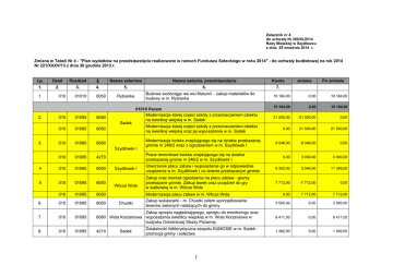 Załącznik nr 4 do uchwały Nr 260/XLIII/14 Rady Miejskiej w Szydłowcu z dnia 29 września 2014 r. Zmiana w Tabeli Nr 4 - "Plan wydatków na przedsięwzięcia realizowane w ramach Funduszu Sołeckiego w roku 2014" - do uchwały budżetowej na rok 2014 Nr 221/XXXV/13 z dnia 30 grudnia 2013 r. Lp. Dział Rozdział § Nazwa sołectwa Nazwa zadania, przedsięwzięcia Kwota 1. 2. 3. 4. 5. 6. 7. 01010 6050 1. 2. 010 010 01095 6050 Sadek 3. Budowa wodociągu we wsi Marywil - zakup materiałów do budowy w m. Rybianka Rybianka 0,00 10 184,00 10 184,00 0,00 10 184,00 21 500,00 -21 500,00 0,00 0,00 21 500,00 21 500,00 8 046,00 -8 046,00 0,00 0,00 3 000,00 3 000,00 Utworzenie placu zabaw i wyposażenie go w odpowiednie urządzenia w m. Szydłówek I na terenie przekazanym gminie 6 300,00 5 046,00 11 346,00 Zakup oraz montaż ogrodzenia na placu zabaw - grunty przekazane gminie. Zakup ławek oraz urządzeń do gry w siatkówkę w m. Wilcza Wola 7 712,00 -7 712,00 0,00 0,00 7 712,00 7 712,00 3 500,00 0,00 3 500,00 010 01095 6050 Modernizacja starej części szkoły z przeznaczeniem obiektu na świetlicę wiejską oraz jej wyposażenie w m. Sadek 010 01095 6050 Modernizacja boiska znajdującego się na działce przekazanej gminie nr 246/2 wraz z ogrodzeniem w m. Szydłówek I Prace remontowe boiska znajdującego się na działce przekazanej gminie nr 246/2 w m. Szydłówek I 010 01095 4270 4 010 01095 6050 5 010 01095 6050 010 01095 6050 Modernizacja placu zabaw w m. Wilcza Wola Zakup wykaszarki - m. Chustki celem uporządkowania terenów zielonych należących do gminy Szydłówek I Wilcza Wola Chustki Po zmianie 10 184,00 01010 Razem Modernizacja starej części szkoły z przeznaczeniem obiektu na świetlicę wiejską w m. Sadek Szydłówek I zmiana 6. 010 01095 6060 7. 010 01095 Zakup sprzętu nagłaśniającego, sprzętu do monitoringu oraz 6060 Wola Korzeniowa wyposażenia świetlicy wiejskiej w m. Wola Korzeniowa w budynku Ochotniczej Straży Pożarnej. 8 411,00 0,00 8 411,00 8. 010 01095 4210 Działalność folklorystyczna zespołu KUMOSIE w m. Sadek promocja gminy i sołectwa 1 482,00 0,00 1 482,00 Sadek 1 9. Organizacja Święta Jagody w m. Sadek - promocja sołectwa, gminy. Konkursy na najlepszą potrawę, ciasto, wypiek z dodatkiem jagód. 1 500,00 -1 500,00 0,00 Organizacja Święta Jagody w m. Sadek - promocja sołectwa, gminy. Konkursy na najlepszą potrawę, ciasto, wypiek z dodatkiem jagód. 0,00 600,00 600,00 Organizacja Święta Jagody w m. Sadek - promocja sołectwa, gminy. Konkursy na najlepszą potrawę, ciasto, wypiek z dodatkiem jagód. 0,00 900,00 900,00 Konserwacja, zabezpieczenie i odmalowanie altany oraz zakup materiałów do tych prac. Zakup urządzeń na plac zabaw w m. Chustki na teren przekazany gminie. 7 972,00 0,00 7 972,00 Zakup ziemi pod boisko sportowe na terenie działki 393 przekazanej gminie w m. Hucisko 8 500,00 -8 500,00 0,00 Transport ziemi pod boisko sportowe na terenie działki przekazanej gminie nr 393 w m. Hucisko 1 366,00 -1 366,00 0,00 0,00 9 866,00 9 866,00 7 638,00 -7 638,00 0,00 0,00 7 638,00 7 638,00 83 927,00 0,00 83 927,00 23 000,00 -23 000,00 0,00 23 000,00 23 000,00 010 01095 4210 010 01095 3020 010 01095 4300 10. 010 01095 4210 11. 010 01095 4210 010 01095 4300 010 01095 4300 Wykopanie oczka wodnego i przełożenie ziemi na boisko na działce przekazanej gminie Szydłowiec 010 01095 4210 Kontynuacja remontu świetlicy wiejskiej w m. Korzyce, zakup materiałów budowlanych 010 01095 4210 Sadek Chustki Hucisko 13. 12. Korzyce 600 60016 6050 600 60016 6050 600 60016 6050 14. 15. Kontynuacja remontu świetlicy wiejskiej w m. Korzyce, zakup materiałów budowlanych, zakup wyposażenia do świetlicy oraz zakup akcesoriów do kosiarki 01095 Razem Przebudowa drogi gminnej biegnącej przez wieś Ciechostowice Ciechostowice Przebudowa drogi gminnej biegnącej przez wieś Ciechostowice, zakup i montaż wiat przystankowych Łazy Przebudowa drogi gminnej biegnącej przez wieś Łazy 13 000,00 0,00 13 000,00 Budowa chodnika (130mb) w m. Jankowice, przy drodze gminnej 9 744,00 0,00 9 744,00 Modernizacja drogi gminnej na odcinku od drogi powiatowej do końca miejscowości Krzcięcin 7 026,00 0,00 7 026,00 13 710,00 0,00 13 710,00 8 054,00 0,00 8 054,00 10 919,00 0,00 10 919,00 16. 600 60016 6050 Jankowice 17. 600 60016 6050 Krzcięcin 18. 600 60016 6050 Szydłówek II 19. 600 60016 6050 Omięcin Podwyższenie i utwardzenie odcinka drogi gminnej Omięcin Korzyce (ok.. 100m) w m. Omięcin 20. 600 60016 4270 Zastronie Kontynuacja remontu drogi gminnej w m. Zastronie. Budowa odcinka drogi gminnej łączącej Szydłówek Kolonię z Szydłówkiem pod Lasem - Szydłówek II 2 60016 Razem Majdów Modernizacja budynku OSP w Majdowie 21. 754 75412 6050 22. 754 75412 6050 Wola Korzeniowa 23. 801 80101 4210 24. 900 90015 6050 25. 26. 900 900 90015 90015 6050 4300 27. 926 92695 4210 28. 926 92695 4210 Założenie systemu selektywnego wywoływania (alarmowania) w OSP Wola Korzeniowa 75412 Razem Zakup okna do sali lekcyjnej, zakup piaskownicy z zadaszeniem oraz 7 sztuk ławek żeliwnych dla PSP Wysoka w Wysokiej 80101 Razem Wykonanie oświetlenia przy skrzyżowaniu dróg za stawem Chustki w kierunku Zdziechowa oraz oświetlenia przy altance w m. Chustki Zdziechów Majdów Instalacja oświetlenia ulicznego w m. Zdziechów Zamontowanie dwóch lamp oświetleniowych w m. Majdów 90015 Razem Zakup strojów sportowych oraz sprzętu dla drużyny sołeckiej Ciechostowice m. Ciechostowice Łazy Zakup strojów sportowych oraz sprzętu dla drużyny sołeckiejm. Łazy 92695 Razem Fundusz Sołecki na 2014 rok 85 453,00 0,00 85 453,00 16 973,00 0,00 16 973,00 7 625,00 0,00 7 625,00 24 598,00 0,00 24 598,00 9 058,00 0,00 9 058,00 9 058,00 0,00 9 058,00 4 000,00 0,00 4 000,00 19 169,00 0,00 19 169,00 2 000,00 0,00 2 000,00 25 169,00 0,00 25 169,00 1 482,00 0,00 1 482,00 1 420,00 0,00 1 420,00 2 902,00 0,00 2 902,00 241 291,00 0,00 241 291,00 187 954,00 -3 000,00 184 954,00 53 337,00 3 000,