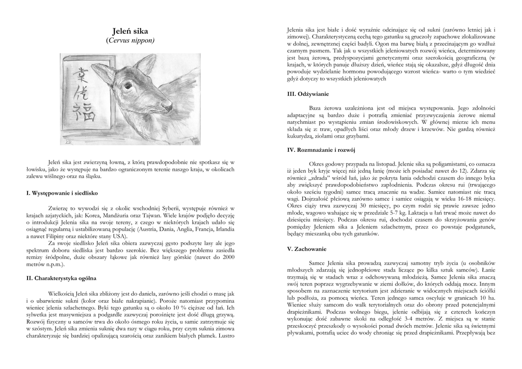 Jeleń sika (Cervus nippon) Jelenia sika jest białe i dość wyraźnie odcinające się od sukni (zarówno letniej jak i zimowej). Charakterystyczną cechą tego gatunku są gruczoły zapachowe zlokalizowane w dolnej, zewnętrznej części badyli. Ogon ma barwę białą z przecinającym go wzdłuż czarnym pasmem. Tak jak u wszystkich jeleniowatych rozwój wieńca, determinowany jest bazą żerową, predyspozycjami genetycznymi oraz szerokością geograficzną (w krajach, w których panuje dłuższy dzień, wieńce stają się okazalsze, gdyż długość dnia powoduje wydzielanie hormonu powodującego wzrost wieńca- warto o tym wiedzieć gdyż dotyczy to wszystkich jeleniowatych III. Odżywianie Baza żerowa uzależniona jest od miejsca występowania. Jego zdolności adaptacyjne są bardzo duże i potrafią zmieniać przyzwyczajenia żerowe niemal natychmiast po wystąpieniu zmian środowiskowych. W głównej mierze ich menu składa się z: traw, opadłych liści oraz młody drzew i krzewów. Nie gardzą również kukurydzą, ziołami oraz grzybami. IV. Rozmnażanie i rozwój Jeleń sika jest zwierzyną łowną, z którą prawdopodobnie nie spotkasz się w łowisku, jako że występuje na bardzo ograniczonym terenie naszgo kraju, w okolicach zalewu wiślnego oraz na śląsku. I. Występowanie i siedlisko Zwierzę to wywodzi się z okolic wschodniej Syberii, występuje również w krajach azjatyckich, jak: Korea, Mandżuria oraz Tajwan. Wiele krajów podjęło decyzję o introdukcji Jelenia sika na swoje tereny, z czego w niektórych krajach udało się osiągnąć regularną i ustabilizowaną populację (Austria, Dania, Anglia, Francja, Irlandia a nawet Filipiny oraz niektóre stany USA). Za swoje siedlisko Jeleń sika obiera zazwyczaj gęsto podszyte lasy ale jego spektrum doboru siedliska jest bardzo szerokie. Bez większego problemu zasiedla remizy śródpolne, duże obszary łąkowe jak również lasy górskie (nawet do 2000 metrów n.p.m.). II. Charakterystyka ogólna Wielkością Jeleń sika zbliżony jest do daniela, zarówno jeśli chodzi o masę jak i o ubarwienie sukni (kolor oraz białe nakrapianie). Poroże natomiast przypomina wieniec jelenia szlachetnego. Byki tego gatunku są o około 10 % cięższe od łań. Ich sylwetka jest masywniejsza a podgardle zazwyczaj porośnięte jest dość długą grzywą. Rozwój fizyczny u samców trwa do około ósmego roku życia, u samic zatrzymuje się w szóstym. Jeleń sika zmienia suknię dwa razy w ciągu roku, przy czym suknia zimowa charakteryzuje się bardziej opalizującą szarością oraz zanikiem białych plamek. Lustro Okres godowy przypada na listopad. Jelenie sika są poligamistami, co oznacza iż jeden byk kryje więcej niż jedną łanię (może ich posiadać nawet do 12). Zdarza się również „zdrada” wśród łań, jako że pokryta łania odchodzi czasem do innego byka aby zwiększyć prawdopodobieństwo zapłodnienia. Podczas okresu rui (trwającego około sześciu tygodni) samce tracą znacznie na wadze. Samice natomiast nie tracą wagi. Dojrzałość płciową zarówno samce i samice osiągają w wieku 16-18 miesięcy. Okres ciąży trwa zazwyczaj 30 miesięcy, po czym rodzi się prawie zawsze jedno młode, wagowo wahające się w przedziale 5-7 kg. Laktacja u łań trwać może nawet do dziesięciu miesięcy. Podczas okresu rui, dochodzi czasem do skrzyżowania genów pomiędzy Jeleniem sika a Jeleniem szlachetnym, przez co powstaje podgatunek, będący mieszanką obu tych gatunków. V. Zachowanie Samce Jelenia sika prowadzą zazwyczaj samotny tryb życia (u osobników młodszych zdarzają się jednopłciowe stada liczące po kilka sztuk samców). Łanie trzymają się w stadach wraz z odchowywaną młodzieżą. Samce Jelenia sika znaczą swój teren poprzez wygrzebywanie w ziemi dołków, do których oddają mocz. Innym sposobem na zaznaczenie terytorium jest zdzieranie w widocznych miejscach ściółki lub podłoża, za pomocą wieńca. Teren jednego samca oscyluje w granicach 10 ha. Wieniec służy samcom do walk terytorialnych oraz do obrony przed potencjalnymi drapieżnikami. Podczas wolnego biegu, jelenie odbijają się z czterech kończyn wykonując dość zabawne skoki na odległość 3-4 metrów. Z miejsca są w stanie przeskoczyć przeszkody o wysokości ponad dwóch metrów. Jelenie sika są świetnymi pływakami, potrafią uciec do wody chroniąc się przed drapieżnikami. Przepływają bez większego problemu dystanse nawet do 15 kilometrów. Gatunek ten jest dobrze uwokalniony, potrafiąc produkować bardzo dużą gamę dźwięków. Od gwizdów poprzez świst, a na odgłosach podobnych do rżenia koni skończywszy. W polskich lasach zdarzają się sytuacje łączenia we wspólne chmary Jeleni sika oraz szlachetnych, zazwyczaj jednak gatunki te są do siebie nastawione antagonistycznie. VI. Ekologia gatunku W większości miejsc występowania Jeleni sika są one jednym z elementów łańcucha troficznego (są zjadane przez większe drapieżniki). W Polsce presja dużych drapieżników jak wilki czy rysie, praktycznie nie występuje, przez co rolę tego gatunku można określić jako drobny wkład w zwiększenie bioróżnorodności naszych łowisk. Jego bytność w łowisku nie stanowi większej konkurencji dla innych jeleniowatych. Jedyną negatywną stroną wprowadzenia tego gatunku jest fakt psucia puli genowej Jelenia szlachetnego poprzez krzyżowanie z nim. VII. Słowniczek Badyle – o nogach jelenia. Byk – samiec jelenia. Chmara – stado jeleni. Czemchanie – pozbywanie się scypułu. Cielę – młode jelenia. Grandle – zanikowe kły w górnej szczęce byka. Gomóła- byk bez poroża Flagi- zwisające strzępy zdzieranego scypułu. Kwiat – o ogonie daniela. Licówka – o łani prowadzącej resztę chmary. Lustro – o białej łacie występującej na zadzie jeleni. Łania – samica jelenia. Łańka – o młodej samicy nie prowadzącej jeszcze cielaka. Możdżeń – kostne zgrubi