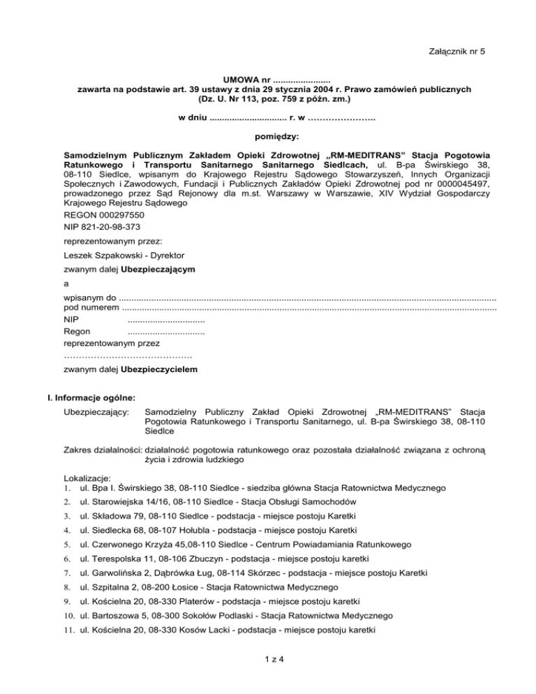 Załącznik nr 5 UMOWA nr ....................... zawarta na podstawie art. 39 ustawy z dnia 29 stycznia 2004 r. Prawo zamówień publicznych (Dz. U. Nr 113, poz. 759 z późn. zm.) w dniu ............................... r. w ………………….. pomiędzy: Samodzielnym Publicznym Zakładem Opieki Zdrowotnej „RM-MEDITRANS” Stacja Pogotowia Ratunkowego i Transportu Sanitarnego Sanitarnego Siedlcach, ul. B-pa Świrskiego 38, 08-110 Siedlce, wpisanym do Krajowego Rejestru Sądowego Stowarzyszeń, Innych Organizacji Społecznych i Zawodowych, Fundacji i Publicznych Zakładów Opieki Zdrowotnej pod nr 0000045497, prowadzonego przez Sąd Rejonowy dla m.st. Warszawy w Warszawie, XIV Wydział Gospodarczy Krajowego Rejestru Sądowego REGON 000297550 NIP 821-20-98-373 reprezentowanym przez: Leszek Szpakowski - Dyrektor zwanym dalej Ubezpieczającym a wpisanym do ....................................................................................................................................................... pod numerem ...................................................................................................................................................... NIP ............................... Regon ............................... reprezentowanym przez ……………………………………. zwanym dalej Ubezpieczycielem I. Informacje ogólne: Ubezpieczający: Samodzielny Publiczny Zakład Opieki Zdrowotnej „RM-MEDITRANS” Stacja Pogotowia Ratunkowego i Transportu Sanitarnego, ul. B-pa Świrskiego 38, 08-110 Siedlce Zakres działalności: działalność pogotowia ratunkowego oraz pozostała działalność związana z ochroną życia i zdrowia ludzkiego Lokalizacje: 1. ul. Bpa I. Świrskiego 38, 08-110 Siedlce - siedziba główna Stacja Ratownictwa Medycznego 2. ul. Starowiejska 14/16, 08-110 Siedlce - Stacja Obsługi Samochodów 3. ul. Składowa 79, 08-110 Siedlce - podstacja - miejsce postoju Karetki 4. ul. Siedlecka 68, 08-107 Hołubla - podstacja - miejsce postoju Karetki 5. ul. Czerwonego Krzyża 45,08-110 Siedlce - Centrum Powiadamiania Ratunkowego 6. ul. Terespolska 11, 08-106 Zbuczyn - podstacja - miejsce postoju karetki 7. ul. Garwolińska 2, Dąbrówka Ług, 08-114 Skórzec - podstacja - miejsce postoju Karetki 8. ul. Szpitalna 2, 08-200 Łosice - Stacja Ratownictwa Medycznego 9. ul. Kościelna 20, 08-330 Platerów - podstacja - miejsce postoju karetki 10. ul. Bartoszowa 5, 08-300 Sokołów Podlaski - Stacja Ratownictwa Medycznego 11. ul. Kościelna 20, 08-330 Kosów Lacki - podstacja - miejsce postoju karetki 1z4 12. ul. Szpitalna 37, 05-300 Mińsk Mazowiecki - Stacja Ratownictwa Medycznego 13. ul. Siedlecka 83, Żelków Kolonia, 08-110 Siedlce - wieża antenowa 14. 08-321 Sabnie - kontener na działce Urzędu Gminy nr działki 596/7 - wieża antenowa 15. Wieś Chotycze, 08-200 Łosice - wieża antenowa 16. ul. Szpitalna 37, 05-300 Mińsk Mazowiecki – Stacja Ratownictwa Medycznego 17. ul. Wojska Polskiego 20, 05-310 Kałuszyn – podstacja – miejsce postoju Karetki 18. ul. Warszawska 76,08-450 Łaskarzew – nr. działki:346/15- wieża antenowa 19. Słup Pierwszy, 08-412 Borowie – nr. działki:99/2 - wieża antenowa 20. Leśniki, 07-120 Korytnica – nr. działki:85/6 - wieża antenowa 21. ul. Szpitalna 37, 05-300 Mińsk Mazowiecki - wieża antenowa 22. Ostrówek Węgrowski, 07-130 Łochów - nr. działki:925/3 - wieża antenowa 23. ul. Staszica 18 08-400 Garwolin,– miejsce postoju karetki 24. ul. Mickiewicza 15 07-100 Węgrów,– miejsce postoju karetki 25. Al.Pokoju 73 07-130 Łochów,– miejsce postoju karetki 26. Gończyce 15 08-460 Sobolew,– miejsce postoju karetki II. Podstawa zawarcia umowy: Strony oświadczają, że zawierają niniejszą umowę w wyniku przeprowadzonego postępowania o udzielenie zamówienia publicznego w trybie przetargu nieograniczonego nr ……………..…..… na usługę ubezpieczenia w zakresie ubezpieczenia użytkowanego mienia oraz ubezpieczeń komunikacyjnych pojazdów będących w posiadaniu SP ZOZ „RM-MEDITRANS”, zgodnie z postanowieniami ustawy z dnia 29 stycznia 2004 r. Prawo zamówień publicznych ( Dz. U. z 2010 r. Nr 113, poz. 759 z późn. zm.), III. Treść umowy Postanowienia ogólne §1 1. W ramach niniejszej umowy strony zobowiązują się poprzez wspólne i zgodne działanie w dobrej wierze, stosując zasady dobrej praktyki oraz zachowując przepisy ustawy – Prawo zamówień publicznych z dnia 29.01.2004 r. (Dz. U. z 2010 r. Nr 113, poz. 759 z późn. zm.) dołożyć wszelkiej staranności niezbędnej przy wykonywaniu Umowy Ubezpieczenia. 2. W razie wystąpienia istotnej zmiany okoliczności powodującej, że wykonanie Umowy nie leży w interesie publicznym, czego nie można było przewidzieć w chwili zawarcia Umowy, Ubezpieczający może odstąpić od Umowy w terminie 30 dni od powzięcia wiadomości o tych okolicznościach. W takim wypadku Ubezpieczyciel może żądać opłaty składki ubezpieczeniowej jedynie z tytułu wykonania części umowy. Przedmiot i miejsce ubezpieczenia §2 1. Przedmiotem ubezpieczenia jest: 1.1. mienie stanowiące własność i/lub będące na podstawie pisemnych umów w posiadaniu Ubezpieczającego, 1.2. pojazdy wraz z wyposażeniem podstawowym oraz wyposażeniem dodatkowym podlegające, stosownie do przepisów ustawy „Prawo o ruchu drogowym”, rejestracji w RP, będące własnością lub w użytkowaniu Ubezpieczającego, 1.3. trwałe następstwa nieszczęśliwych wypadków kierowcy i pasażerów (z wyłączeniem ochrony pacjentów przewożonych powstałych akcji ratowniczych). 1.4. assistance. 2. Mienie objęte zostaje ubezpieczeniem w lokalizacjach podanych w pkt. I oraz zgodnie z klauzulą miejsca ubezpieczenia. 2z4 3. Poza postanowieniami szczególnymi niniejszej Umowy zakres ochrony ubezpieczeniowej określają ogólne warunki ubezpieczenia: 3.1. ………………………………………., stanowiące załącznik nr …., 3.2. ……………………