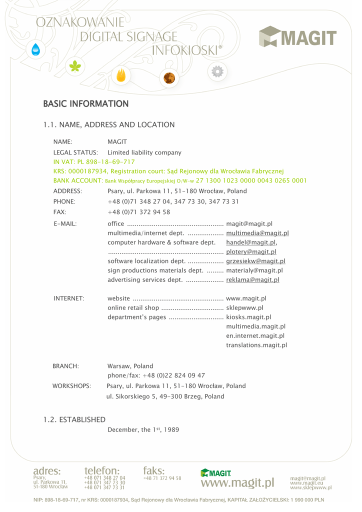 BASIC INFORMATION 1.1. NAME, ADDRESS AND LOCATION NAME: MAGIT LEGAL STATUS: Limited liability company IN VAT: PL 898-18-69-717 KRS: 0000187934, Registration court: Sąd Rejonowy dla Wrocławia Fabrycznej BANK ACCOUNT: Bank Współpracy Europejskiej O/W-w 27 1300 1023 0000 0043 0265 0001 ADDRESS: Psary, ul. Parkowa 11, 51-180 Wrocław, Poland PHONE: +48 (0)71 348 27 04, 347 73 30, 347 73 31 FAX: +48 (0)71 372 94 58 E-MAIL: office ................................................................ [email protected] [email protected] multimedia/internet dept. ................................ computer hardware & software dept. [email protected], [email protected] ................................................................ software localization dept. ................................ [email protected] [email protected] sign productions materials dept. ................................ advertising services dept. ................................ [email protected] INTERNET: website ................................................................ www.magit.pl sklepwww.pl online retail shop ............................................................. department’s pages ................................ kiosks.magit.pl multimedia.magit.pl en.internet.magit.pl translations.magit.pl BRANCH: Warsaw, Poland phone/fax: +48 (0)22 824 09 47 WORKSHOPS: Psary, ul. Parkowa 11, 51-180 Wrocław, Poland ul. Sikorskiego 5, 49-300 Brzeg, Poland 1.2. ESTABLISHED December, the 1st, 1989 1.3. OWNERS, BOARD OF DIRECTORS Arkadiusz Wadrzyk ............................... [email protected] [email protected] Grzegorz Wojcik ............................................................... Malgorzata Siarkiewicz ................................ [email protected] [email protected] Tomasz Beuch ................................................................ Mariusz Sojka ................................................................ [email protected] 1.4. EMPLOYMENT full-time: 58 people part-time: on project basis; designers, computer scientists, engineers specialized in different areas, translators, artists and others 1.5. EQUITY CAPITAL 500 000 EURO 1.6. TURNOVER year 2007 – 3 050 000 EURO 1.7. COMPANY HISTORY from 2002: dedicated 3D applications, 3D visualizations from 1999: Internet applications, interactive web publications and e-marketing, online shopping; multimedia kiosks & applications from 1998: multimedia applications (company presentations, catalogues) from 1995: software and WWW sites localization, technical & marketing translations from 1991: advertising services, the distribution of software and equipment for sign-making and large format printing from 1989: computer graphics, desktop publishing (DTP), signmaking COMPANY PROFILE 2.1. INFOKIOSKS, TOUCHSCREENS, DIGITAL SIGNAGE /www.kiosks.magit.pl, www.dotyk.magit.pl/ Multimedia/Internet kiosks; kiosk-oriented applications & software). Touchscreens, monitors, multimedia POS, LED screens, software… 2.2 MULTIMEDIA/INTERNET /www.multimedia.magit.pl / multimedia applications (company presentations, multimedia visit card, interactive catalogues, product database multimedia gifts and gadgets, corporate identity on CD, web publications (corporate and product websites, visualisations, animations, banners), Web applications (online shops and product catalogues, website content management systems, product customization tools, online CRM support), corporate movies, e-marketing (media planning, web marketing campaigns, customer loyalty programmes, events, site-sponsoring), dedicated 3D applications, 3D visualizations 2.3. ADVERTISING SERVICES /www.sign.magit.pl/ Production, distribution, the import of visual advertising forms, publishing services, visual information systems. Full service advertising, trade fairs, POS, BTL. 2.4. SOFTWARE LOCALIZATION & TRANSLATIONS FOR IT INDUSTRY /www.translations.magit.pl/ Software and WWW sites localization, technical translations, translation of product information, marketing materials & advertisements. Our main clients are: Corel Corp., Microsoft, 3COM, Lotus, Sybase, Dell, Hewlett Packard, 3M. 2.5. COMPUTER HARDWARE AND SOFTWARE /www.plotery.magit.pl, www.oprogramowanie.magit.pl/ Graphics software, DTP, CAS (Computer Aided Signmaking) software products, touch screens and plotter distribution. Also technical support of Corel products. MAGIT has an extensive network of dealers all over Poland. OUR CLIENTS (selected - from all Magit’s departments) • OSRAM 3COM • Generali T.U. • Getrankeservice Heidrich • PKO BP GMBH • Polifarb Cieszyn-Wrocław • • 3M • 4 YOU • ABB Centrum • Gilette • Poltegor Projekt • Akademia Ekonomiczna im. • GOTCHA! Promotional • Polskie Towarzystwo Oskara Langego Finansowe Suport • AIESEC Polska • HELIOS Centrum Filmowe • Polsat Cyfrowy • AIG Market Service • HDP Electronics • PPTFP Pionier • Allianz T.U. • Hewlett Packard • Procter & Gamble • Almi Decor • H&K Werbetechnik • Pruszyński • American Restaurants • House of Ford • PTE Norwich Union • American Trading Company • Hala Ludowa • PZU • Art Styl • ICL • Saint Gobain Abrasives • Bank Handlowy • IMPEL Security • Samuelsons • Bank Millenium • Indiana • Sanitec KOŁO ] • Bank Przemysłowo-Handlowy • ING Bank Śląski • Sconto Meble • Bank Śląski • ING Nationale Nederlander • SKANSKA • Brugman • Intel • SMYK Sp. z o.o. • CitiFinancial Bank • Inter IKEA Centre Polska • Softbank • Cadbury-Wedel • Jazz Office • SPHINX • COLGATE – PALMOLIVE • JTT Computers • Sudzucker • Canon • J.W. Construction Holding • Telekomunikacja Polska • Coca-Cola West Poland • Kazar • Telewizja Polska o/Wrocław • Comarch • Klaren Notebook • TESCO Polska • Commercial Union • KFC, Pizza Hut • TETA • Corel Corporation • Kredyt Bank • Tequilla Polska • Daimlerchrysler Automotive • Krajowe Towarzystwo • Towarzystwo Finansowo- Finanso