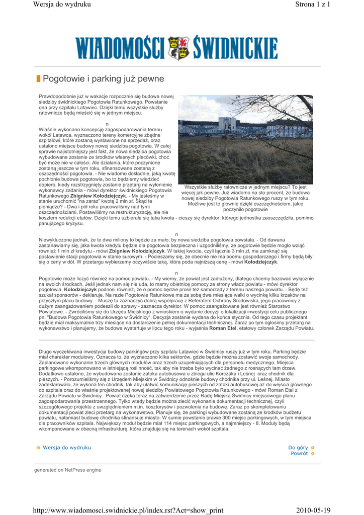 Wersja do wydruku Strona 1 z 1 Pogotowie i parking juŜ pewne Prawdopodobnie juŜ w wakacje rozpocznie się budowa nowej siedziby świdnickiego Pogotowia Ratunkowego. Powstanie ona przy szpitalu Latawiec. Dzięki temu wszystkie słuŜby ratownicze będą mieścić się w jednym miejscu. n Właśnie wykonano koncepcję zagospodarowania terenu wokół Latawca, wyznaczono tereny komercyjne zbędne szpitalowi, które zostaną wystawione na sprzedaŜ, oraz ustalono miejsce budowy nowej siedziba pogotowia. W całej sprawie najistotniejszy jest fakt, Ŝe nowa siedziba pogotowia wybudowana zostanie ze środków własnych placówki, choć być moŜe nie w całości. Ale działania, które poczynione zostaną jeszcze w tym roku, sfinansowane zostaną z oszczędności pogotowia. - Nie wiadomo dokładnie, jaką kwotę pochłonie budowa pogotowia, bo to będziemy wiedzieć dopiero, kiedy rozstrzygnięty zostanie przetarg na wyłonienie Wszystkie słuŜby ratownicze w jednym miejscu? To jest wykonawcy zadania - mówi dyrektor świdnickiego Pogotowia więcej jak pewne. JuŜ wiadomo na sto procent, Ŝe budowa Ratunkowego Zbigniew Kołodziejczyk. - My jesteśmy w nowej siedziby Pogotowia Ratunkowego ruszy w tym roku. stanie uruchomić "na zaraz" kwotę 2 mln zł. Skąd te MoŜliwe jest to głównie dzięki oszczędnościom, jakie pieniądze? - Dwa i pół roku pracowaliśmy nad tymi poczyniło pogotowie oszczędnościami. Postawiliśmy na restrukturyzację, ale nie kosztem redukcji etatów. Dzięki temu uzbierała się taka kwota - cieszy się dyrektor, którego jednostka zaoszczędziła, pomimo panującego kryzysu. n Niewykluczone jednak, Ŝe te dwa miliony to będzie za mało, by nowa siedziba pogotowia powstała. - Od dawana zastanawiamy się, jaka kwota kredytu będzie dla pogotowia bezpieczna i uzgodniliśmy, Ŝe pogotowie będzie mogło wziąć równieŜ 1 mln zł kredytu - mówi Zbigniew Kołodziejczyk. W takiej kwocie, czyli łącznie 3 mln zł, ma zamknąć się postawienie stacji pogotowia w stanie surowym. - Pocieszamy się, Ŝe obecnie nie ma boomu gospodarczego i firmy będą biły się o ceny w dół. W przetargu wybierzemy oczywiście taką, która poda najniŜszą cenę - mówi Kołodziejczyk. n Pogotowie moŜe liczyć równieŜ na pomoc powiatu. - My wiemy, Ŝe powiat jest zadłuŜony, dlatego chcemy bazować wyłącznie na swoich środkach. Jeśli jednak nam się nie uda, to mamy obietnicę pomocy ze strony władz powiatu - mówi dyrektor pogotowia. Kołodziejczyk podnosi równieŜ, Ŝe o pomoc będzie prosił teŜ samorządy z terenu naszego powiatu. - Będę teŜ szukał sponsorów - deklaruje. Na razie Pogotowie Ratunkowe ma za sobą dwa miesiące walki o wycinkę kilku krzaków na przyszłym placu budowy. - Muszę tu zaznaczyć dobrą współpracę z Referatem Ochrony Środowiska, jego pracownicy z duŜym zaangaŜowaniem podeszli do sprawy - zaznacza dyrektor. W pomoc zaangaŜowane jest równieŜ Starostwo Powiatowe. - Zwróciliśmy się do Urzędu Miejskiego z wnioskiem o wydanie decyzji o lokalizacji inwestycji celu publicznego pn. "Budowa Pogotowia Ratunkowego w Świdnicy". Decyzja zostanie wydana do końca stycznia. Od tego czasu projektant będzie miał maksymalnie trzy miesiące na dostarczenie pełnej dokumentacji technicznej. Zaraz po tym ogłosimy przetarg na wykonawstwo i planujemy, Ŝe budowa wystartuje w lipcu tego roku - wyjaśnia Roman Etel, etatowy członek Zarządu Powiatu. Długo wyczekiwana inwestycja budowy parkingów przy szpitalu Latawiec w Świdnicy ruszy juŜ w tym roku. Parking będzie miał charakter modułowy. Oznacza to, Ŝe wyznaczono kilka sektorów, gdzie będzie moŜna zostawić swoje samochody. Zaplanowano wykonanie trzech głównych modułów oraz trzech uzupełniających dla personelu medycznego. Miejsca parkingowe wkomponowano w istniejącą roślinność, tak aby nie trzeba było wycinać Ŝadnego z rosnących tam drzew. Dodatkowo ustalono, Ŝe wybudowana zostanie zatoka autobusowa u zbiegu ulic Korczaka i Leśnej oraz chodnik dla pieszych. - Porozumieliśmy się z Urzędem Miejskim w Świdnicy odnośnie budowy chodnika przy ul. Leśnej. Miasto zadeklarowało, Ŝe wykona ten chodnik, tak aby ułatwić komunikację pieszych od zatoki autobusowej aŜ do wejścia głównego do szpitala oraz do właśnie projektowanej nowej siedziby Powiatowego Pogotowia Ratunkowego - mówi Roman Etel z Zarządu Powiatu w Świdnicy. Powiat czeka teraz na zatwierdzenie przez Radę Miejską Świdnicy miejscowego planu zagospodarowania przestrzennego. Tylko wtedy będzie moŜna zlecić wykonanie dokumentacji technicznej, czyli szczegółowego projektu z uwzględnieniem m.in. kosztorysów i pozwolenia na budowę. Zaraz po skompletowaniu dokumentacji powiat zleci przetarg na wykonawstwo. Planuje się, Ŝe parkingi wybudowane zostaną ze środków budŜetu powiatu, natomiast budowę chodnika sfinansuje miasto. W sumie powstanie prawie 300 miejsc parkingowych, w tym miejsca dla pracowników szpitala. Największy moduł będzie miał 114 miejsc parkingowych, a najmniejszy - 8. Moduły będą wkomponowane w obecną infrastrukturę, która znajduje się na terenach wokół szpitala. Wersja do wydruku Do góry Powrót generated on NetPress engine http://www.wiadomosci.swidnickie.pl/index.rst?Act=show_print 2010-05-19