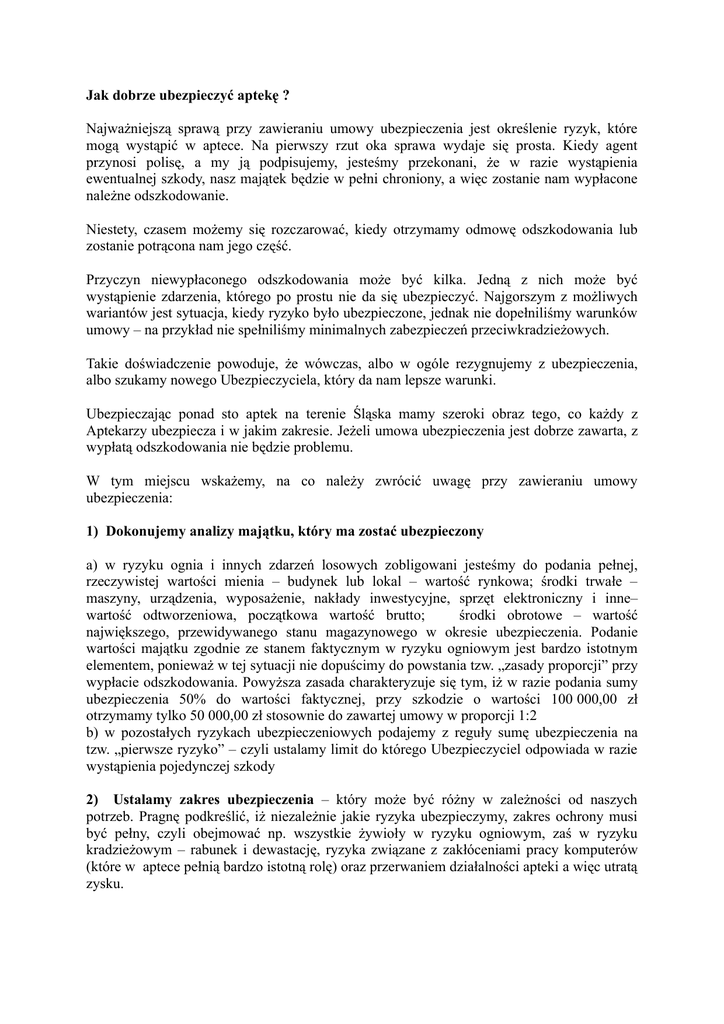 Jak dobrze ubezpieczyć aptekę ? Najważniejszą sprawą przy zawieraniu umowy ubezpieczenia jest określenie ryzyk, które mogą wystąpić w aptece. Na pierwszy rzut oka sprawa wydaje się prosta. Kiedy agent przynosi polisę, a my ją podpisujemy, jesteśmy przekonani, że w razie wystąpienia ewentualnej szkody, nasz majątek będzie w pełni chroniony, a więc zostanie nam wypłacone należne odszkodowanie. Niestety, czasem możemy się rozczarować, kiedy otrzymamy odmowę odszkodowania lub zostanie potrącona nam jego część. Przyczyn niewypłaconego odszkodowania może być kilka. Jedną z nich może być wystąpienie zdarzenia, którego po prostu nie da się ubezpieczyć. Najgorszym z możliwych wariantów jest sytuacja, kiedy ryzyko było ubezpieczone, jednak nie dopełniliśmy warunków umowy – na przykład nie spełniliśmy minimalnych zabezpieczeń przeciwkradzieżowych. Takie doświadczenie powoduje, że wówczas, albo w ogóle rezygnujemy z ubezpieczenia, albo szukamy nowego Ubezpieczyciela, który da nam lepsze warunki. Ubezpieczając ponad sto aptek na terenie Śląska mamy szeroki obraz tego, co każdy z Aptekarzy ubezpiecza i w jakim zakresie. Jeżeli umowa ubezpieczenia jest dobrze zawarta, z wypłatą odszkodowania nie będzie problemu. W tym miejscu wskażemy, na co należy zwrócić uwagę przy zawieraniu umowy ubezpieczenia: 1) Dokonujemy analizy majątku, który ma zostać ubezpieczony a) w ryzyku ognia i innych zdarzeń losowych zobligowani jesteśmy do podania pełnej, rzeczywistej wartości mienia – budynek lub lokal – wartość rynkowa; środki trwałe – maszyny, urządzenia, wyposażenie, nakłady inwestycyjne, sprzęt elektroniczny i inne– wartość odtworzeniowa, początkowa wartość brutto; środki obrotowe – wartość największego, przewidywanego stanu magazynowego w okresie ubezpieczenia. Podanie wartości majątku zgodnie ze stanem faktycznym w ryzyku ogniowym jest bardzo istotnym elementem, ponieważ w tej sytuacji nie dopuścimy do powstania tzw. „zasady proporcji” przy wypłacie odszkodowania. Powyższa zasada charakteryzuje się tym, iż w razie podania sumy ubezpieczenia 50% do wartości faktycznej, przy szkodzie o wartości 100 000,00 zł otrzymamy tylko 50 000,00 zł stosownie do zawartej umowy w proporcji 1:2 b) w pozostałych ryzykach ubezpieczeniowych podajemy z reguły sumę ubezpieczenia na tzw. „pierwsze ryzyko” – czyli ustalamy limit do którego Ubezpieczyciel odpowiada w razie wystąpienia pojedynczej szkody 2) Ustalamy zakres ubezpieczenia – który może być różny w zależności od naszych potrzeb. Pragnę podkreślić, iż niezależnie jakie ryzyka ubezpieczymy, zakres ochrony musi być pełny, czyli obejmować np. wszystkie żywioły w ryzyku ogniowym, zaś w ryzyku kradzieżowym – rabunek i dewastację, ryzyka związane z zakłóceniami pracy komputerów (które w aptece pełnią bardzo istotną rolę) oraz przerwaniem działalności apteki a więc utratą zysku. 3) Znosimy wszystkie udziały własne i maksymalnie redukujemy franszyzy redukcyjne i integralne – chodzi o to, aby w razie szkody nie mieć udziału w szkodzie albo żeby był on minimalny. Często Ubezpieczyciele ustalają franszyzę integralną na minimalnym poziomie np. 200zł, co oznacza, że szkody do tej kwoty nie będą wypłacane, zaś jeżeli szkoda przekroczy tę sumę, wówczas otrzymamy pełną wartość odszkodowania bez żadnych potrąceń. 4) Zwracamy uwagę na zabezpieczenia minimalne - aby ubezpieczyć majątek apteki, musimy spełnić wymóg posiadania zabezpieczeń ogniowych (np. gaśnice) oraz przeciwkradzieżowych. Wystarczy jedno, ale musi ono spełniać określone standardy narzucone przez Towarzystwo Ubezpieczeń, co oczywiście jest określone w OWU. Mam tu na myśli – alarm lokalny, monitoring, kraty we wszystkich otworach okiennych i drzwiowych, szyby min. P3 i inne. Jeżeli posiadamy więcej niż jedno zabezpieczenie, Ubezpieczyciel naliczy nam dodatkową zniżkę. Jednak jeżeli nie spełnimy minimalnego wymogu – Towarzystwo ma prawo odmówić wypłaty odszkodowania. 5) Zwracamy uwagę na klasę palności budynku - w którym jest prowadzona działalność – jeżeli zgodnie z warunkami ubezpieczenia nasz lokal zalicza się do II klasy palności, wówczas musi być doliczona zwyżka w składce. W innym wypadku może zostać potrącone odszkodowanie. 6) Ryzyko odpowiedzialności cywilnej - z tytułu prowadzenia działalności, posiadanego mienia oraz wykonywania zawodu farmaceuty – zakres ochrony musi być na tyle pełny, ale w całości chronić właściciela apteki i jej kierownika przed roszczeniami osób trzecich, w tym pacjentów oraz pracowników i ewentualnie najemcy lokalu (ten temat jest szeroko opisany na Państwa stronie internetowej). Reasumując, aby apteka była dobrze ubezpieczona i abyście Państwo mogli spać spokojnie, najlepiej kwestię ubezpieczenia powierzyć fachowcom w tej branży, którzy rzetelnie podejdą to tego tematu. Po dokonaniu analizy majątku apteki, następnie wyszukanie najlepszej oferty na rynku przez niezależnego doradcę, mają Państwo gwarancję posiadania solidnego i pewnego programu ubezpieczeniowego. Nasza firma od wielu lat specjalizuje się w ubezpieczeniach aptek, obsługując ich ponad sto na terenie naszego regionu. Jeżeli chcieliby Państwo zasięgnąć wiedzy w zakresie swojej polisy, a mam tu na myśli zasadność i prawidłowość zawartej umowy, jesteśmy do Państwa dyspozycji. W każdej chwili gotowi jesteśmy Państwu pomóc stworzyć optymalny program ubezpieczenia, celem uzyskania najlepszego ubezpieczenia przy relatywnie niskiej składce. Aptekarze, którzy powierzyli nam swoje ubezpieczenia, wiedzą, że zawsze mogą nas liczyć – od momentu przygotowania oferty i zawarcia umowy ubezpieczenia, poprzez informowanie o zmianach na rynku ubezpieczeń aż likwidacji ewentualnej szkody. Naszym atutem jest również to, że współpracujemy z wiel