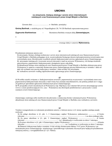 UMOWA na utrzymanie, bieżącą obsługę i serwis stron internetowych należących oraz finansowanych przez Urząd Miejski w Barlinku Zawarta dnia .................................. w Barlinku pomiędzy: Gminą Barlinek, z siedzibą przy ul. Niepodległości 20, 74-320 Barlinek reprezentowaną przez: Zygmunta Siarkiewicza – Burmistrza Barlinka zwanym dalej Zamawiającym, a .............................................................................................................................................. ................................................................................... zwanego dalej w umowie Wykonawcą. §1 Przedmiotem niniejszej umowy jest: 1) utrzymanie, bieżąca obsługa techniczna i serwis stron internetowych należących oraz finansowanych przez Urząd Miejski w Barlinku polegające m.in. na prowadzeniu bieżącego dozoru nad poprawnością wczytywania oraz wyświetlania stron, likwidowaniu wszelkich usterek funkcjonowania serwisu zgłaszanych przez Zamawiającego, 2) utrzymanie istniejących i tworzenie nowych skrzynek e-mail na serwerze Wykonawcy, ich bieżąca kontrola: antywirusowa, poprawności funkcjonowania, dostępności przez całą dobę, 3) aktualizacja bieżąca stron należących oraz finansowanych przez Urząd Miejski w Barlinku dokonywana przez Wykonawcę w oparciu o materiały dostarczane przez Zamawiającego pocztą elektroniczną w terminie 1 dnia od daty ich wysłania oraz pocztą tradycyjną w terminie 1 dnia od daty ich otrzymania, 4) rozbudowa serwisów według zapotrzebowania zgłoszonego przez Zamawiającego, §2 1) Wszelkie usterki związane z: funkcjonowaniem serwisów, poprawnością wczytywania i wyświetlania stron oraz poprawnością funkcjonowania skrzynek e-mail winny być usunięte natychmiastowo, nie później jednak niż w ciągu 24 godzin po uprzednim zgłoszeniu telefonicznym przez Zamawiającego. 2) W przypadku awarii niezależnych od Wykonawcy (np. błąd łączy sieci internet lub serwera utrzymującego serwis www) o czasie przekraczającym ww. czas – Wykonawca ma obowiązek poinformować o przyczynie i czasie usunięcia awarii Zamawiającego. §3 Zamawiający zastrzega sobie możliwość decydowania o ostatecznej formie wykonanych przez Wykonawcę aktualizacji stron należących oraz finansowanych przez Urząd Miejski w Barlinku oraz rozbudowy serwisów. §4 Tytułem wynagrodzenia za wykonanie przedmiotu umowy, o którym mowa w §1 strony zgodnie ustalają zasady rozliczeń: 1) Za usługi określone w §1, pkt. 1, 2 Zamawiający zapłaci Wykonawcy jednorazowo ................ zł brutto (słownie: .............................................................................................................................. ) za okres jednego roku. 2) Za prace określone w §1, pkt. 3 Zamawiający zapłaci Wykonawcy ................................... zł brutto (słownie: ....................................................................... za 1 aktualizację w rozliczeniu za okres 1 miesiąca. 3) Za prace określone w §1, pkt. 4 Zamawiający zapłaci Wykonawcy ......................................................... zł brutto (słownie: .................................................................................... za 1 rozbudowę w rozliczeniu za okres 1 miesiąca. 4) Płatności dokonywane będą w terminie 14 dni od daty dostarczenia faktury VAT przez Wykonawcę i po stwierdzeniu przez Zamawiającego terminowego i prawidłowego wykonania zleconych prac będących przedmiotem niniejszej umowy, z uwzględnieniem §2 i §3. Faktury §5 W przypadku niewywiązywania się z §1 i nie stosowania się do §2 i §3 niniejszej umowy Zleceniodawca ma prawo do pomniejszenia miesięcznego wynagrodzenia Wykonawcy określonego §4, pkt. 2 i pkt. 3 w wysokości 10%. §6 Przy przekroczeniu terminów wykonywania prac z §1, pkt 3 i nie stosowania się do §2 niniejszej umowy Zamawiający ma prawo naliczenia Wykonawcy kary umownej w wysokości 25 zł za każdy dzień zwłoki, licząc od następnego dnia po upływie określonego terminu. §7 Informacje Zamawiającego przesyłane przez sieć podlegają zwykłej ochronie. Wykonawca ponosi odpowiedzialność za nieuprawniony dostęp do informacji osób trzecich, o ile dostęp ten wynikał z zaniedbania przez wykonawcę funkcjonowania systemu kontroli technologicznej i organizacyjnej. §8 Umowę zawarto na czas od ............................................................. do ........................................................................... §9 Zleceniodawca może wypowiedzieć umowę ze skutkiem natychmiastowym jeżeli Wykonawca nie będzie przestrzegał postanowień niniejszej umowy. §10 W przypadku rozwiązania umowy przez Zleceniodawcę ze skutkiem natychmiastowym, Wykonawca zobowiązany jest do zwrotu wynagrodzenia, o którym mowa w §4 pkt 1 proporcjonalnie do czasu na jaki umowa została zawarta a nie została wykorzystana. §11 Po upływie terminu, na który umowa została zawarta określonym w §8 lub w przypadku wypowiedzenia umowy na podstawie §9 lub zakończenia umowy w inny sposób nieuregulowany niniejszą umową Wykonawca zobowiązany jest dostarczyć na nośniku DVD kopie witryn z zachowaniem struktury folderów charakterystycznej dla systemu Joomla! oraz kopie baz danych poszczególnych witryn. §12 W sprawach nieuregulowanych postanowieniami niniejszej Umowy stosuje się przepisy Kodeksu Cywilnego. §13 Wszelkie zmiany i uzupełnienia tej umowy wymagają dla swej ważności formy pisemnej. §14 Ewentualne spory mogące powstać na tle wykonania niniejszej Umowy strony poddają rozstrzygnięciu właściwego rzeczowo Sądu Powszechnego. § 15 Umowę sporządzono w dwóch jednobrzmiących egzemplarzach, po jednym dla każdej ze stron. Zamawiający Wykonawca