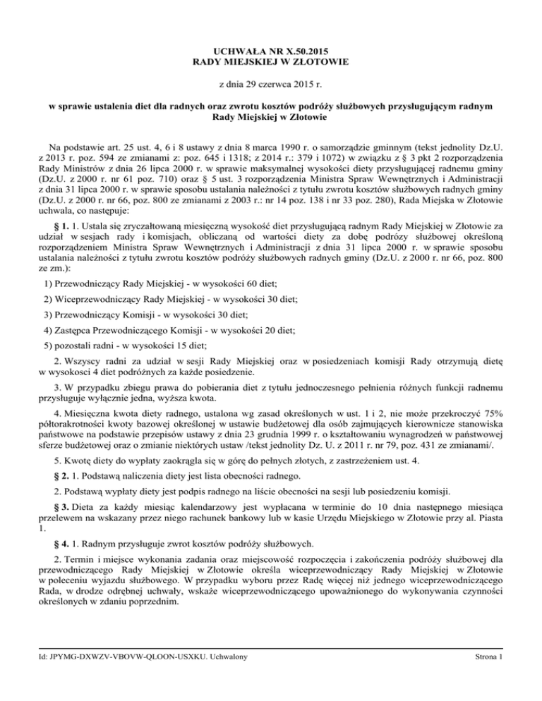 UCHWAŁA NR X.50.2015 RADY MIEJSKIEJ W ZŁOTOWIE z dnia 29 czerwca 2015 r. w sprawie ustalenia diet dla radnych oraz zwrotu kosztów podróży służbowych przysługującym radnym Rady Miejskiej w Złotowie Na podstawie art. 25 ust. 4, 6 i 8 ustawy z dnia 8 marca 1990 r. o samorządzie gminnym (tekst jednolity Dz.U. z 2013 r. poz. 594 ze zmianami z: poz. 645 i 1318; z 2014 r.: 379 i 1072) w związku z § 3 pkt 2 rozporządzenia Rady Ministrów z dnia 26 lipca 2000 r. w sprawie maksymalnej wysokości diety przysługującej radnemu gminy (Dz.U. z 2000 r. nr 61 poz. 710) oraz § 5 ust. 3 rozporządzenia Ministra Spraw Wewnętrznych i Administracji z dnia 31 lipca 2000 r. w sprawie sposobu ustalania należności z tytułu zwrotu kosztów służbowych radnych gminy (Dz.U. z 2000 r. nr 66, poz. 800 ze zmianami z 2003 r.: nr 14 poz. 138 i nr 33 poz. 280), Rada Miejska w Złotowie uchwala, co następuje: § 1. 1. Ustala się zryczałtowaną miesięczną wysokość diet przysługującą radnym Rady Miejskiej w Złotowie za udział w sesjach rady i komisjach, obliczaną od wartości diety za dobę podrózy służbowej określoną rozporządzeniem Ministra Spraw Wewnętrznych i Administracji z dnia 31 lipca 2000 r. w sprawie sposobu ustalania należności z tytułu zwrotu kosztów podróży służbowych radnych gminy (Dz.U. z 2000 r. nr 66, poz. 800 ze zm.): 1) Przewodniczący Rady Miejskiej - w wysokości 60 diet; 2) Wiceprzewodniczący Rady Miejskiej - w wysokości 30 diet; 3) Przewodniczący Komisji - w wysokości 30 diet; 4) Zastępca Przewodniczącego Komisji - w wysokości 20 diet; 5) pozostali radni - w wysokości 15 diet; 2. Wszyscy radni za udział w sesji Rady Miejskiej oraz w posiedzeniach komisji Rady otrzymują dietę w wysokosci 4 diet podróżnych za każde posiedzenie. 3. W przypadku zbiegu prawa do pobierania diet z tytułu jednoczesnego pełnienia różnych funkcji radnemu przysługuje wyłącznie jedna, wyższa kwota. 4. Miesięczna kwota diety radnego, ustalona wg zasad określonych w ust. 1 i 2, nie może przekroczyć 75% półtorakrotności kwoty bazowej określonej w ustawie budżetowej dla osób zajmujących kierownicze stanowiska państwowe na podstawie przepisów ustawy z dnia 23 grudnia 1999 r. o kształtowaniu wynagrodzeń w państwowej sferze budżetowej oraz o zmianie niektórych ustaw /tekst jednolity Dz. U. z 2011 r. nr 79, poz. 431 ze zmianami/. 5. Kwotę diety do wypłaty zaokrągla się w górę do pełnych złotych, z zastrzeżeniem ust. 4. § 2. 1. Podstawą naliczenia diety jest lista obecności radnego. 2. Podstawą wypłaty diety jest podpis radnego na liście obecności na sesji lub posiedzeniu komisji. § 3. Dieta za każdy miesiąc kalendarzowy jest wypłacana w terminie do 10 dnia następnego miesiąca przelewem na wskazany przez niego rachunek bankowy lub w kasie Urzędu Miejskiego w Złotowie przy al. Piasta 1. § 4. 1. Radnym przysługuje zwrot kosztów podróży służbowych. 2. Termin i miejsce wykonania zadania oraz miejscowość rozpoczęcia i zakończenia podróży służbowej dla przewodniczącego Rady Miejskiej w Złotowie określa wiceprzewodniczący Rady Miejskiej w Złotowie w poleceniu wyjazdu służbowego. W przypadku wyboru przez Radę więcej niż jednego wiceprzewodniczącego Rada, w drodze odrębnej uchwały, wskaże wiceprzewodniczącego upoważnionego do wykonywania czynności określonych w zdaniu poprzednim. Id: JPYMG-DXWZV-VBOVW-QLOON-USXKU. Uchwalony Strona 1 3. Sposób ustalania należności przysługujących radnym Rady Miejskiej w Złotowie z tytułu podróży służbowych określa rozporządzenie Ministra Spraw Wewnętrznych i Administracji z dnia 31 lipca 2000 r. w sprawie sposobu ustalania należności z tytułu zwrotu kosztów podróży służbowych radnych gminy (Dz.U. z 2000 r. nr 66, poz. 800 ze zmianami). 4. W przypadku podróży służbowej pojazdem samochodowym nie będącym własnością gminy radnemu przysługuje zwrot kosztów przejazdu według maksymalnych stawek za 1 kilometr przebiegu wskazanych w § 2 pkt 1 rozporządzenia Ministra Infrastruktury z dnia 25 marca 2002 r. w sprawie warunków ustalania oraz sposobu dokonywania zwrotu kosztów używania do celów służbowych samochodów osobowych, motocykli i motorowerów nie będących własnością pracodawcy (Dz.U. z 2002 r. nr 27, poz. 271 ze zmianami). § 5. Traci moc uchwała nr XIV/81/04 Rady Miejskiej w Złotowie z dnia 29 kwietnia 2004 r. w sprawie diet dla radnych. § 6. Wykonanie uchwały powierza się Burmistrzowi Miasta Złotowa. § 7. Uchwała wchodzi w życie z dniem podjęcia z mocą obowiązującą od dnia 1 lipca 2015 r. Przewodniczący Rady Miejskiej Krzysztof Żelichowski Id: JPYMG-DXWZV-VBOVW-QLOON-USXKU. Uchwalony Strona 2
