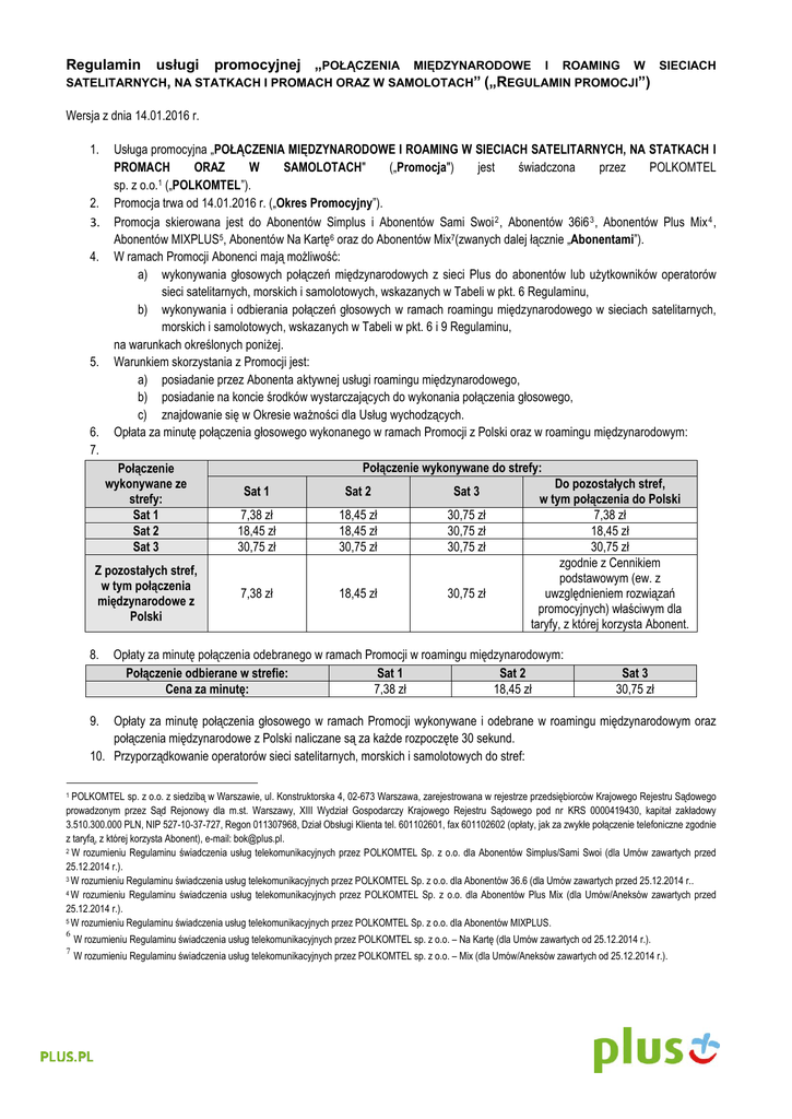 usługi promocyjnej „POŁĄCZENIA MIĘDZYNARODOWE I ROAMING W SIECIACH SATELITARNYCH, NA STATKACH I PROMACH ORAZ W SAMOLOTACH” („REGULAMIN PROMOCJI”) Regulamin Wersja z dnia 14.01.2016 r. 1. 2. 3. 4. 5. 6. 7. Usługa promocyjna „POŁĄCZENIA MIĘDZYNARODOWE I ROAMING W SIECIACH SATELITARNYCH, NA STATKACH I PROMACH ORAZ W SAMOLOTACH" („Promocja") jest świadczona przez POLKOMTEL sp. z o.o.1 („POLKOMTEL”). Promocja trwa od 14.01.2016 r. („Okres Promocyjny”). Promocja skierowana jest do Abonentów Simplus i Abonentów Sami Swoi 2 , Abonentów 36i6 3 , Abonentów Plus Mix 4 , Abonentów MIXPLUS5, Abonentów Na Kartę6 oraz do Abonentów Mix7(zwanych dalej łącznie „Abonentami”). W ramach Promocji Abonenci mają możliwość: a) wykonywania głosowych połączeń międzynarodowych z sieci Plus do abonentów lub użytkowników operatorów sieci satelitarnych, morskich i samolotowych, wskazanych w Tabeli w pkt. 6 Regulaminu, b) wykonywania i odbierania połączeń głosowych w ramach roamingu międzynarodowego w sieciach satelitarnych, morskich i samolotowych, wskazanych w Tabeli w pkt. 6 i 9 Regulaminu, na warunkach określonych poniżej. Warunkiem skorzystania z Promocji jest: a) posiadanie przez Abonenta aktywnej usługi roamingu międzynarodowego, b) posiadanie na koncie środków wystarczających do wykonania połączenia głosowego, c) znajdowanie się w Okresie ważności dla Usług wychodzących. Opłata za minutę połączenia głosowego wykonanego w ramach Promocji z Polski oraz w roamingu międzynarodowym: Połączenie wykonywane ze strefy: Sat 1 Sat 2 Sat 3 Z pozostałych stref, w tym połączenia międzynarodowe z Polski 8. Połączenie wykonywane do strefy: Sat 1 Sat 2 Sat 3 7,38 zł 18,45 zł 30,75 zł 18,45 zł 18,45 zł 30,75 zł 30,75 zł 30,75 zł 30,75 zł 7,38 zł 18,45 zł 30,75 zł Do pozostałych stref, w tym połączenia do Polski 7,38 zł 18,45 zł 30,75 zł zgodnie z Cennikiem podstawowym (ew. z uwzględnieniem rozwiązań promocyjnych) właściwym dla taryfy, z której korzysta Abonent. Opłaty za minutę połączenia odebranego w ramach Promocji w roamingu międzynarodowym: Połączenie odbierane w strefie: Sat 1 Sat 2 Cena za minutę: 7,38 zł 18,45 zł Sat 3 30,75 zł 9. Opłaty za minutę połączenia głosowego w ramach Promocji wykonywane i odebrane w roamingu międzynarodowym oraz połączenia międzynarodowe z Polski naliczane są za każde rozpoczęte 30 sekund. 10. Przyporządkowanie operatorów sieci satelitarnych, morskich i samolotowych do stref: POLKOMTEL sp. z o.o. z siedzibą w Warszawie, ul. Konstruktorska 4, 02-673 Warszawa, zarejestrowana w rejestrze przedsiębiorców Krajowego Rejestru Sądowego prowadzonym przez Sąd Rejonowy dla m.st. Warszawy, XIII Wydział Gospodarczy Krajowego Rejestru Sądowego pod nr KRS 0000419430, kapitał zakładowy 3.510.300.000 PLN, NIP 527-10-37-727, Regon 011307968, Dział Obsługi Klienta tel. 601102601, fax 601102602 (opłaty, jak za zwykłe połączenie telefoniczne zgodnie z taryfą, z której korzysta Abonent), e-mail: [email protected]. 2 W rozumieniu Regulaminu świadczenia usług telekomunikacyjnych przez POLKOMTEL Sp. z o.o. dla Abonentów Simplus/Sami Swoi (dla Umów zawartych przed 25.12.2014 r.). 3 W rozumieniu Regulaminu świadczenia usług telekomunikacyjnych przez POLKOMTEL Sp. z o.o. dla Abonentów 36.6 (dla Umów zawartych przed 25.12.2014 r.. 4 W rozumieniu Regulaminu świadczenia usług telekomunikacyjnych przez POLKOMTEL Sp. z o.o. dla Abonentów Plus Mix (dla Umów/Aneksów zawartych przed 25.12.2014 r.). 5 W rozumieniu Regulaminu świadczenia usług telekomunikacyjnych przez POLKOMTEL Sp. z o.o. dla Abonentów MIXPLUS. 1 6 W rozumieniu Regulaminu świadczenia usług telekomunikacyjnych przez POLKOMTEL sp. z o.o. – Na Kartę (dla Umów zawartych od 25.12.2014 r.). 7 W rozumieniu Regulaminu świadczenia usług telekomunikacyjnych przez POLKOMTEL sp. z o.o. – Mix (dla Umów/Aneksów zawartych od 25.12.2014 r.). Strefa: Sat 1 Sat 2 Sat 3 Nazwa sieci: Inmarsat, mini, M/M4 SNAC Inmarsat-B, Global fixed Inmarsat-BGAN Inmarsat-M SNAC Inmarsat-M, Global fixed OnAir Seanet Thuraya AT&T Australia Mobile SAT Global Region 881 Ellipso Global Region 881 Globalstar Global Region 881 Globalstar Global Region 881 Iridium Global Region 881 Iridium Global Region 882 Emsat Global Region 882 MCP ICO Maritime Service MCP OceanCell Thuraya - Global Networks TI Maritime Vodafone Malta Maritime (WINS) AeroMobile Inmarsat-B HSD Fixed Inmarsat-BGAN HSD Inmarsat-GAN, Global fixed Inmarsat-GAN, Global fixed 11. Promocja jest świadczona od 27 listopada 2013 r. do odwołania. Informacja o odwołaniu świadczenia Promocji zostanie podana przez POLKOMTEL do wiadomości publicznej ze stosownym wyprzedzeniem na stronie internetowej www.plus.pl. 12. Wszystkie podane w Regulaminie opłaty uwzględniają podatek VAT. 13. W kwestiach nieuregulowanych Regulaminem Promocji zastosowanie mają odpowiednio postanowienia Regulaminu świadczenia usług telekomunikacyjnych przez POLKOMTEL Sp. z o.o. dla Abonentów Simplus/Sami Swoi (dla Umów zawartych przed 25.12.2014 r.), Regulaminu świadczenia usług telekomunikacyjnych przez POLKOMTEL Sp. z o.o. dla Abonentów 36.6 (dla Umów zawartych przed 25.12.2014 r.), Regulaminu świadczenia usług telekomunikacyjnych przez POLKOMTEL Sp. z o.o. dla Abonentów Plus Mix (dla Umów/Aneksów zawartych przed 25.12.2014 r.), Regulaminu świadczenia usług telekomunikacyjnych przez POLKOMTEL Sp. z o.o. dla Abonentów MIXPLUS (dla Umów/Aneksów zawartych przed 25.12.2014 r.) albo Regulaminu świadczenia usług telekomunikacyjnych przez POLKOMTEL sp. z o.o. - Na Kartę (dla Umów zawartych od 25.12.2014 r.), Regulaminu świadczenia usług telekomunikacyjnych przez POLKOMTEL sp. z o.o. – Mix (dla Umów zawartych od 25.12.2014 r.) oraz Cennik taryfy, z której korzysta Abonent. 14. Regulamin Promocji, regulaminy świadczenia usług telekomunikacyjnych oraz cenniki są dostęp
