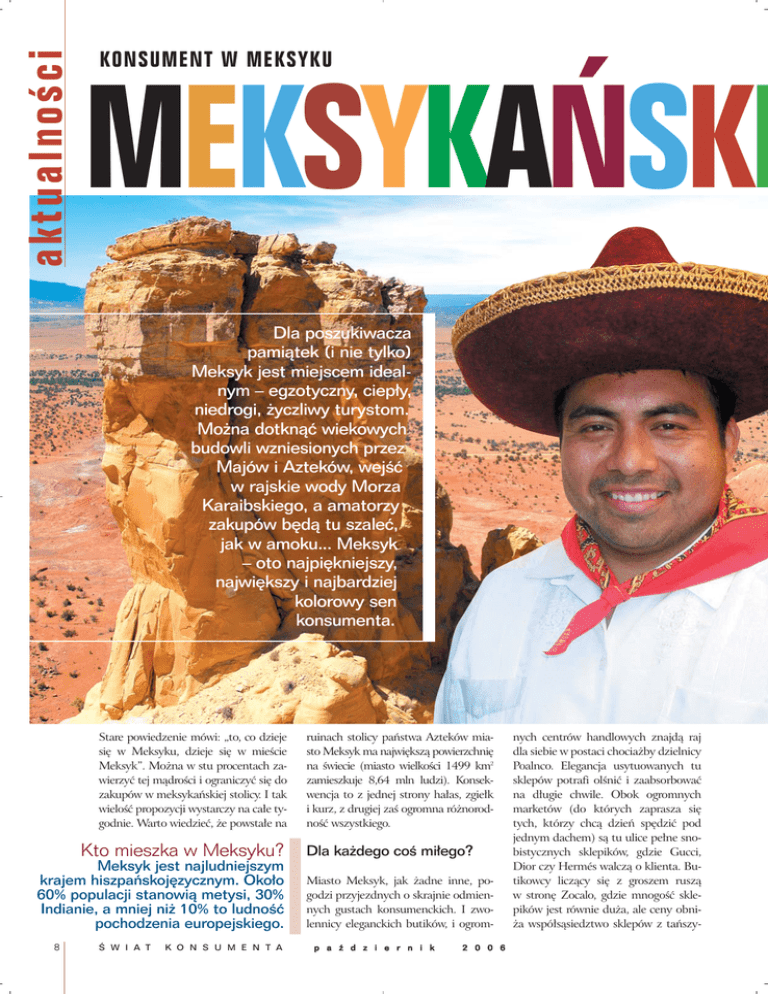 aktualnoÊci KONSUMENT W MEKSYKU MEKSYKA¡SKI Dla poszukiwacza pamiàtek (i nie tylko) Meksyk jest miejscem idealnym – egzotyczny, ciep∏y, niedrogi, ˝yczliwy turystom. Mo˝na dotknàç wiekowych budowli wzniesionych przez Majów i Azteków, wejÊç w rajskie wody Morza Karaibskiego, a amatorzy zakupów b´dà tu szaleç, jak w amoku... Meksyk – oto najpi´kniejszy, najwi´kszy i najbardziej kolorowy sen konsumenta. Stare powiedzenie mówi: „to, co dzieje si´ w Meksyku, dzieje si´ w mieÊcie Meksyk”. Mo˝na w stu procentach zawierzyç tej màdroÊci i ograniczyç si´ do zakupów w meksykaƒskiej stolicy. I tak wieloÊç propozycji wystarczy na ca∏e tygodnie. Warto wiedzieç, ˝e powsta∏e na Kto mieszka w Meksyku? Meksyk jest najludniejszym krajem hiszpaƒskoj´zycznym. Oko∏o 60% populacji stanowià metysi, 30% Indianie, a mniej ni˝ 10% to ludnoÊç pochodzenia europejskiego. 8  W I A T K O N S U M E N T A ruinach stolicy paƒstwa Azteków miasto Meksyk ma najwi´kszà powierzchni´ na Êwiecie (miasto wielkoÊci 1499 km2 zamieszkuje 8,64 mln ludzi). Konsekwencja to z jednej strony ha∏as, zgie∏k i kurz, z drugiej zaÊ ogromna ró˝norodnoÊç wszystkiego. Dla ka˝dego coÊ mi∏ego? Miasto Meksyk, jak ˝adne inne, pogodzi przyjezdnych o skrajnie odmiennych gustach konsumenckich. I zwolennicy eleganckich butików, i ogromp a ê d z i e r n i k 2 0 0 6 nych centrów handlowych znajdà raj dla siebie w postaci chocia˝by dzielnicy Poalnco. Elegancja usytuowanych tu sklepów potrafi olÊniç i zaabsorbowaç na d∏ugie chwile. Obok ogromnych marketów (do których zaprasza si´ tych, którzy chcà dzieƒ sp´dziç pod jednym dachem) sà tu ulice pe∏ne snobistycznych sklepików, gdzie Gucci, Dior czy Hermés walczà o klienta. Butikowcy liczàcy si´ z groszem ruszà w stron´ Zocalo, gdzie mnogoÊç sklepików jest równie du˝a, ale ceny obni˝a wspó∏sàsiedztwo sklepów z taƒszy- KIEEL DORADO mi produktami. Wprawne oko wypatrzy, co trzeba, a potargowaç si´ mo˝na. Zw∏aszcza w weekendy, kiedy to tradycyjnie ju˝ organizowane sà uliczne wyprzeda˝e wszystkiego. Cyganeria ruszy do Zona Rosa – tam nie tylko butiki, ale ogromna liczba galerii, muzeów, ulicznego handlu, kafejek i czego jeszcze dusza zapragnie. Tu powinien przyjÊç ka˝dy. JeÊli nie kupi, to pooddycha atmosferà bohemy. wschodu do zachodu s∏oƒca... Sprzedajà rzeczy nowe i starocie, oryginalne i powielane seryjnie byle co. JeÊli kupowanie na targach jest sztukà, to kupowanie na targu w Mexico City wÊród rozwrzeszczanej, nacierajàcej zewszàd na kupujàcego, wyspecjalizowanej w handlu gawiedzi, jest sztukà najwy˝szej klasy. I dlatego w∏aÊnie w Meksyku trzeba kupowaç na targach. A ci, którzy zainteresowani sà tylko tym, co najbardziej typowe dla danego kraju, ale równoczeÊnie najtaƒsze, „zaatakujà rynki”. Targi sà charakterystycznà cechà miasta. Od maleƒkich po ogromne, od sezonowych po ca∏oroczne, od kilkugodzinnych po takie od Co pija si´ w Meksyku? Tequila i mezcal sà znanymi na Êwiecie meksykaƒskimi aperitifami, otrzymywanymi z soku dwóch ró˝nych gatunków agawy. Tequila tak si´ ma do mezcalu, jak koniak do brandy – jest wyrafinowanym trunkiem koneserów. Obydwa otrzymuje si´ podobnie, ale tequil´ wolno produkowaç tylko w ÊciÊle okreÊlonym rejonie, którego oÊrodkiem jest miasto Tequila w pobli˝u Guadalajary.  W I A T K O N S U M E N T A p a ê d z i e r n i k 2 0 0 6 9 aktualnoÊci Co kupiç w Meksyku? Targ, panie targ Na targu mo˝na znaleêç wszystko, ale nie wszystko warto kupiç. I tak póêniej trzeba b´dzie jakoÊ to poupychaç i przewieêç martwiàc si´, czy dotrze ca∏e, czy si´ nie zniszczy, czy nie zabiorà. Dlatego nale˝a∏oby kupiç „jedynie”: coÊ z tkanin, coÊ z ceramiki, coÊ z bu˝uterii, coÊ z kamienia wulkanicznego, tequil´ i sombrero. I ewentualnie jakàÊ replik´ znaleziska archeologicznego (przedmiotów z wykopalisk archeologicznych wywoziç nie wolno!). Tkaniny Wzorzyste, wielo- lub jednokolorowe narzuty, chusty, spódnice, obrusy, kilimy, szale i bluzy, koszule, poncha i spodnie, dywaniki, chodniki… to duma Meksykan. I ich wizytówka. Zw∏aszcza charakterystyczne, szorstkie pasiaste, jaskrawe tkaniny. Ceny sà naprawd´ ró˝ne, w zale˝noÊci od tego, co i gdzie si´ kupuje, ale mo˝na nie wydaç wi´cej ni˝ 10-20 dolarów. Ceramika Talerze, misy i dzbany, których optymistyczne, ciep∏e kolory i sympatyczne kszta∏ty ka˝à zapomnieç, ˝e to tylko ceramika u˝ytkowa, te˝ chce si´ mieç. Takiego wzoru namalowanego na dzbanku nie znajdziemy nigdzie na Êwiecie. Ârenia cena: 5-10 dolarów. Bi˝uteria Z∏ota, srebrna lub miedziana, nadziewana kamieniami pó∏lub szlachetnymi nie by∏aby taka oryginalna, gdyby wzorów nie tworzyli Indianie. I przez to kszta∏ty te sà naprawd´ oryginalne i jedyne w swoim rodzaju. Pami´tajmy, by srebrnà bi˝uteri´ kupowaç ze stemplem „9” lub „925”. Mo˝na kupiç coÊ naprawd´ ∏adnego za 20 dolarów. Maska, sombrero i tequila JeÊli nie masz funduszy, miejsca ani ochoty na kupowanie, ale chcesz przywieêç z Meksyku to, co najbardziej meksykaƒskie, kup sobie sombrero do noszenia w sierpniowy polski upalny dzieƒ, tequil´ na polski listopadowy wieczór i ca∏osezonowà, kolorowà mask´ z kamienia wulkanicznego na... pamiàtk´. JeÊli chodzi o ceny, wszystko zale˝y od targujàcego si´: sombrero – od 5 do nawet 25, 30 dolarów; maska te˝ mniej wi´cej w tych granicach; trunek mo˝na nabyç za 12 dolarów (du˝a butelka – 750 ml) lub za 2 dolary (250 ml) w sklepie. Oaxaca, Puebla, Ciapas W okolice miasta Oaxaca, Puebla i Ciapas udaç powinni si´ konsumenci-koneserzy. Ci, którzy chcà kupowaç tanio, ale z samego êród∏a. Wtedy trzeba szukaç tubylców, Indian – handlarzy samotnie w∏óczàcych si´ po terenach stanowisk archeologicznych. Nie doÊç, ˝e kupuje si´ orygina∏ (np. podobizn´ bo˝ka azteckiego zrobionego z czarn