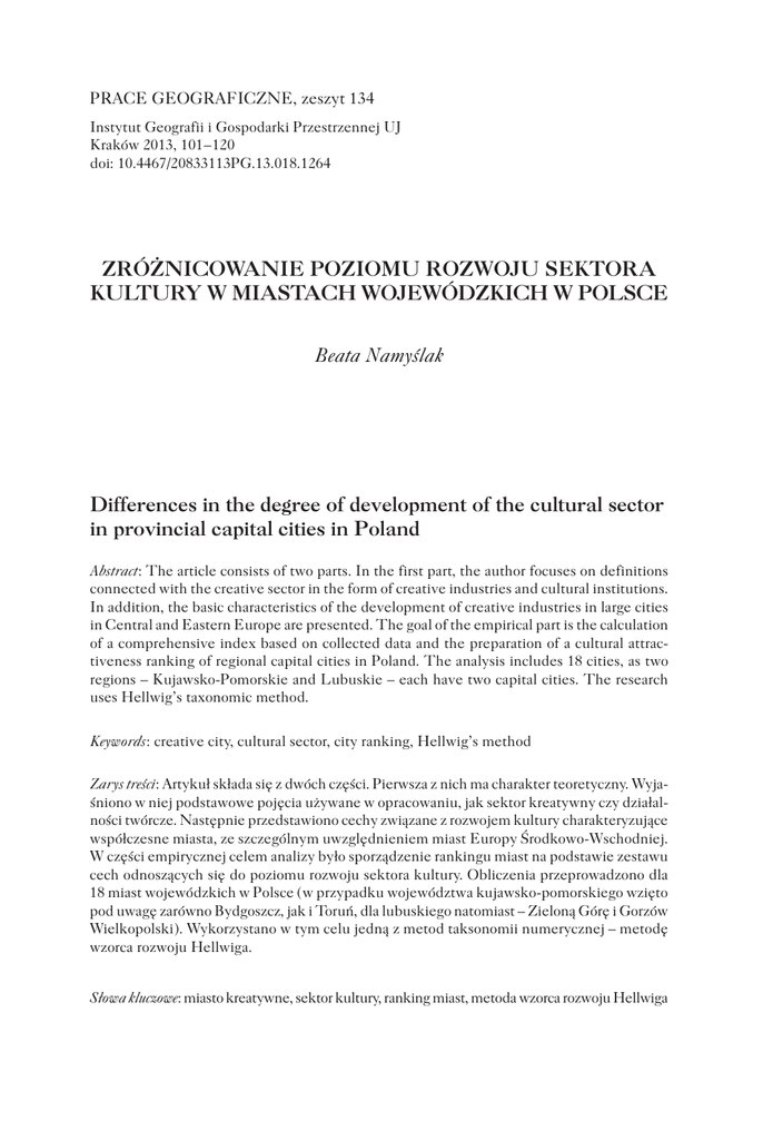 Prace Geograficzne, zeszyt 134 Instytut Geografii i Gospodarki Przestrzennej UJ Kraków 2013, 101 – 120 doi: 10.4467/20833113PG.13.018.1264 Zróżnicowanie poziomu rozwoju sektora kultury w miastach wojewódzkich w Polsce Beata Namyślak Differences in the degree of development of the cultural sector in provincial capital cities in Poland Abstract : The article consists of two parts. In the first part, the author focuses on definitions connected with the creative sector in the form of creative industries and cultural institutions. In addition, the basic characteristics of the development of creative industries in large cities in Central and Eastern Europe are presented. The goal of the empirical part is the calculation of a comprehensive index based on collected data and the preparation of a cultural attractiveness ranking of regional capital cities in Poland. The analysis includes 18 cities, as two regions – Kujawsko-Pomorskie and Lubuskie – each have two capital cities. The research uses Hellwig’s taxonomic method. Keywords : creative city, cultural sector, city ranking, Hellwig’s method Zarys treści : Artykuł składa się z dwóch części. Pierwsza z nich ma charakter teoretyczny. Wyjaśniono w niej podstawowe pojęcia używane w opracowaniu, jak sektor kreatywny czy działalności twórcze. Następnie przedstawiono cechy związane z rozwojem kultury charakteryzujące współczesne miasta, ze szczególnym uwzględnieniem miast Europy Środkowo-Wschodniej. W części empirycznej celem analizy było sporządzenie rankingu miast na podstawie zestawu cech odnoszących się do poziomu rozwoju sektora kultury. Obliczenia przeprowadzono dla 18 miast wojewódzkich w Polsce ( w przypadku województwa kujawsko-pomorskiego wzięto pod uwagę zarówno Bydgoszcz, jak i Toruń, dla lubuskiego natomiast – Zieloną Górę i Gorzów Wielkopolski ). Wykorzystano w tym celu jedną z metod taksonomii numerycznej – metodę wzorca rozwoju Hellwiga. Słowa kluczowe : miasto kreatywne, sektor kultury, ranking miast, metoda wzorca rozwoju Hellwiga 102 Prace Geograficzne, zeszyt 134 Wprowadzenie – wyjaśnienie podstawowych pojęć W literaturze przedmiotu za sektor kreatywny ( creative knowledge sector ) w gospodarce narodowej uważa się ten, na który składają się działalności oparte na własności intelektualnej, mające swe korzenie w kulturze i nauce. W sektorze tym wyróżnia się dwie podstawowe grupy : działalności twórcze ( creative industries ) oraz tzw. działalności o dużym stopniu nasycenia wiedzą ( knowledge intensive industries ) ( m.in. Throsby 2010; Stryjakiewicz, Stachowiak 2010 ). W różnych klasyfikacjach jest zauważalne, że lista rodzajów działalności zaliczanych do creative industries nie zawsze jest taka sama. Pod tym względem zestaw działalności o dużym stopniu nasycenia wiedzą nie budzi tyle kontrowersji i zazwyczaj wygląda bardzo podobnie ( produkcja i usługi w zakresie technologii informacyjno-komunikacyjnych ( I C T ), usługi finansowe, prawne i inne usługi dla biznesu, działalność badawczo-rozwojowa oraz szkolnictwo wyższe ). Badacze sektora kreatywnego najczęściej powołują się na opracowania brytyjskiego Departamentu Mediów, Kultury i Sportu ( D C M S ), zgodnie z którymi do działalności twórczych zalicza się te dziedziny, które oparte są na ludzkiej kreatywności, talencie i umiejętnościach, wytwarzają i wykorzystują własności intelektualne, jak również zawierają potencjał do tworzenia dobrobytu i przyczyniają się do tworzenia nowych miejsc pracy. Według D C M S do działalności twórczych zalicza się : reklamę, działalność wydawniczą, fotografię, architekturę, rynek sztuki i antyków, radio i telewizję, film i wideo, działalność muzyczną, wzornictwo i projektowanie ( graficzne, wnętrz, form przemysłowych, multimediów, mody ), działalność artystyczną i rozrywkową, rzemiosło artystyczne, działalność związaną z oprogramowaniem oraz gry wideo i gry komputerowe ( The Creative … 2001 ). Z takim podziałem zgadza się między innymi P. Hall ( 2000 ). Wspomniane różnice polegają na tym, że niektórzy badacze zaliczają do działalności twórczych jeszcze sport i rekreację ( spędzanie wolnego czasu ), np. L. Kong ( 2000 ), inni tylko działalność rekreacyjną, bez uwzględnienia sportu, m.in. T. Stryjakiewicz, K. Stachowiak ( 2010 ); D. Throsby ( 2010 ). Czasem zaliczana jest tu też turystyka kulturowa ( np. Framework … 2009 ). Jeśli za podstawowy wyznacznik kreatywności zostanie wybrana nowa jakość chroniona prawami autorskimi ( „ wartość dodana ” ), wówczas pomija się handel antykami ( np. Jankowska 2012 ) czy turystykę kulturową. Bywa też, że wyróżniona zostaje kategoria „ inne ” lub „ pozostałe ”, w której gromadzi się bardziej szczegółowe rodzaje działalności albo typy działalności związane z kilkoma kategoriami, jak np. tłumaczenia ( Smoleń 2003 ). Poza tym można zaobserwować zmiany nazw niektórych składowych, co w praktyce oznacza rozszerzenie lub zawężenie problemu, na przykład dziedzictwo kultury w miejsce architektury. W odniesieniu do wybranych typów działalności sektora kreatywnego stosowane są również inne pojęcia. Najczęściej spotykane to działalności związane są z kulturą Zróżnicowanie poziomu rozwoju sektora kultury w miastach ... 103 ( cultural industries ) 1. Termin ten ma nawet starszy rodowód niż creative industries 2.. Do sektora kultury zalicza się działalność prowadzoną przez muzea, galerie, biblioteki, a także rzemiosło, sztuki wizualne, film, radio, sztuki performatywne ( m.in. teatr, operę ) i literaturę. W literaturze niemieckojęzycznej określa się je jako gospodarkę kultury ( Kulturwirtschaft ). W pewnym stopniu zbieżne są one z działalnościami twórczymi. Jest jednak kilka różnic, które tkwią zarówno w kryterium identyfikacji, jak i w zakresie tych pojęć. Dzi