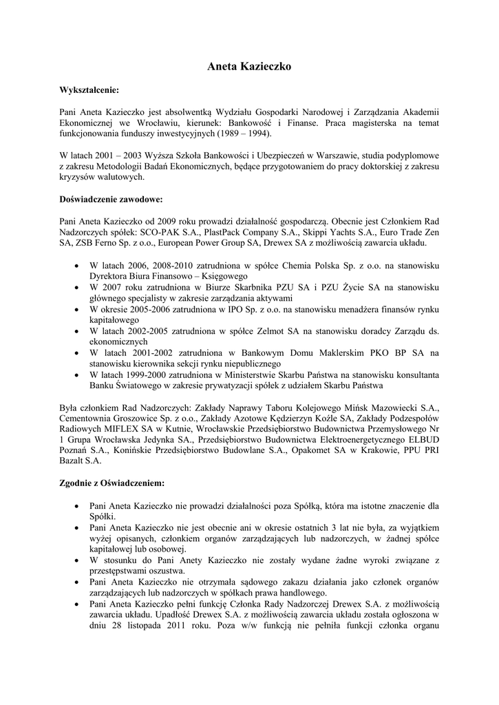 Aneta Kazieczko Wykształcenie: Pani Aneta Kazieczko jest absolwentką Wydziału Gospodarki Narodowej i Zarządzania Akademii Ekonomicznej we Wrocławiu, kierunek: Bankowość i Finanse. Praca magisterska na temat funkcjonowania funduszy inwestycyjnych (1989 – 1994). W latach 2001 – 2003 Wyższa Szkoła Bankowości i Ubezpieczeń w Warszawie, studia podyplomowe z zakresu Metodologii Badań Ekonomicznych, będące przygotowaniem do pracy doktorskiej z zakresu kryzysów walutowych. Doświadczenie zawodowe: Pani Aneta Kazieczko od 2009 roku prowadzi działalność gospodarczą. Obecnie jest Członkiem Rad Nadzorczych spółek: SCO-PAK S.A., PlastPack Company S.A., Skippi Yachts S.A., Euro Trade Zen SA, ZSB Ferno Sp. z o.o., European Power Group SA, Drewex SA z możliwością zawarcia układu. W latach 2006, 2008-2010 zatrudniona w spółce Chemia Polska Sp. z o.o. na stanowisku Dyrektora Biura Finansowo – Księgowego W 2007 roku zatrudniona w Biurze Skarbnika PZU SA i PZU Życie SA na stanowisku głównego specjalisty w zakresie zarządzania aktywami W okresie 2005-2006 zatrudniona w IPO Sp. z o.o. na stanowisku menadżera finansów rynku kapitałowego W latach 2002-2005 zatrudniona w spółce Zelmot SA na stanowisku doradcy Zarządu ds. ekonomicznych W latach 2001-2002 zatrudniona w Bankowym Domu Maklerskim PKO BP SA na stanowisku kierownika sekcji rynku niepublicznego W latach 1999-2000 zatrudniona w Ministerstwie Skarbu Państwa na stanowisku konsultanta Banku Światowego w zakresie prywatyzacji spółek z udziałem Skarbu Państwa Była członkiem Rad Nadzorczych: Zakłady Naprawy Taboru Kolejowego Mińsk Mazowiecki S.A., Cementownia Groszowice Sp. z o.o., Zakłady Azotowe Kędzierzyn Koźle SA, Zakłady Podzespołów Radiowych MIFLEX SA w Kutnie, Wrocławskie Przedsiębiorstwo Budownictwa Przemysłowego Nr 1 Grupa Wrocławska Jedynka SA., Przedsiębiorstwo Budownictwa Elektroenergetycznego ELBUD Poznań S.A., Konińskie Przedsiębiorstwo Budowlane S.A., Opakomet SA w Krakowie, PPU PRI Bazalt S.A. Zgodnie z Oświadczeniem: Pani Aneta Kazieczko nie prowadzi działalności poza Spółką, która ma istotne znaczenie dla Spółki. Pani Aneta Kazieczko nie jest obecnie ani w okresie ostatnich 3 lat nie była, za wyjątkiem wyżej opisanych, członkiem organów zarządzających lub nadzorczych, w żadnej spółce kapitałowej lub osobowej. W stosunku do Pani Anety Kazieczko nie zostały wydane żadne wyroki związane z przestępstwami oszustwa. Pani Aneta Kazieczko nie otrzymała sądowego zakazu działania jako członek organów zarządzających lub nadzorczych w spółkach prawa handlowego. Pani Aneta Kazieczko pełni funkcję Członka Rady Nadzorczej Drewex S.A. z możliwością zawarcia układu. Upadłość Drewex S.A. z możliwością zawarcia układu została ogłoszona w dniu 28 listopada 2011 roku. Poza w/w funkcją nie pełniła funkcji członka organu zarządzającego lub nadzorczego w podmiotach, które znalazły się w stanie upadłości, zarządu komisarycznego ani likwidacji. Pani Aneta Kazieczko nie prowadzi działalności, która jest konkurencyjna w stosunku do działalności Spółki, oraz nie jest członkiem organu konkurencyjnej spółki kapitałowej lub członkiem organu jakiejkolwiek konkurencyjnej osoby prawnej; Pani Aneta Kazieczko nie jest wpisana do Rejestru Dłużników Niewypłacalnych, prowadzonego na podstawie ustawy o Krajowym Rejestrze Sądowym. Marcin Kłopociński Wykształcenie: Pa Marcin Kłopociński posiada wykształcenie niepełne wyższe - przerwane studia na V roku Politechniki Warszawskiej na kierunku organizacja i zarządzanie przemysłem. Doświadczenie zawodowe: Pan Marcin Kłopociński zajmuje się inwestycjami kapitałowymi oraz restrukturyzacją przedsiębiorstw. Posiada pakiety akcji wielu spółek publicznych i niepublicznych. 2004 – obecnie - Prezes Zarządu Private Investors Sp. z o.o. 1995 – 2003 - Prezes Zarządu Masko-Graham Sp.z o.o. (obecna nazwa: Graham Packaging Poland) 1986 – 1995 - Działalność gospodarcza 1988 – 1990 - Prezes Zarządu Simple Sp. z o.o. (obecnie: Simple S.A.) 1983 – 1986 - Prezes Zarządu Spółdzielni Budowlano Mieszkaniowej "Marysin" Uczestnictwo w radach nadzorczych: 2012 – obecnie Expedyt Sp. z o.o. – członek Rady Nadzorczej 2011 – obecnie Plast Pak Company S.A. – członek Rady Nadzorczej 2009 – obecnie Gymnasion S.A. w upadłości likwidacyjnej – członek Rady Nadzorczej 2012 – 2013 LZMO S.A. – członek Rady Nadzorczej 2012 – 2013 Baltic Ceramics S.A. – członek Rady Nadzorczej 2011 – 2013 LST Capital S.A. – członek Rady Nadzorczej 2008 – 2013 Benefit Multimedia S.A. – przewodniczący i wiceprzewodniczący Rady Nadzorczej 2001 – 2003 Simple S.A. – członek Rady Nadzorczej Zgodnie z Oświadczeniem: Pan Marcin Kłopociński nie prowadzi działalności poza Spółką, która ma istotne znaczenie dla Spółki. Pan Marcin Kłopociński nie jest obecnie ani w okresie ostatnich 3 lat nie był, za wyjątkiem wyżej opisanych, członkiem organów zarządzających lub nadzorczych, w żadnej spółce kapitałowej lub osobowej. W stosunku do Pana Marcina Kłopocińskiego nie zostały wydane żadne wyroki związane z przestępstwami oszustwa. Pan Marcin Kłopociński nie otrzymał sądowego zakazu działania jako członek organów zarządzających lub nadzorczych w spółkach prawa handlowego. Pan Marcin Kłopociński pełni funkcję Członka Rady Nadzorczej Gymnasion S.A. w upadłości likwidacyjnej. Upadłość Gymnasion S.A. została ogłoszona w dniu 31 sierpnia 2010 roku. Poza w/w funkcją nie pełnił funkcji członka organu zarządzającego lub nadzorczego w podmiotach, które znalazły się w stanie upadłości, zarządu komisarycznego ani likwidacji. Pan Marcin Kłopociński nie prowadzi działalności, która jest konkurencyjna w stosunku do działalności Spółki, oraz nie jest członkiem organu konkurencyjnej spółki kapitałowej lub członkiem organu jakiej