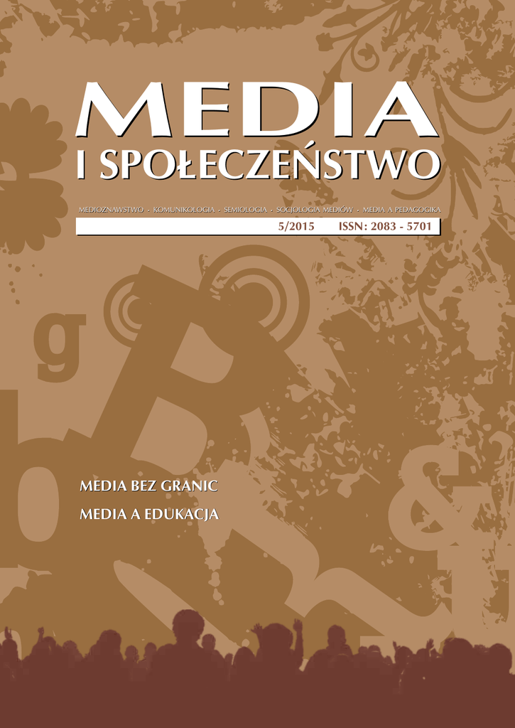 MEDIA I SPOŁECZEŃSTWO MEDIOZNAWSTWO . KOMUNIKOLOGIA . SEMIOLOGIA . SOCJOLOGIA MEDIÓW . MEDIA A PEDAGOGIKA 5/2015 MEDIA BEZ GRANIC MEDIA A EDUKACJA ISSN : 2083 - 5701 MEDIA I SPOŁECZEŃSTWO MEDIOZNAWSTWO . KOMUNIKOLOGIA . SEMIOLOGIA . SOCJOLOGIA MEDIÓW . MEDIA A PEDAGOGIKA AKADEMIA TECHNICZNO-HUMANISTYCZNA BIELSKO-BIAŁA 2015 MEDIA AND SOCIETY MEDIA STUDIES . COMMUNICATION SCIENCES . SEMIOLOGY . MEDIA SOCIOLOGY . MEDIA AND PEDAGOGY ISSN 2083 - 5701 vol. 5/2015 MEDIA WITHOUT BORDERS THE MEDIA AND EDUCATION MEDIA I SPOŁECZEŃSTWO MEDIOZNAWSTWO . KOMUNIKOLOGIA . SEMIOLOGIA . SOCJOLOGIA MEDIÓW . MEDIA A PEDAGOGIKA ISSN 2083 - 5701 nr 5/2015 MEDIA BEZ GRANIC MEDIA A EDUKACJA Rada Naukowa Prof. dr hab. Ryszard Barcik – Akademia Techniczno-Humanistyczna, Bielsko-Biała Prof. dr hab. Marek Bernacki – Akademia Techniczno-Humanistyczna, Bielsko-Biała Ks. prof. dr hab. Tadeusz Borutka – Papieski Uniwersytet Jana Pawła II, Kraków Dr Sc Dunja Brozović - Rončević – Institut za hrvatski jezik i jezikoslovlje, Zagreb (Chorwacja) Prof. ATH dr hab. Jan Burzyński – Akademia Techniczno-Humanistyczna, Bielsko-Biała Prof. dr hab. Bogusław Dunaj – Uniwersytet Jagielloński, Kraków Prof. dr hab. Iwona Hofman – Uniwersytet Marii Curie-Skłodowskiej, Lublin Prof. dr hab. Maciej Kawka – Uniwersytet Jagielloński, Kraków (przewodniczący) Doc. dr Larysa D. Klymanska – Lviv National Polytechnic University (Ukraina) Prof. dr hab. Tomasz Mielczarek – Uniwersytet Jana Kochanowskiego, Kielce Prof. dr Vesna Mikolič – Univerza na Primorskem, Koper (Słowenia) Prof. UP dr hab. Agnieszka Ogonowska – Uniwersytet Pedagogiczny, Kraków Prof. Peter Olekšak – Katolicka Univerzita v Ružomberku, Ružomberk (Słowacja) Prof. dr hab. Kazimierz Ożóg – Uniwersytet Rzeszowski Prof. UWM dr hab. Mariusz Rutkowski – Uniwersytet Warmińsko-Mazurski, Olsztyn Prof. dr Lyudmila H. Sokuryanska – The Vasyl Karazin Kharkiv National University (Ukraina) Prof. dr Ljiljana Šarić – Uniwersytet w Oslo (Norwegia) Prof. UW dr hab. Ewa Szczęsna – Uniwersytet Warszawski Prof. dr hab. Emil Tokarz – Akademia Techniczno-Humanistyczna, Bielsko-Biała Prof. Yevhenia Tikhomirova – Lesya Ukrainka Eastern European National University (Ukraina) Prof. Yaryna Turchyn – Lviv National Polytechnic University (Ukraina) Komitet Redakcyjny Zofia Kowalik-Kaleta (ATH) – red. naczelna, Patrycja Bałdys (AMW) – zastępca red. naczelnej, Katarzyna Piątek (ATH), Ewelina Gajewska (ATH) – sekretarze redakcji, Yahya Tamezoujt (ATH) – redaktor językowy /native speaker – język angielski/, Robert Paprotny (ATH) – redaktor statystyczny, Agnieszka Będkowska-Kopczyk (ATH), Olga Dąbrowska-Cendrowska (UJK) – porównawcze badania medioznawcze, Anna Foltyniak (ATH) – media regionalne i lokalne, Monika Miczka-Pajestka (ATH), Mateusz Warchał (ATH) – media a pedagogika, Jolanta Szarlej (ATH), Paweł Świątek (ATH) – semiologia, komunikowanie społeczne, ks. dr Sławomir Zawada (Instytut Teologiczny) – etyka mediów, Michał Lisecki (ATH), Krzysztof Polok (ATH) – media międzynarodowe Redaktorzy prowadzący numer Patrycja Bałdys, Katarzyna Piątek Adres Redakcji ul. Willowa 2, 43-309 Bielsko-Biała e-mail: [email protected] www.mediaispoleczenstwo.ath.bielsko.pl tel. +48 (33) 82 79 305 Copyright © by Akademia Techniczno-Humanistyczna, Bielsko-Biała 2015 Redaktor naczelny Wydawnictwa ATH prof. dr hab. Kazimierz Nikodem Sekretarz Wydawnictwa Naukowego ATH mgr Grzegorz Zamorowski Wydawnictwo Naukowe Akademii Techniczno-Humanistycznej w Bielsku-Białej ul. Willowa 2, bud. D, pokoje 4,6,9 43-309 Bielsko-Biała tel. /fax +48 (33) 827-92-68 e-mail: [email protected] Tu można nabywać numery czasopisma Skład, druk i oprawa Omnidium ul. Kruczkowskiego 12 41-710 Ruda Śląska www.omn.com.pl Spis treści Zofia Kowalik-Kaleta Badania nad mediami w roku 2015 ....................................................................... 9 Studia i Rozprawy Media bez granic ........................................................................................... 11 Maciej Kawka Komunikowanie wizualne a nauka o mediach – współczesność i perspektywy ....... 13 Ryszard A. Podgórski Aksjologiczny wymiar Internetu (na podstawie badań ankietowych) ..................... 22 Olga Dąbrowska-Cendrowska Guidetainment w polskich mediach – analiza zjawiska na wybranych przykładach ........................................................ 35 Larysa D. Klymanska The role of media in the mechanism of the social amplification of risks .................. 54 Viktor Savka, Uliana Yatsyshyn Media as actors of propaganda influence. Portrayal of the Russian-Ukrainian armed conflict in Ukrainian religious media ........................................................... 65 Alexander S. Golikov Media designing of identity: knowledge structures under the influence of media ................................................................ 75 Alina A. Kalashnikova Specialist media as the art field and the art market evolution reflector .................. 86 Kateryna Novikova Dyskurs europejskości w ukraińskiej prasie rozrywkowej ....................................... 95 5 Patrycja Bałdys Memy, mashupy, viral videos – opisywanie rzeczywistości społecznej w czasach kultury digitalnej ............................................................... 103 Przemysław Szews Medialny fanpage – szanse i zagrożenia ............................................................... 118 Katarzyna Piątek Kampanie społeczne jako narzędzia zmiany postaw wobec osób z niepełnosprawnością ................................................................................ 136 Media a edukacja ....................................................................................... 151 Sławomir Koziej (Nie)wiedza rodziców gimnazjalistów na temat zagrożeń internetowych ............ 153 Agata Zadykowicz Wirtualizacja a rytuały językowe 