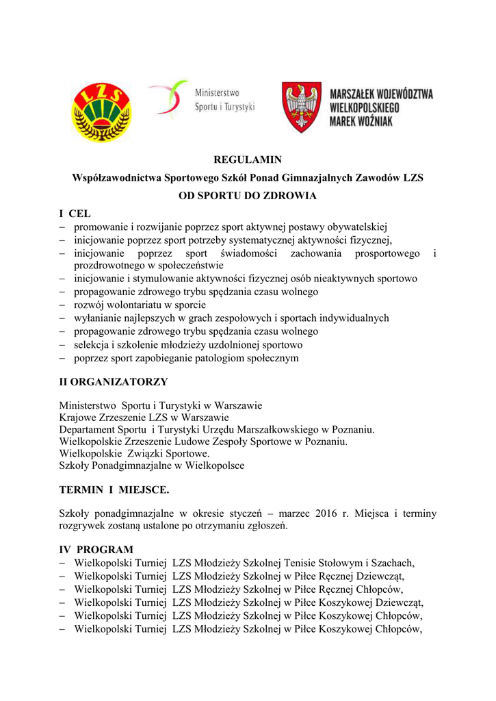REGULAMIN Współzawodnictwa Sportowego Szkół Ponad Gimnazjalnych Zawodów LZS OD SPORTU DO ZDROWIA I CEL promowanie i rozwijanie poprzez sport aktywnej postawy obywatelskiej inicjowanie poprzez sport potrzeby systematycznej aktywności fizycznej, inicjowanie poprzez sport świadomości zachowania prosportowego prozdrowotnego w społeczeństwie inicjowanie i stymulowanie aktywności fizycznej osób nieaktywnych sportowo propagowanie zdrowego trybu spędzania czasu wolnego rozwój wolontariatu w sporcie wyłanianie najlepszych w grach zespołowych i sportach indywidualnych propagowanie zdrowego trybu spędzania czasu wolnego selekcja i szkolenie młodzieży uzdolnionej sportowo poprzez sport zapobieganie patologiom społecznym i II ORGANIZATORZY Ministerstwo Sportu i Turystyki w Warszawie Krajowe Zrzeszenie LZS w Warszawie Departament Sportu i Turystyki Urzędu Marszałkowskiego w Poznaniu. Wielkopolskie Zrzeszenie Ludowe Zespoły Sportowe w Poznaniu. Wielkopolskie Związki Sportowe. Szkoły Ponadgimnazjalne w Wielkopolsce TERMIN I MIEJSCE. Szkoły ponadgimnazjalne w okresie styczeń – marzec 2016 r. Miejsca i terminy rozgrywek zostaną ustalone po otrzymaniu zgłoszeń. IV PROGRAM Wielkopolski Turniej Wielkopolski Turniej Wielkopolski Turniej Wielkopolski Turniej Wielkopolski Turniej Wielkopolski Turniej LZS Młodzieży Szkolnej Tenisie Stołowym i Szachach, LZS Młodzieży Szkolnej w Piłce Ręcznej Dziewcząt, LZS Młodzieży Szkolnej w Piłce Ręcznej Chłopców, LZS Młodzieży Szkolnej w Piłce Koszykowej Dziewcząt, LZS Młodzieży Szkolnej w Piłce Koszykowej Chłopców, LZS Młodzieży Szkolnej w Piłce Koszykowej Chłopców, Wielkopolski Turniej LZS Młodzieży Szkolnej w Piłce Siatkowej Dziewcząt, Wielkopolski Turniej LZS Młodzieży Szkolnej w Piłce Siatkowej Chłopców, Turnieje przeprowadzone zostaną zgodnie z przepisami odpowiednich związków sportowych. V UCZESTNICTWO W turniejach uczestniczy młodzież szkół ponadgimnazjalnych zrzeszona w LZS, urodzona w latach 2000 – 96, posiadająca legitymacje szkolne i LZS Zawodnicy muszą posiadać aktualne badania lekarskie. Zawodnicy innych klubów nie mają prawa startu. Drużyny mogą liczyć: - tenis stołowy – 6 zawodników + 1 opiekun + 1 kierowca - szachy – 4 zawodników + 1 opiekun - piłka ręczna - 12 zawodników + 1 opiekun + 1 kierowca piłka siatkowa i koszykowa – 10 zawodników + 1 opiekun + 1 kierowca VI ZGŁOSZENIA Zgłoszenia ilościowe drużyn przyjmowane są w WZ LZS Poznań ul. Oś. Tysiąclecia 4 [email protected] do dnia 15 stycznia 2016 r. z dokładnym podaniem adresu szkoły. Zgłoszenia imienne w dniu imprezy. VII NAGRODY Indywidualne Za miejsca I – III medale Szkoły Za miejsca I-III puchary VIII ZASADY FINANSOWANIA Koszty organizacyjne i nagród w turniejach pokrywają organizatorzy. Koszty przejazdów na zawody pokrywają zainteresowane powiaty, kluby lub szkoły. IX UWAGI KOŃCOWE Za aktualne badania lekarskie odpowiedzialni są kierownicy ekip. Wszelkie sprawy sporne i nie ujęte w niniejszym regulaminie rozstrzyga komisja odwoławcza. Uczestnicy imprezy, członkowie LZS, objęci są ubezpieczeniem zbiorowym zawartym przez Wielkopolskie Zrzeszenie Ludowe Zespoły Sportowe w Poznaniu.