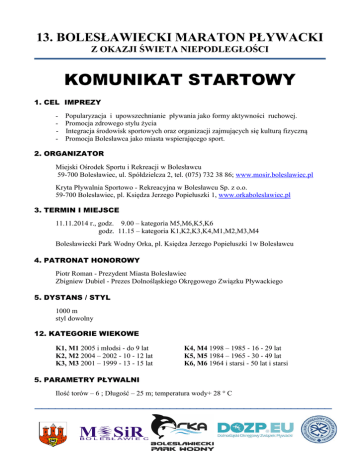 13. BOLESŁAWIECKI MARATON PŁYWACKI Z OKAZJI ŚWIETA NIEPODLEGŁOŚCI KOMUNIKAT STARTOWY 1. CEL IMPREZY - Popularyzacja i upowszechnianie pływania jako formy aktywności ruchowej. - Promocja zdrowego stylu życia - Integracja środowisk sportowych oraz organizacji zajmujących się kulturą fizyczną - Promocja Bolesławca jako miasta wspierającego sport. 2. ORGANIZATOR Miejski Ośrodek Sportu i Rekreacji w Bolesławcu 59-700 Bolesławiec, ul. Spółdzielcza 2, tel. (075) 732 38 86; www.mosir.boleslawiec.pl Kryta Pływalnia Sportowo - Rekreacyjna w Bolesławcu Sp. z o.o. 59-700 Bolesławiec, pl. Księdza Jerzego Popiełuszki 1, www.orkaboleslawiec.pl 3. TERMIN I MIEJSCE 11.11.2014 r., godz. 9.00 – kategoria M5,M6,K5,K6 godz. 11.15 – kategoria K1,K2,K3,K4,M1,M2,M3,M4 Bolesławiecki Park Wodny Orka, pl. Księdza Jerzego Popiełuszki 1w Bolesławcu 4. PATRONAT HONOROWY Piotr Roman - Prezydent Miasta Bolesławiec Zbigniew Dubiel - Prezes Dolnośląskiego Okręgowego Związku Pływackiego 5. DYSTANS / STYL 1000 m styl dowolny 12. KATEGORIE WIEKOWE K1, M1 2005 i młodsi - do 9 lat K2, M2 2004 – 2002 - 10 - 12 lat K3, M3 2001 – 1999 - 13 - 15 lat K4, M4 1998 – 1985 - 16 - 29 lat K5, M5 1984 – 1965 - 30 - 49 lat K6, M6 1964 i starsi - 50 lat i starsi 5. PARAMETRY PŁYWALNI Ilość torów – 6 ; Długość – 25 m; temperatura wody+ 28 ° C ____________________________________________ M SiR BO ESSŁŁ A AW WII E E CC B O LL E LISTA STARTOWA GODZ.9.00 - BLOK I (kategorie: K5,M5,K6,M6) Seria 1 Tor 1 2 3 4 5 6 Kawula Emilia Świder Hanna Rulińska Elżbieta Mladszew Regina Grzegorzewska Grażyna Pachom Zdzisława Seria 2 Tor 1 2 3 4 5 6 Lelewski Jacek Krzekotowski Piotr Satoła Marta Jaśko Piotr Pachom Andrzej Klimkowski Marcin Seria 3 Tor 1 2 3 4 5 Kowałko Czesław Dobrzyński Maciej Kopaniecki Henryk Grela Krzysztof Daszyński Andrzej GODZ.11.00 OFICJALNE OTWARCIE MARATONU DEKORACJA ZWYCIĄZCÓW BLOKU I ____________________________________________ M SiR BO ESSŁŁ A AW WII E E CC B O LL E GODZ. 11.15 BLOK II (kategorie: K1-K4 i M1-M4) Seria 1 Tor 1A 1B 2A 2B 3A 3B 4A 4B 5A 5B 6A 6B Kret Julia Paradzińska Weronika Maksymowicz Nadia Młodzińska Wiktoria Węglicka Jadwiga Jośko Julita Ostrowska Maja Zagdańska Oliwia Maksymowicz Nina Abramowicz Katarzyna Barszczewska Julia Pawłowska Anita Seria 2 Tor 1A 1B 2A 2B 3A 3B 4A 4B 5A 5B Przeczek Adrianna Ciszyńska Hanna Szałobryt Andżelika Palikowska Aleksandra Lelewska Oliwia Kołtuniewicz Adrianna Fischer Oliwia Mucha Zofia Jarocka Kamila Pawłowska Anita Seria 3 Tor 1A 1B 2A 2B 3A 3B 4A 4B Karkulowski Jan Białowąs Wiktor Błaszkiewicz Patryk Bijak Marcel Parzyński Hubert Przeczek Wiktor Cepuchowicz Jakub Caliński Aleksy ____________________________________________ M SiR BO ESSŁŁ A AW WII E E CC B O LL E 5A 5B 6A 6B Wróblewski Kamil Jośko Filip Korzeniewicz Jakub Nalepa Karol Seria 4 Tor 1A 1B 2A 2B 3A 3B 4A 4B 5A 5B 6A 6B Alf Jakub Węgrowski Krystian Ferenc Filip Przeczek Wiktor Zięba Wojciech Kruszyński Piotr Grela Kacper Doroba Michał Szkirpan Michał Ogorzałek Alan Buczyński Patryk Leiman Cezary Seria 5 Tor 1A 1B 2A 2B 3A 3B 4A 4B 5A 5B 6A 6B Ziętek Dawid Stopyra Michał Rosa Patryk Szkirpan Jonasz Krzekotowski Karol Doroszyński Dawid Górak Wiktor Łukanowicz Patryk Kowalczyk Michał Juszczyk Dawid Stelmasiak Krzysztof Zielonka Patryk Seria 6 Tor 1 2 3 4 5 6 Gielniewska Wiktoria Węglicka Julita Petters Klaudia Szklanna Łucja Mielnik Karolina Rzepka Sabina ____________________________________________ M SiR BO ESSŁŁ A AW WII E E CC B O LL E ____________________________________________ M SiR BO ESSŁŁ A AW WII E E CC B O LL E