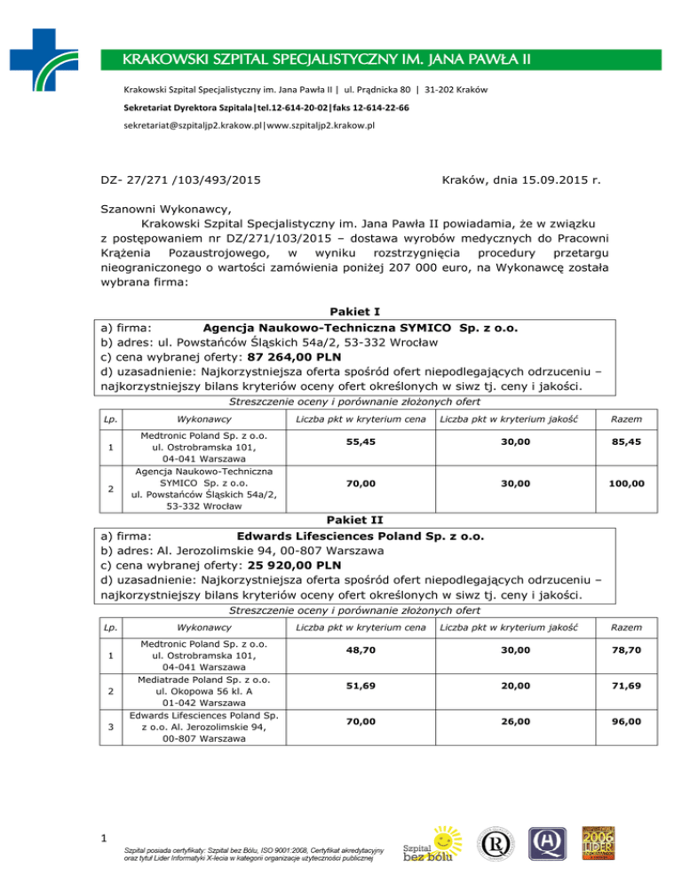 Krakowski Szpital Specjalistyczny im. Jana Pawła II | ul. Prądnicka 80 | 31-202 Kraków Sekretariat Dyrektora Szpitala|tel.12-614-20-02|faks 12-614-22-66 [email protected]|www.szpitaljp2.krakow.pl DZ- 27/271 /103/493/2015 Kraków, dnia 15.09.2015 r. Szanowni Wykonawcy, Krakowski Szpital Specjalistyczny im. Jana Pawła II powiadamia, że w związku z postępowaniem nr DZ/271/103/2015 – dostawa wyrobów medycznych do Pracowni Krążenia Pozaustrojowego, w wyniku rozstrzygnięcia procedury przetargu nieograniczonego o wartości zamówienia poniżej 207 000 euro, na Wykonawcę została wybrana firma: Pakiet I a) firma: Agencja Naukowo-Techniczna SYMICO Sp. z o.o. b) adres: ul. Powstańców Śląskich 54a/2, 53-332 Wrocław c) cena wybranej oferty: 87 264,00 PLN d) uzasadnienie: Najkorzystniejsza oferta spośród ofert niepodlegających odrzuceniu – najkorzystniejszy bilans kryteriów oceny ofert określonych w siwz tj. ceny i jakości. Streszczenie oceny i porównanie złożonych ofert Lp. 1 2 Wykonawcy Medtronic Poland Sp. z o.o. ul. Ostrobramska 101, 04-041 Warszawa Agencja Naukowo-Techniczna SYMICO Sp. z o.o. ul. Powstańców Śląskich 54a/2, 53-332 Wrocław Liczba pkt w kryterium cena Liczba pkt w kryterium jakość Razem 55,45 30,00 85,45 70,00 30,00 100,00 Pakiet II a) firma: Edwards Lifesciences Poland Sp. z o.o. b) adres: Al. Jerozolimskie 94, 00-807 Warszawa c) cena wybranej oferty: 25 920,00 PLN d) uzasadnienie: Najkorzystniejsza oferta spośród ofert niepodlegających odrzuceniu – najkorzystniejszy bilans kryteriów oceny ofert określonych w siwz tj. ceny i jakości. Streszczenie oceny i porównanie złożonych ofert Lp. 1 2 3 1 Wykonawcy Medtronic Poland Sp. z o.o. ul. Ostrobramska 101, 04-041 Warszawa Mediatrade Poland Sp. z o.o. ul. Okopowa 56 kl. A 01-042 Warszawa Edwards Lifesciences Poland Sp. z o.o. Al. Jerozolimskie 94, 00-807 Warszawa Liczba pkt w kryterium cena Liczba pkt w kryterium jakość Razem 48,70 30,00 78,70 51,69 20,00 71,69 70,00 26,00 96,00 Krakowski Szpital Specjalistyczny im. Jana Pawła II | ul. Prądnicka 80 | 31-202 Kraków Sekretariat Dyrektora Szpitala|tel.12-614-20-02|faks 12-614-22-66 [email protected]|www.szpitaljp2.krakow.pl Pakiet III a) firma: Sorin Group Polska Sp. z o.o. b) adres: ul. Postępu 21, 02-676 Warszawa c) cena wybranej oferty: 146 880,00 PLN d) uzasadnienie: Jedyna złożona oferta niepodlegająca odrzuceniu. Streszczenie oceny i porównanie złożonych ofert Lp. 1 2 Wykonawcy Sorin Group Polska Sp. z o.o., ul. Postępu 21, 02-676 Warszawa EUROSETS S.R.L Via Statale, 12 n. 143, 41036 Medolla (MO) ITALY Liczba pkt w kryterium cena Liczba pkt w kryterium jakość 70,00 30,00 Razem 100,00 Oferta odrzucona Pakiet IV a) firma: VYGON Polska Sp. z o.o. b) adres: ul. Francuska 39/6, 03-905 Warszawa c) cena wybranej oferty: 6 318,00 PLN d) uzasadnienie: Najkorzystniejsza oferta spośród ofert niepodlegających odrzuceniu – najkorzystniejszy bilans kryteriów oceny ofert określonych w siwz tj. ceny i jakości. Streszczenie oceny i porównanie złożonych ofert Lp. 1 2 3 Wykonawcy Sorin Group Polska Sp. z o.o., ul. Postępu 21, 02-676 Warszawa EUROSETS S.R.L Via Statale, 12 n. 143, 41036 Medolla (MO) ITALY VYGON Polska Sp. z o.o. ul. Francuska 39/6, 03-905 Warszawa Liczba pkt w kryterium cena Liczba pkt w kryterium jakość Razem 8,53 30,00 38,53 9,75 30,00 39,75 70,00 30,00 100,00 Pakiet V a) firma: Sorin Group Polska Sp. z o.o. b) adres: ul. Postępu 21, 02-676 Warszawa c) cena wybranej oferty: 11 340,00 PLN d) uzasadnienie: Jedyna złożona oferta niepodlegająca odrzuceniu. Streszczenie oceny i porównanie złożonych ofert Lp. Wykonawcy Liczba pkt w kryterium cena 1 Sorin Group Polska Sp. z o.o., ul. Postępu 21, 02-676 Warszawa 70,00 2 Liczba pkt w kryterium jakość 30,00 Razem 100,00 Krakowski Szpital Specjalistyczny im. Jana Pawła II | ul. Prądnicka 80 | 31-202 Kraków Sekretariat Dyrektora Szpitala|tel.12-614-20-02|faks 12-614-22-66 [email protected]|www.szpitaljp2.krakow.pl Pakiet VI a) firma: Medtronic Poland Sp. z o.o. b) adres: ul. Ostrobramska 101, 04-041 Warszawa c) cena wybranej oferty: 21 060,00 PLN d) uzasadnienie: Jedyna złożona oferta niepodlegająca odrzuceniu. Streszczenie oceny i porównanie złożonych ofert Lp. Wykonawcy Liczba pkt w kryterium cena 1 Medtronic Poland Sp. z o.o. ul. Ostrobramska 101, 04-041 Warszawa 70,00 Liczba pkt w kryterium jakość 30,00 Razem 100,00 Pakiet VII a) firma: Edwards Lifesciences Poland Sp. z o.o. b) adres: Al. Jerozolimskie 94, 00-807 Warszawa c) cena wybranej oferty: 25 920,00 PLN d) uzasadnienie: Jedyna złożona oferta niepodlegająca odrzuceniu. Streszczenie oceny i porównanie złożonych ofert Lp. Wykonawcy Liczba pkt w kryterium cena 1 Edwards Lifesciences Poland Sp. z o.o. Al. Jerozolimskie 94, 00-807 Warszawa 70,00 Liczba pkt w kryterium jakość 30,00 Pakiet VIII Zamawiający na podstawie art. 93 ust. 1 pkt 1 unieważnia postępowanie o udzielenie zamówienia. Nie złożono żadnej oferty niepodlegającej odrzuceniu. Pakiet IX Zamawiający na podstawie art. 93 ust. 1 pkt 1 unieważnia postępowanie o udzielenie zamówienia. Nie złożono żadnej oferty niepodlegającej odrzuceniu. Pakiet X Zamawiający na podstawie art. 93 ust. 1 pkt 1 unieważnia postępowanie o udzielenie zamówienia. Nie złożono żadnej oferty niepodlegającej odrzuceniu. Z poważaniem 3 Razem 100,00