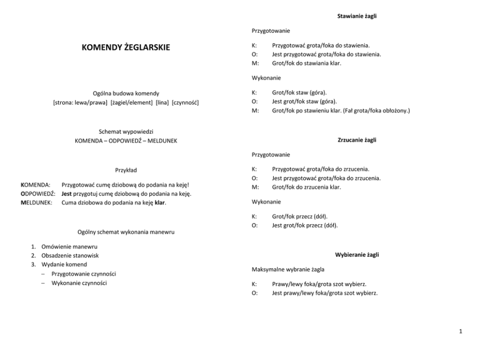 Stawianie żagli Przygotowanie KOMENDY ŻEGLARSKIE K: O: M: Przygotowad grota/foka do stawienia. Jest przygotowad grota/foka do stawienia. Grot/fok do stawiania klar. Wykonanie Ogólna budowa komendy *strona: lewa/prawa+ *żagiel/element+ *lina+ *czynnośd+ K: O: M: Grot/fok staw (góra). Jest grot/fok staw (góra). Grot/fok po stawieniu klar. (Fał grota/foka obłożony.) Schemat wypowiedzi KOMENDA – ODPOWIEDŹ – MELDUNEK Zrzucanie żagli Przygotowanie Przykład KOMENDA: Przygotowad cumę dziobową do podania na keję! ODPOWIEDŹ: Jest przygotuj cumę dziobową do podania na keję. MELDUNEK: Cuma dziobowa do podania na keję klar. K: O: M: Przygotowad grota/foka do zrzucenia. Jest przygotowad grota/foka do zrzucenia. Grot/fok do zrzucenia klar. Wykonanie K: O: Grot/fok przecz (dół). Jest grot/fok przecz (dół). Ogólny schemat wykonania manewru 1. Omówienie manewru 2. Obsadzenie stanowisk 3. Wydanie komend Przygotowanie czynności Wykonanie czynności Wybieranie żagli Maksymalne wybranie żagla K: O: Prawy/lewy foka/grota szot wybierz. Jest prawy/lewy foka/grota szot wybierz. 1 Optymalne wybranie żagla K: O: Wiosła Prawy/lewy foka/grota szot wybieraj. Jest prawy/lewy foka/grota szot wybieraj. Luzowanie żagli Maksymalne zluzowanie żagla K: O: Prawy/lewy foka/grota szot luz. Jest prawy/lewy foka/grota szot luz. K: K: K: K: K: K: K: K: K: K: Przygotowad wiosła. Wiosła chwyd. Wiosła obie naprzód. Wiosła lewa/prawa naprzód. Wiosła lewa/prawa naprzód, prawa/lewa wstecz. Wiosła lewa/prawa wstecz, prawa/lewa naprzód. Wiosła spław. Wiosła hamuj. Wiosła obie wstecz. Wiosła złóż. Optymalne zluzowanie żagla K: O: Prawy/lewy foka/grota szot luzuj. Jest prawy/lewy foka/grota szot luzuj. Przerzucenia foka na stronę przeciwną niż grot („na motyla”) K: O: Lewy/prawy foka szot wybieraj. Prawy/lewy foka szot luzuj. Jest lewy/prawy foka szot wybieraj. Jest prawy/lewy foka szot luzuj. Ster, sternik K: O: Ster zero. Jest ster zero. K: O: Ster lewo/prawo. Jest ster lewo/prawo. K: O: Ster lekko lewo/prawo. Jest ster lekko lewo/prawo. K: O: Ster lewo/prawo na burt. Jest ster lewo/prawo na burt. K: O: Sternik tak trzymaj. Jest sternik tak trzymaj. K: O: Sternik do bejdewindu/półwiatru/baksztagu/fordewindu. Jest sternik do bejdewindu/półwiatru/baksztagu/fordewindu. K: O: Sternik kurs 180. Jest sternik kurs 180. Wystawienie żagla na stronę nawietrzną i powrót na stronę zawietrzną. K: O: K: O: Fok/grot lewo/prawo na wiatr. Jest fok/grot lewo/prawo na wiatr. Fok/grot luz. Prawy/lewy foka szot wybieraj. Jest fok/grot luz. Jest prawy/lewy foka/grota szot wybieraj. 2 Desant K: O: Desant na pokład. Jest desant na pokład. K: O: Dziób/rufa prawo/lewo na wodę. Jest dziób prawo/lewo na wodę. K: O: Desant na keję/ląd. Jest desant na keję/ląd. K: Chroo dziób/burtę/rufę. Kotwica K: O: M: Przygotowad kotwicę do rzucenia. Jest przygotowad kotwicę do rzucenia. Kotwica do rzucenia klar. Ostrzeżenie: Uwaga na nogi! K: O: M: Kotwicę rzud/wyrzud. Jest kotwicę rzud/wyrzud. Kotwica trzyma/nie trzyma. Cumy K: M: O: Kotwicę wybieraj. Jest kotwicę wybieraj. Kotwica patrzy lewo/prawo naprzód/wstecz. Kotwica pion. K: O: M: Przygotowad cumy/szpringi do oddania. Jest przygotowad cumy/szpringi do oddania. Cuma rufowa/cuma dziobowa/szpring dziobowy/szpring rufowy do oddania klar. K: O: M1: M2: Kotwicę rwij. Jest kotwicę rwij. Kotwica puściła. Kotwica pod dziobem/pod kluzą/przy burcie. K: O: M: Przygotowad szpring rufowy/dziobowy/cumę na biegowo. Jest przygotuj szpring rufowy/dziobowy/cumę na biegowo. Szpring rufowy/dziobowy/cuma na biegowo klar. K: O: Kotwica na pokład. Jest kotwica na pokład. K: O: Cumę/szpring dziobową/rufową oddaj/luzuj/wybieraj/obłóż. Jest cumę/szpring dziobową/rufową oddaj/luzuj/wybieraj/obłóż. K: O: M: Klar na kotwicy. Jest klar na kotwicy. Kotwica klar. K: O: M: Klar na cumach/szpringach. Jest klar na cumach/szpringach. Cuma dziobowa/rufowa klar. Szpring rufowy/dziobowy klar. K: O: Cuma rufowa/dziobowa na boję/na keję. Jest rufowa/dziobowa na boję/na keję. K: O: Przygotowad odbijacze. Jest przygotowad odbijacze. K: O: Cumy/szpringi wybierz i obłóż. Jest cumach/szpringach wybierz i obłóż. K: O: M: Odbijacze na prawą/lewą burtę. Jest odbijacze na prawą/lewą burtę. Odbijacze na burcie. Odbijacze 3 K: O: Odbijacze na pokład. Jest odbijacze na pokład. K: K: Chroo burtę/dziób/rufę. Jest chroo burtę/dziób/rufę. K: O: Jacek, obserwator na człowieka. (Meldowad o położeniu i odległości od człowieka za burtą). Jest obserwator na człowieka. K: O: Żagle luz. Jest żagle luz. Przygotowad się do podjęcia człowieka z prawej/lewej burty/z rufy. Człowiek przy burcie/rufie. Człowiek na pokład. / Podjąd człowieka z prawej/lewej burty/z rufy. Udzielid człowiekowi pierwszej pomocy. K: O: Do zwrotu przez sztag. Jest do zwrotu przez sztag. K: M: K: K: K: O: Lewy/prawy foka szot luz. Jest lewy/prawy foka szot luz. K: O: Prawy/lewy foka/grota szot wybieraj. Jest prawy/lewy foka/grota szot wybieraj. K: O: Prawy/lewy foka szot wybieraj. Jest prawy/lewy foka szot wybieraj. K: Kurs na najbliższy port. Manewr: zwrot przez sztag Manewr: podejście do boi Manewr: zwrot przez rufę K: O: Do zwrotu przez rufę. Jest do zwrotu przez rufę. Omówienie: Uwaga załoga! Będziemy podchodzid do boi dziobem pod wiatr i podamy na nią cumę dziobową. K: O: Lewy prawy foka szot wybieraj. Jest lewy/prawy foka szot wybieraj. Obsadzenie stanowisk: Jacek do bosaka. Darek do cumy dziobowej. K: O: Prawy/lewy foka szot luzuj. Jest prawy lewy foka szot luzuj. K: O: Przygotowad bosak. Jest przygotowad bosak. K: O: M: Przygotowad cumę dziobową. Jest przygotowad cumę dziobową. Cuma dziobowa klar. K: O: Żagle luz. Jest żagle luz. Manewr: człowiek za burtą Alarm: Alarm, człowiek za burtą! K: O: Podad środki ratunkowe. / Koło ratunkowe rzud! Jest podad środki ratunkowe. / Jest koło ratunkowe rzud! Polecenie: Meldowad o odległości