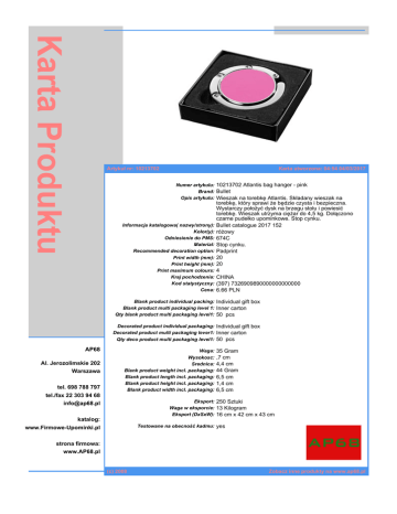 Karta Produktu Artykuł nr: 10213702 Karta utworzona: 04:54 04/03/2017 Numer artykulu: 10213702 Atlantis bag hanger - pink Brand: Bullet Opis artykulu: Wieszak na torebkę Atlantis. Składany wieszak na Informacja katalogowa( nazwy/strony): Kolor(y): Odniesienie do PMS: Material: Recommended decoration option: Print width (mm): Print height (mm): Print maximum colours: Kraj pochodzenia: Kod statystyczny: Cena: torebkę, który sprawi że będzie czysta i bezpieczna. Wystarczy położyć dysk na brzegu stołu i powiesić torebkę. Wieszak utrzyma ciężar do 4,5 kg. Dołączono czarne pudełko upominkowe. Stop cynku. Bullet catalogue 2017 152 różowy 674C Stop cynku. Padprint 20 20 4 CHINA (397) 7326909890000000000000 6.66 PLN Blank product individual packing: Individual gift box Blank product multi packaging level 1: Inner carton Qty blank product multi packaging level1: 50 pcs Decorated product individual packaging: Individual gift box Decorated product multi packaging lever1: Inner carton Qty deco product multi packaging level1: 50 pcs AP68 Al. Jerozolimskie 202 Warszawa tel. 698 788 797 Waga: Wysokosc: Srednica: Blank product weight incl. packaging: Blank product length incl. packaging: Blank product height incl. packaging: Blank product width incl. packaging: 35 Gram ,7 cm 4,4 cm 44 Gram 6,5 cm 1,4 cm 6,5 cm tel./fax 22 303 94 68 Eksport: 250 Sztuki Waga w eksporcie: 13 Kilogram Eksport (DxSxW): 16 cm x 42 cm x 43 cm [email protected] katalog: Testowane na obecność kadmu: yes www.Firmowe-Upominki.pl strona firmowa: www.AP68.pl (c) 2008 Zobacz inne produkty na www.ap68.pl