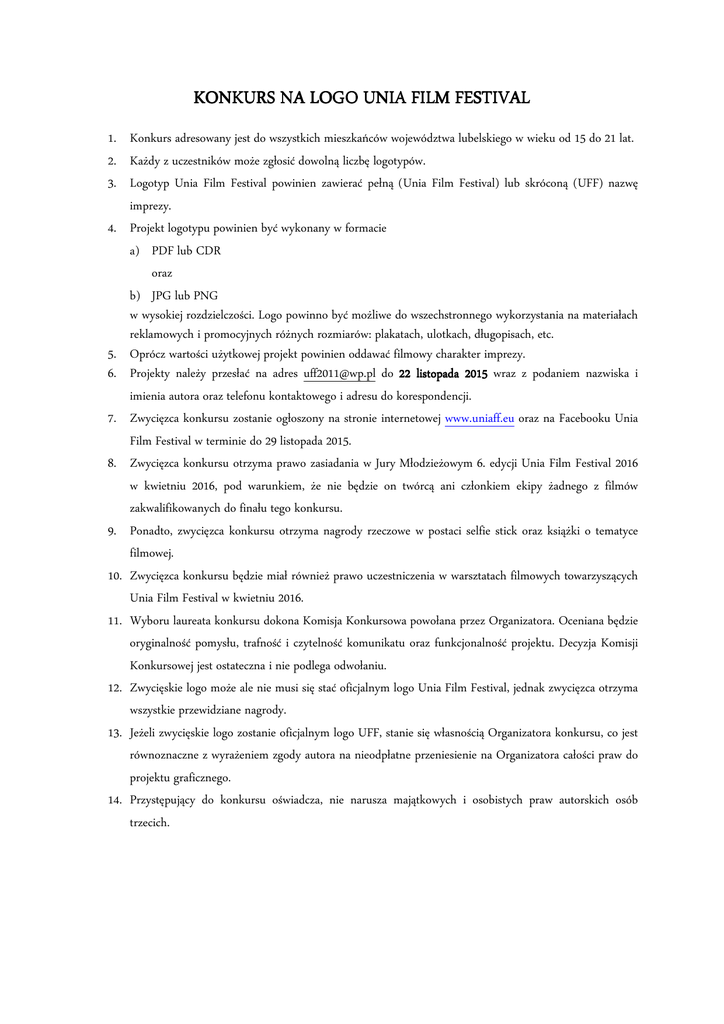 KONKURS NA LOGO UNIA FILM FESTIVAL 1. Konkurs adresowany jest do wszystkich mieszkańców województwa lubelskiego w wieku od 15 do 21 lat. 2. Każdy z uczestników może zgłosić dowolną liczbę logotypów. 3. Logotyp Unia Film Festival powinien zawierać pełną (Unia Film Festival) lub skróconą (UFF) nazwę imprezy. 4. Projekt logotypu powinien być wykonany w formacie a) PDF lub CDR oraz b) JPG lub PNG w wysokiej rozdzielczości. Logo powinno być możliwe do wszechstronnego wykorzystania na materiałach reklamowych i promocyjnych różnych rozmiarów: plakatach, ulotkach, długopisach, etc. 5. Oprócz wartości użytkowej projekt powinien oddawać filmowy charakter imprezy. 6. Projekty należy przesłać na adres [email protected] do 22 listopada 2015 wraz z podaniem nazwiska i imienia autora oraz telefonu kontaktowego i adresu do korespondencji. 7. Zwycięzca konkursu zostanie ogłoszony na stronie internetowej www.uniaff.eu oraz na Facebooku Unia Film Festival w terminie do 29 listopada 2015. 8. Zwycięzca konkursu otrzyma prawo zasiadania w Jury Młodzieżowym 6. edycji Unia Film Festival 2016 w kwietniu 2016, pod warunkiem, że nie będzie on twórcą ani członkiem ekipy żadnego z filmów zakwalifikowanych do finału tego konkursu. 9. Ponadto, zwycięzca konkursu otrzyma nagrody rzeczowe w postaci selfie stick oraz książki o tematyce filmowej. 10. Zwycięzca konkursu będzie miał również prawo uczestniczenia w warsztatach filmowych towarzyszących Unia Film Festival w kwietniu 2016. 11. Wyboru laureata konkursu dokona Komisja Konkursowa powołana przez Organizatora. Oceniana będzie oryginalność pomysłu, trafność i czytelność komunikatu oraz funkcjonalność projektu. Decyzja Komisji Konkursowej jest ostateczna i nie podlega odwołaniu. 12. Zwycięskie logo może ale nie musi się stać oficjalnym logo Unia Film Festival, jednak zwycięzca otrzyma wszystkie przewidziane nagrody. 13. Jeżeli zwycięskie logo zostanie oficjalnym logo UFF, stanie się własnością Organizatora konkursu, co jest równoznaczne z wyrażeniem zgody autora na nieodpłatne przeniesienie na Organizatora całości praw do projektu graficznego. 14. Przystępujący do konkursu oświadcza, nie narusza majątkowych i osobistych praw autorskich osób trzecich.