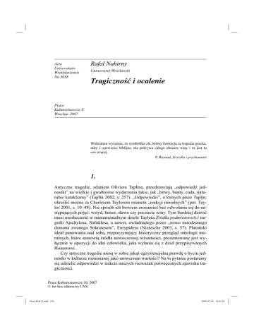 Acta Universitatis Wratislaviensis No 3038 Rafał Nahirny Uniwersytet Wrocławski Tragiczność i ocalenie Prace Kulturoznawcze X Wrocław 2007 Widziałem wyraźnie, że symbolika zła, której ilustracją są tragedia grecka, mity i opowieści biblijne, nie pokrywa całego obszaru winy i że jest tu coś więcej. P. Ricoeur, Krytyka i przekonanie 1. Antyczne tragedie, zdaniem Oliviera Taplina, przedstawiają „odpowiedź jednostki” na wielkie i gwałtowne wydarzenia takie, jak „bitwy, bunty, cuda, naturalne kataklizmy” (Taplin 2002, s. 257). „Odpowiedzi”, o których pisze Taplin, określić można za Charlesem Taylorem mianem „reakcji moralnych” (por. Taylor 2001, s. 10–48). Nie sposób ich bowiem zrozumieć bez odwołania się do następujących pojęć: wstyd, honor, sława czy poczucie winy. Tym bardziej dziwić musi nieobecność w monumentalnym dziele Taylora Źródła podmiotowości tragedii Ajschylosa, Sofoklesa, a nawet, owładniętego przez „nowo narodzonego demona zwanego Sokratesem”, Eurypidesa (Nietzsche 2003, s. 57). Platoński ideał panowania nad sobą, rozpoczynający historyczny przegląd ontologii moralnych, które stanowią źródła nowoczesnej tożsamości, prezentowany jest wyłącznie w opozycji do idei człowieka, jaka wyłania się z dzieł przypisywanych Homerowi. Czy antyczne tragedie niosą w sobie jakąś egzystencjalną prawdę o byciu jednostki w kulturze rozumianej jako uniwersum wartości? Na to pytanie postaramy się udzielić odpowiedzi w trakcie naszych rozważań poświęconych zjawisku tragiczności. Prace Kulturoznawcze 10, 2007 © for this edition by CNS Prace Kult X.indd 234 2008-07-28 14:01:28 235 Tragiczność i ocalenie 2. Hans-Georg Gadamer zagadnieniu wzajemnych uwikłań kultury i tragiczności, rozumianej przede wszystkim jako „moment pozaestetyczny” znajdujący swoją pełną artykulację w dziełach sztuki (por. Gadamer 2004, s. 193), poświęca wiele miejsca w swoich tekstach. Autor Prawdy i metody wielokrotnie podkreśla fakt, iż antyczna tragedia jest przejawem „zachodniej świadomości kulturowej” (Gadamer 2000, s. 188). W myśl interpretacji Gadamera mit o Prometeuszu ukazuje tragiczność jako nieusuwalny wymiar ludzkiej egzystencji, będący konsekwencją zamieszkiwania człowieka w świecie kultury. Z tego powodu niemiecki filozof o historii Prometeusza pisze, iż „w mitycznej formie interpretuje się tu tragedię kultury” (tamże, s. 188). Główny bohater dramatu Ajschylosa1, Prometeusz skowany, przekazuje ludziom „zdolność do »kultury«” (tamże, s. 191) – dar, który, zdaniem Gadamera, okazuje się darem paradoksalnym: „wszystkie kunszty kultury łączy to, że aczkolwiek zapewniają człowiekowi panowanie nad ziemią, nie mogą uchylić śmiertelności. Również Sofokles, opiewający w wielkiej pieśni chóru w Antygonie straszliwą wspaniałość człowieka, świadomy jest nieprzekraczalności tej granicy, która nie wyznacza kresu ludzkiej działalności kulturotwórczej, ale stanowi straszliwy początek i motyw działań jednostki” (tamże, s. 193). Niniejsze studium powstało również na marginesie rozważań nad pracą Marthy Nussbaum The Fragility of Goodness. Ustalenia poczynione przez autorkę tego fundamentalnego dla badań nad tragedią antyczną dzieła mogą zainteresować także badaczy kultury. Praca Nussbaum pomoże nam podjąć te aspekty relacji między tragicznością a kulturą, które pozostają poza sferą zainteresowania autora Prawdy i metody. Związek między „tym, co przygodne” a tragicznością, stanowiący główny problem The Fragility of Goodness, określać będzie więc perspektywę naszych rozważań. Podjęcie tej kwestii w planie teorii kultury pozwoli nam odsłonić ważne aspekty relacji człowieka ze światem dóbr i wartości. 3. Tragedie zawsze były twórczymi interpretacjami klasycznych mitów. Autor, nawiązując w swojej sztuce do jednego z nich, mógł liczyć na kompetencję wi1 Z tej perspektywy znaczącym jest też fakt, iż w pierwotnej wersji mitu Prometeusz jest tym, który daje ludziom ogień, natomiast w późniejszej staje się również stwórcą człowieka. W Platońskiej interpretacji tego mamy już do czynienia ze znaczącym przekształceniem. Dar ognia okazuje się niewystarczający. Ludzie nadal żyją jak zwierzęta. Dopiero gdy Zeus zdecyduje się obdarować ich poczuciem prawa, sprawiedliwości i bojaźnią, będą mogli żyć we wspólnocie, dopiero wtedy staną się ludźmi. Prace Kulturoznawcze 10, 2007 © for this edition by CNS Prace Kult X.indd 235 2008-07-28 14:01:28 236 Rafał Nahirny downi. Współczesność również ma swoje wersje antycznych mitów: „Bez wahania umieścimy więc Freuda za Sofoklesem wśród naszych źródeł mitu Edypa” (Levi-Strauss 2000, s. 195). Analiza Króla Edypa2 stała się podstawą do sformułowania przez Zygmunta Freuda teorii „kompleksu Edypa”. Freud od samego początku swojej praktyki psychoanalitycznej interesował się mitem opowiadającym tragiczną historię władcy Teb. W słynnym rozdziale Objaśniania marzeń sennych, w którym opisuje najczęściej powtarzające się sny, dużo miejsca poświęca dramatowi Sofoklesa. Twórca psychoanalizy oceniał nawet, że „późniejsze tragedie przeznaczenia nie miały żadnego oddziaływania” (Freud 1996, s. 231) oraz przyznawał, że „Król Edyp może wywołać u współczesnego człowieka wstrząs nie mniejszy niż u ówczesnych Greków” (tamże). Freud, poddając analizie przeżycia widowni, dochodzi do wniosku, iż „Los króla przejmuje nas tylko dlatego, że mógłby to być nasz los, ponieważ wyrocznia, jeszcze nim przyszliśmy na świat, rzuciła na nas taką samą klątwę, jak na niego. Tyle, że my być może poprzestaliśmy na tym, by pierwszą pobudkę seksualną skierować w stronę matki, pierwsze zaś nienawistne i agresywne życzenie zwrócić w stronę ojca – przekonują nas co do tego na