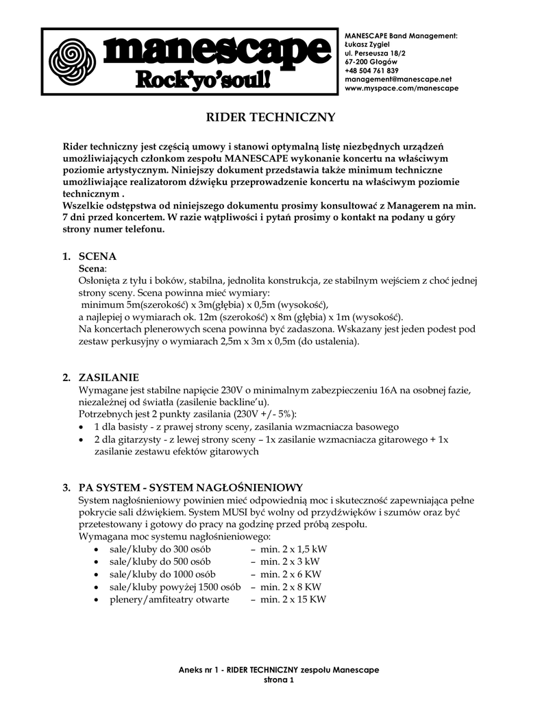 MANESCAPE Band Management: Łukasz Zygiel ul. Perseusza 18/2 67-200 Głogów +48 504 761 839 [email protected] www.myspace.com/manescape RIDER TECHNICZNY Rider techniczny jest częścią umowy i stanowi optymalną listę niezbędnych urządzeń umożliwiających członkom zespołu MANESCAPE wykonanie koncertu na właściwym poziomie artystycznym. Niniejszy dokument przedstawia także minimum techniczne umożliwiające realizatorom dźwięku przeprowadzenie koncertu na właściwym poziomie technicznym . Wszelkie odstępstwa od niniejszego dokumentu prosimy konsultować z Managerem na min. 7 dni przed koncertem. W razie wątpliwości i pytań prosimy o kontakt na podany u góry strony numer telefonu. 1. SCENA Scena: Osłonięta z tyłu i boków, stabilna, jednolita konstrukcja, ze stabilnym wejściem z choć jednej strony sceny. Scena powinna mieć wymiary: minimum 5m(szerokość) x 3m(głębia) x 0,5m (wysokość), a najlepiej o wymiarach ok. 12m (szerokość) x 8m (głębia) x 1m (wysokość). Na koncertach plenerowych scena powinna być zadaszona. Wskazany jest jeden podest pod zestaw perkusyjny o wymiarach 2,5m x 3m x 0,5m (do ustalenia). 2. ZASILANIE Wymagane jest stabilne napięcie 230V o minimalnym zabezpieczeniu 16A na osobnej fazie, niezależnej od światła (zasilenie backline’u). Potrzebnych jest 2 punkty zasilania (230V +/- 5%): • 1 dla basisty - z prawej strony sceny, zasilania wzmacniacza basowego • 2 dla gitarzysty - z lewej strony sceny – 1x zasilanie wzmacniacza gitarowego + 1x zasilanie zestawu efektów gitarowych 3. PA SYSTEM - SYSTEM NAGŁOŚNIENIOWY System nagłośnieniowy powinien mieć odpowiednią moc i skuteczność zapewniająca pełne pokrycie sali dźwiękiem. System MUSI być wolny od przydźwięków i szumów oraz być przetestowany i gotowy do pracy na godzinę przed próbą zespołu. Wymagana moc systemu nagłośnieniowego: • sale/kluby do 300 osób – min. 2 x 1,5 kW • sale/kluby do 500 osób – min. 2 x 3 kW • sale/kluby do 1000 osób – min. 2 x 6 KW • sale/kluby powyżej 1500 osób – min. 2 x 8 KW • plenery/amfiteatry otwarte – min. 2 x 15 KW Aneks nr 1 - RIDER TECHNICZNY zespołu Manescape strona 1 MANESCAPE Band Management: Łukasz Zygiel ul. Perseusza 18/2 67-200 Głogów +48 504 761 839 [email protected] www.myspace.com/manescape ? Akceptowane są systemy o wysokim standardzie, renomowanych firm: JBL (SRX i VERTEC), ZECK (FOCUS i ASP), DYNACORD, POLAUDIO (wyższe serie), MEYER SOUND, TURBOSOUND, MEYER, L-ACOUSTICS, KV AUDIO, ELECTROVOICE, HK AUDIO, EAW itp. Tylko za uprzednim uzgodnieniem dopuszczane są systemy nagłośnieniowe firm: YAMAHA, LEM, PEAVEY itp. oraz niektórych produktów firm JBL, ZECK, ELECTROVOICE (ELIMINATOR, FORCE itp.) NIE DOPUSZCZALNE są systemy nagłośnieniowe nie znanych nam firm i/lub tzw. „samoróbek”. 4. MIKSERY Mikser główny winien mieć minimum 24 kanały z wejściami mikrofonowymi, dwupunktowy korektor parametryczny na każdym kanale, możliwość zmiany polaryzacji wejścia, filtr dolnozaporowy, 6 podgrup, 4 AUX’y z możliwością przełączenia PRE i POST. Na wyjściu głównym winien mieć zinsertowany tercjowy korektor graficzny – KLARK TEKNIK, RANE, SABINE, ASHLY. Akceptowane są miksery firm: ALLEN & HEATH, SOUNDCRAFT (poza serią SPIRIT), MIDAS, CREST AUDIO, MACKIE (Onyx) i inne tej klasy oraz miksery cyfrowe Yamaha PM5D lub M7CL Nie dopuszczane są mixery firm takich jak VERMONA, BEHRINGER i domowych produkcji. Bezwzględnie nie akceptujemy mikserów cyfrowych. 5. PERYFERIA Kompresory, bramki i korektory (equalizery) z pełna regulacja wszystkich parametrów. Akceptowane są urządzenia firm BSS, DBX, DRAWMER, ASHLY, SYMMETRIX i inne tej klasy. Nie dopuszczalne jest zastosowanie urządzeń firmy BEHRINGER (z wyjątkiem MULTIGATE PRO), ADS, PHONIC itp. 6. PROCESORY EFEKTÓW Dla linii wokalu WYMAGANY jest procesor efektów typu pogłos: Lexicon lub Yamaha REV500, Yamaha SPX990 lub TC ELECTRONIC M-ONE itp. Aneks nr 1 - RIDER TECHNICZNY zespołu Manescape strona 2 MANESCAPE Band Management: Łukasz Zygiel ul. Perseusza 18/2 67-200 Głogów +48 504 761 839 [email protected] www.myspace.com/manescape 7. SYSTEM MONITOROWY Wymagany jest osobny system monitorowy (wraz z kompetentną osoba obsługującą) z mikserem posiadającym min 3 tory monitorowe. Na każdym torze musi być zainsertowany tercjowy korektor graficzny. Dopuszcza się użycie bramek w stole monitorowym. Użycie kompresorów w stole monitorowym tylko po uprzednim uzgodnieniu tego z Managerem zespołu. Monitory sceniczne muszą być wolne od przydźwięków i szumów oraz muszą zapewniać odpowiednia skuteczność i moc (min. 300W podłogowe i min. 600W drumfill (mile widziany aktywny lub pasywny subwoofer z dodatkowym wyjściem pełnopasmowym do miksera perkusisty - pełnopasmowe 15’’LF + 2’’HF). Preferujemy monitory firm TURBOSOUND, EAW, RCF, NEXO, JBL (tylko SRX) i inne tej klasy. Na dużych scenach należy dodatkowo zapewnić nagłośnienie monitorowe sidefill stereo ustawione po obu stronach sceny. 8. GARDEROBY • 1 garderoba do dyspozycji członków zespołu: dobrze oświetlone lustra, wieszak metalowy, stół +5 krzeseł, gniazdka 220V, woda mineralna 3x 1,5l. (niegazowana Żywiec Zdrój) 9. UWAGI • • • • • • • • Potrzebni będą mili, doświadczeni i wyrozumiali miejscowi realizatorzy na przody i scenę, jeśli zespół przyjeżdża bez swojego akustyka. Stanowisko realizatora musi być ustawione w osi sceny na podeście nie wyższym niż 40 cm. Nie dopuszczamy ustawienia miksera na lub pod balkonami, antresolach, w rogach sali lub obok sceny. Aparatura nagłośnieniowa powinna być zainstalowana i sprawdzona na godzinę przed planowanym rozpoczęciem próby, przed przyjazdem realizatora i techniki zespołu. W przypadku rozpoczęcia koncertu przez innego wykonawcę, wymagane jest zabezpieczenie dla zespołu MANESCAPE minimum 16 kanałów miksera głównego lub osobnej konsolety z peryfer