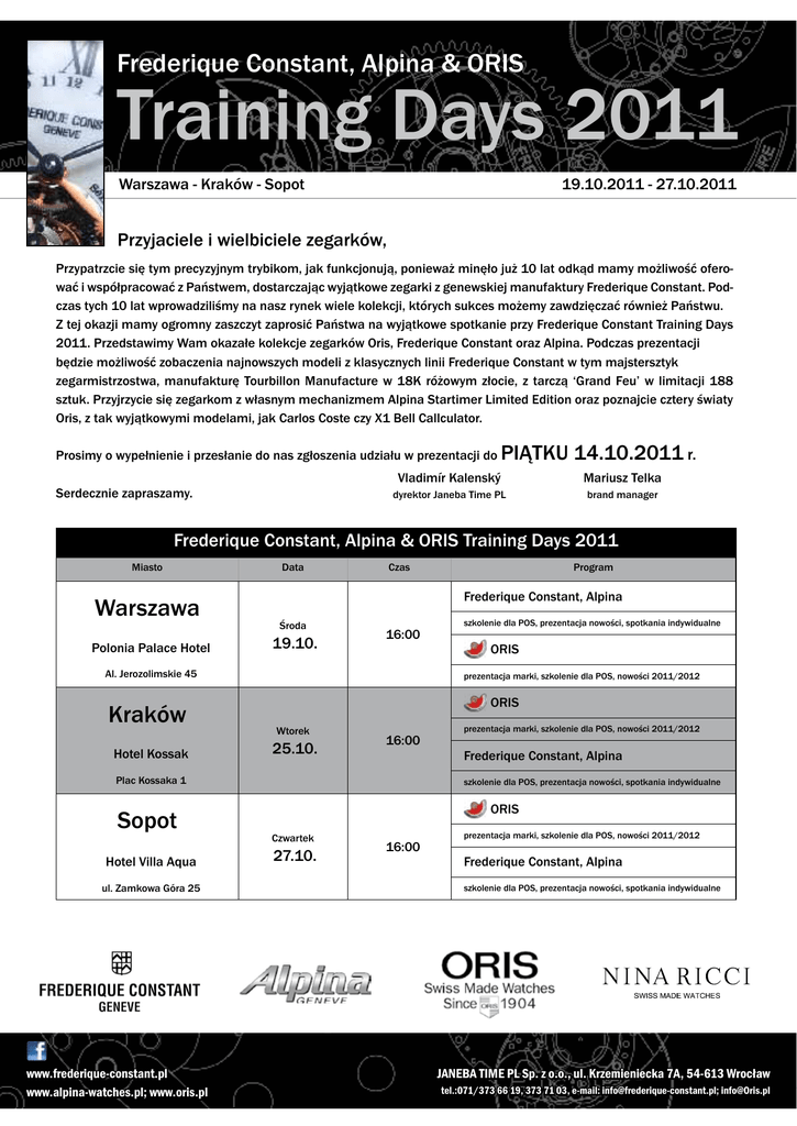 Frederique Constant, Alpina & ORIS Training Days 2011 Warszawa - Kraków - Sopot 19.10.2011 - 27.10.2011 Przyjaciele i wielbiciele zegarków, Przypatrzcie się tym precyzyjnym trybikom, jak funkcjonują, ponieważ minęło już 10 lat odkąd mamy możliwość oferować i współpracować z Państwem, dostarczając wyjątkowe zegarki z genewskiej manufaktury Frederique Constant. Podczas tych 10 lat wprowadziliśmy na nasz rynek wiele kolekcji, których sukces możemy zawdzięczać również Państwu. Z tej okazji mamy ogromny zaszczyt zaprosić Państwa na wyjątkowe spotkanie przy Frederique Constant Training Days 2011. Przedstawimy Wam okazałe kolekcje zegarków Oris, Frederique Constant oraz Alpina. Podczas prezentacji będzie możliwość zobaczenia najnowszych modeli z klasycznych linii Frederique Constant w tym majstersztyk zegarmistrzostwa, manufakturę Tourbillon Manufacture w 18K różowym złocie, z tarczą ‘Grand Feu’ w limitacji 188 sztuk. Przyjrzycie się zegarkom z własnym mechanizmem Alpina Startimer Limited Edition oraz poznajcie cztery światy Oris, z tak wyjątkowymi modelami, jak Carlos Coste czy X1 Bell Callculator. Prosimy o wypełnienie i przesłanie do nas zgłoszenia udziału w prezentacji do Serdecznie zapraszamy. PIĄTKU 14.10.2011 r. Vladimír Kalenský Mariusz Telka dyrektor Janeba Time PL brand manager Frederique Constant, Alpina & ORIS Training Days 2011 Miasto Warszawa Polonia Palace Hotel Data Czas Frederique Constant, Alpina Środa 19.10. 16:00 Al. Jerozolimskie 45 Kraków Hotel Kossak Hotel Villa Aqua ul. Zamkowa Góra 25 www.frederique-constant.pl www.alpina-watches.pl; www.oris.pl szkolenie dla POS, prezentacja nowości, spotkania indywidualne ORIS prezentacja marki, szkolenie dla POS, nowości 2011/2012 ORIS Wtorek 25.10. 16:00 Plac Kossaka 1 Sopot Program prezentacja marki, szkolenie dla POS, nowości 2011/2012 Frederique Constant, Alpina szkolenie dla POS, prezentacja nowości, spotkania indywidualne ORIS Czwartek 27.10. 16:00 prezentacja marki, szkolenie dla POS, nowości 2011/2012 Frederique Constant, Alpina szkolenie dla POS, prezentacja nowości, spotkania indywidualne JANEBA TIME PL Sp. z o.o., ul. Krzemieniecka 7A, 54-613 Wrocław tel.:071/373 66 19, 373 71 03, e-mail: [email protected]; [email protected] Frederique Constant, Alpina & ORIS Training Days 2011 Warszawa - Kraków - Sopot 19.10.2011 - 27.10.2011 Lp. Kraków Sopot Tylko dla członków Klubu Miłośników Zegarów i Zegarków Warszawa Zgłoszenie udziału w prezentacji: 19.10 25.10 27.10 Imię i nazwisko nr tel. kontaktowego 1 2 3 4 5 6 7 Ilość osób: Zgłoszenie udziału prosimy wysłać najpóźniej do dnia 14.10. pod nr faxu: 071/357 49 39 lub telefonicznie p. Mariusz Telka: tel. kom. 0508 183 594, [email protected], [email protected] Program szkolenia i prezentacji: * Frederique Constant, Alpina - „Sales Training“ - szkolenie dla personelu sklepów -> fakty, argumenty sprzedaży - szczegółowa prezentacja kolekcji / nowości, ...) - wystawa kolekcji - nowości 2011/2012 (Frederique Constant, Alpina, Nina Ricci, ORIS) * ORIS - „Sales Training“ - szczegółowa prezentacja marki - szczegółowa prezentacja kolekcji / nowości, ...) - wystawa - prezentacja kolekcji, nowości 2011/2012 (ORIS) * (prosimy o rezerwację terminu spotkania) www.frederique-constant.pl www.alpina-watches.pl; www.oris.pl JANEBA TIME PL Sp. z o.o., ul. Krzemieniecka 7A, 54-613 Wrocław tel.:071/373 66 19, 373 71 03, e-mail: [email protected]; [email protected]