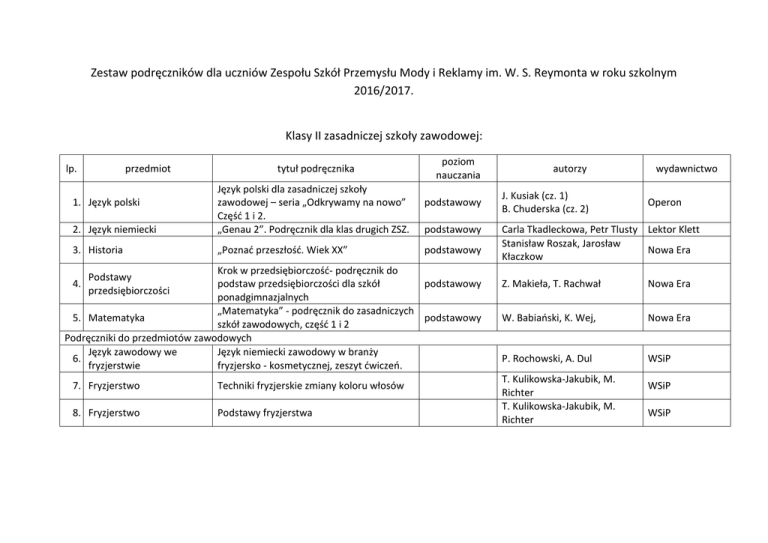 Zestaw podręczników dla uczniów Zespołu Szkół Przemysłu Mody i Reklamy im. W. S. Reymonta w roku szkolnym 2016/2017. Klasy II zasadniczej szkoły zawodowej: lp. przedmiot tytuł podręcznika 2. Język niemiecki Język polski dla zasadniczej szkoły zawodowej – seria „Odkrywamy na nowo” Część 1 i 2. „Genau 2”. Podręcznik dla klas drugich ZSZ. 3. Historia „Poznać przeszłość. Wiek XX” 1. Język polski poziom nauczania autorzy podstawowy J. Kusiak (cz. 1) B. Chuderska (cz. 2) podstawowy podstawowy Krok w przedsiębiorczość- podręcznik do podstaw przedsiębiorczości dla szkół podstawowy ponadgimnazjalnych „Matematyka” - podręcznik do zasadniczych 5. Matematyka podstawowy szkół zawodowych, część 1 i 2 Podręczniki do przedmiotów zawodowych Język zawodowy we Język niemiecki zawodowy w branży 6. fryzjerstwie fryzjersko - kosmetycznej, zeszyt ćwiczeń. 4. Podstawy przedsiębiorczości 7. Fryzjerstwo Techniki fryzjerskie zmiany koloru włosów 8. Fryzjerstwo Podstawy fryzjerstwa wydawnictwo Operon Carla Tkadleckowa, Petr Tlusty Lektor Klett Stanisław Roszak, Jarosław Nowa Era Kłaczkow Z. Makieła, T. Rachwał Nowa Era W. Babiański, K. Wej, Nowa Era P. Rochowski, A. Dul WSiP T. Kulikowska-Jakubik, M. Richter T. Kulikowska-Jakubik, M. Richter WSiP WSiP Klasy III zasadniczej szkoły zawodowej: lp. przedmiot tytuł podręcznika Język polski dla zasadniczej szkoły 1. Język polski zawodowej – seria „Odkrywamy na nowo” Część 2. 2. Język niemiecki Genau 3 Podręcznik dla klas drugich ZSZ. 3. Wiedza o społeczeństwie „W centrum uwagi” „Matematyka” - podręcznik do zasadniczych 4. Matematyka szkół zawodowych, część 2 Podręczniki do przedmiotów zawodowych Język zawodowy we Język niemiecki zawodowy w branży 5. fryzjerstwie fryzjersko - kosmetycznej, zeszyt ćwiczeń. Język zawodowy w 6. kl. III - brak podręcznika stolarstwie Działalność usługowa we „Działalność usługowa we fryzjerstwie. 7. fryzjerstwie Fryzjerstwo – tom III” Techniki fryzjerskie strzyżenia włosów, 8. Fryzjerstwo formowania fryzur i ondulowania poziom nauczania autorzy podstawowy B. Chuderska (cz. 2) podstawowy podstawowy Carla Tkadleckowa, Petr Tlusty Lektor Klett Arkadiusz Janicki Nowa Era podstawowy W. Babiański, K. Wej, Nowa Era P. Rochowski, A. Dul WSiP I. Sarna WSiP – rea T. Kulikowska-Jakubik, M. Richter WSiP wydawnictwo Operon