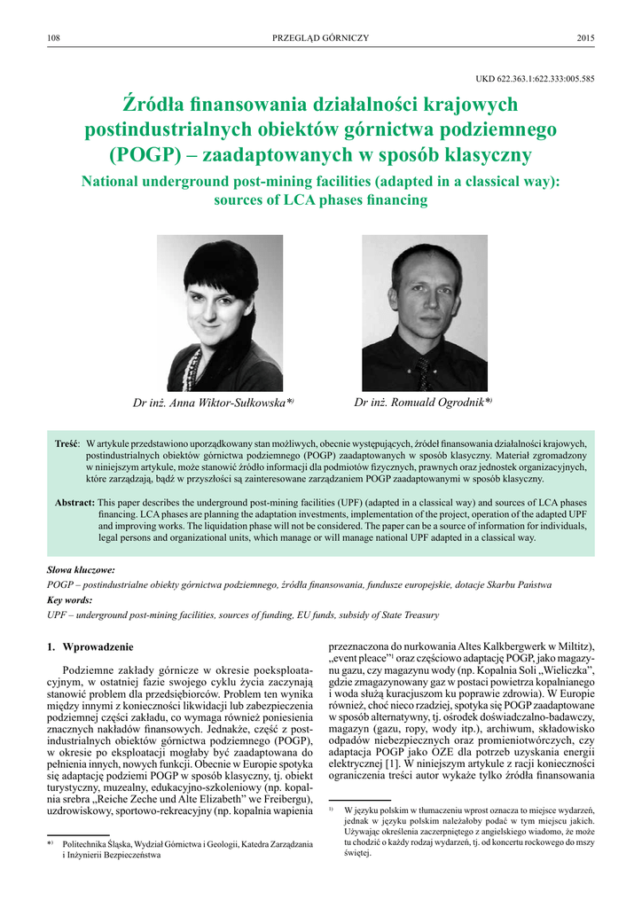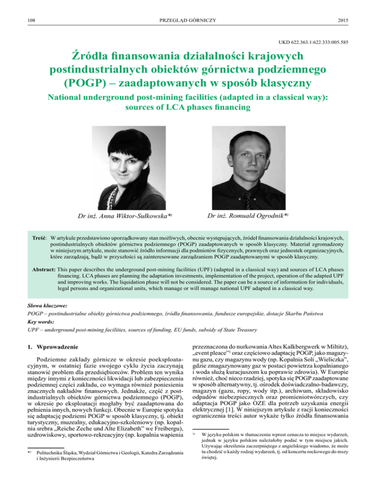 108 PRZEGLĄD GÓRNICZY 2015 UKD 622.363.1:622.333:005.585 Źródła finansowania działalności krajowych postindustrialnych obiektów górnictwa podziemnego (POGP) – zaadaptowanych w sposób klasyczny National underground post-mining facilities (adapted in a classical way): sources of LCA phases financing Dr inż. Romuald Ogrodnik*) Dr inż. Anna Wiktor-Sułkowska*) Treść: W artykule przedstawiono uporządkowany stan możliwych, obecnie występujących, źródeł finansowania działalności krajowych, postindustrialnych obiektów górnictwa podziemnego (POGP) zaadaptowanych w sposób klasyczny. Materiał zgromadzony w niniejszym artykule, może stanowić źródło informacji dla podmiotów fizycznych, prawnych oraz jednostek organizacyjnych, które zarządzają, bądź w przyszłości są zainteresowane zarządzaniem POGP zaadaptowanymi w sposób klasyczny. Abstract: This paper describes the underground post-mining facilities (UPF) (adapted in a classical way) and sources of LCA phases financing. LCA phases are planning the adaptation investments, implementation of the project, operation of the adapted UPF and improving works. The liquidation phase will not be considered. The paper can be a source of information for individuals, legal persons and organizational units, which manage or will manage national UPF adapted in a classical way. Słowa kluczowe: POGP – postindustrialne obiekty górnictwa podziemnego, źródła finansowania, fundusze europejskie, dotacje Skarbu Państwa Key words: UPF – underground post-mining facilities, sources of funding, EU funds, subsidy of State Treasury 1. Wprowadzenie Podziemne zakłady górnicze w okresie poeksploatacyjnym, w ostatniej fazie swojego cyklu życia zaczynają stanowić problem dla przedsiębiorców. Problem ten wynika między innymi z konieczności likwidacji lub zabezpieczenia podziemnej części zakładu, co wymaga również poniesienia znacznych nakładów finansowych. Jednakże, część z postindustrialnych obiektów górnictwa podziemnego (POGP), w okresie po eksploatacji mogłaby być zaadaptowana do pełnienia innych, nowych funkcji. Obecnie w Europie spotyka się adaptację podziemi POGP w sposób klasyczny, tj. obiekt turystyczny, muzealny, edukacyjno-szkoleniowy (np. kopalnia srebra „Reiche Zeche und Alte Elizabeth” we Freibergu), uzdrowiskowy, sportowo-rekreacyjny (np. kopalnia wapienia *) Politechnika Śląska, Wydział Górnictwa i Geologii, Katedra Zarządzania i Inżynierii Bezpieczeństwa przeznaczona do nurkowania Altes Kalkbergwerk w Miltitz), „event pleace”1 oraz częściowo adaptację POGP, jako magazynu gazu, czy magazynu wody (np. Kopalnia Soli „Wieliczka”, gdzie zmagazynowany gaz w postaci powietrza kopalnianego i woda służą kuracjuszom ku poprawie zdrowia). W Europie również, choć nieco rzadziej, spotyka się POGP zaadaptowane w sposób alternatywny, tj. ośrodek doświadczalno-badawczy, magazyn (gazu, ropy, wody itp.), archiwum, składowisko odpadów niebezpiecznych oraz promieniotwórczych, czy adaptacja POGP jako OZE dla potrzeb uzyskania energii elektrycznej [1]. W niniejszym artykule z racji konieczności ograniczenia treści autor wykaże tylko źródła finansowania 1) W języku polskim w tłumaczeniu wprost oznacza to miejsce wydarzeń, jednak w języku polskim należałoby podać w tym miejscu jakich. Używając określenia zaczerpniętego z angielskiego wiadomo, że może tu chodzić o każdy rodzaj wydarzeń, tj. od koncertu rockowego do mszy świętej. Nr 8 PRZEGLĄD GÓRNICZY działalności krajowych POGP zaadaptowanych w sposób klasyczny. 2. Występujące źródła finansowania POGP na etapie planowania, implementacji i ulepszeń W procesie adaptacji POGP do pełnienia nowych funkcji można wyszczególnić trzy podstawowe etapy, tj. planowania, implementacji oraz etap operacyjny. Ponadto, w niektórych przypadkach występuje etap ulepszeń. Winno się również mieć na uwadze etap likwidacji. Etap ten występuje rzadko i ma szczególny charakter w każdym z przypadków, w zawiązku z tym zostanie on pominięty w niniejszym artykule. Na etapie planowania przeprowadza się konieczne ekspertyzy i badania, mające na celu określić powodzenie procesu adaptacji. Ten etap, w porównaniu z pozostałymi, generuje niewielkie koszty (maksymalnie do paruset tysięcy złotych), które głównie pokrywane są przez przedsiębiorcę2. Wysokie koszty natomiast są generowane na etapie implementacji oraz na etapie ulepszeń. Koszty te przeważnie wynoszą od kilku do kilkudziesięciu milionów złotych. Przedsiębiorca jest w stanie sam sfinansować inwestycję w przypadku małych obiektów (np. Dawna Kopalnia Szklary „Niccolum”[2]), adaptowanych do celów klasycznych oraz małych obiektów adaptowanych do celów alternatywnych, tj. archiwum, magazyn żywności, magazyn wody. Pomoc finansowa ze źródeł zewnętrznych jest potrzebna w przypadku inwestycji związanych z etapem implementacji i ulepszania większych POGP, zarówno do celów klasycznych, jak i alternatywnych. 109 W tablicy 1 wyszczególniono występujące koszty projektów oraz jednorazowe dotacje ze źródeł zewnętrznych przeznaczone na etap implementacji („Główna Kluczowa Sztolnia Dziedziczna” (GKSD), jako składowa Europejskiego Ośrodka Kultury Technicznej i Turystyki Przemysłowej (EOKTiTP)) oraz na etap ulepszania krajowych POGP w latach 2007-20133 . Z tablicy wynika, że w latach 2007÷2013 największa suma dotacji jednorazowych w kwocie 41 mln zł została przeznaczona na Europejski Ośrodek Kultury Technicznej i Turystyki Przemysłowej (EOKTiTP). EOKTiTP jest to duży projekt mający na celu utworzenie w Zabrzu jednego z największych ośrodków turystyki poprzemysłowej [3]. W latach 2007÷2013 wartość projektów realizowanych dla POGP wyniosła 179,9 mln zł, z czego 84,6 mln zł zostało pokryte przez dotacje z zewnętrznych źródeł. Dla porównania na projekty obejmujące rewitalizację obiektów n