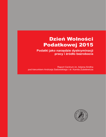 Dzień Wolności Podatkowej 2015 Podatki jako narzędzie dyskryminacji pracy i źródło bezrobocia Raport Centrum im. Adama Smitha pod kierunkiem Andrzeja Sadowskiego i dr. Kamila Zubelewicza Dzień Wolności Podatkowej 2015 Podatki jako narzędzie dyskryminacji pracy i źródło bezrobocia Raport Centrum im. Adama Smitha pod kierunkiem Andrzeja Sadowskiego i dr. Kamila Zubelewicza Warszawa, czerwiec 2015 Dzień Wolności Podatkowej 2015 Andrzej Sadowski, Kamil Zubelewicz Copyright Centrum im. Adama Smitha – Pierwszy Niezależny Instytut w Polsce, 2015 Wydawca Centrum im. Adama Smitha ul. Bednarska 16, 00-321 Warszawa tel. 22 828 47 07 e-mail:[email protected] facebook.com/centrumadamasmitha Korekta Bogusława Jędrasik Skład: Biuro Edytorsko-Usługowe DANMAR www.danmar.waw.pl Druk Drukarnia Etrax ISBN 978-83-86885-48-0 Dzień Wolności Podatkowej 2015 Centrum im. Adama Smitha Podatki jako narzędzie dyskryminacji pracy i źródło bezrobocia Centrum im. Adama Smitha z inicjatywy Dane pochodzą z uzasadnienia do budżetu ogłasza Dzień Wolności Podatkowej. Finansów, konfrontowane z danymi Eurostatu Krzysztofa Dzierżawskiego od 1994 roku W tym roku obchodzimy go w Polsce po raz dwudziesty drugi. To umowne święto płacącego podatki obywatela po raz kolejny w najnowszej historii przypada na pierwszą połowę czerwca, w 2015 na jedenasty dzień tego miesiąca. Idea Dnia Wolności Podatkowej narodziła się Stanach Zjednoczonych. Pierwszy raz został obliczony w 1900 roku i przypadł na koniec stycznia. Wtedy to koszty rządu (federalnego i stanowych), jak nazywał te wydatki prof. Milton Friedman, wynosiły 2 procent ówczesnego PKB! Dzień Wolności Podatkowej jest symboliczną datą, kiedy przestajemy przymusowo pracować na potrzeby rządu i zaczynamy opracowywanego przez Ministerstwo oraz innych oficjalnych źródeł. Inicjując oraz ogłaszając Dzień Wolności Podatkowej, chcemy zwrócić uwagę na wysoki poziom łącznych obciążeń w naszym kraju, zwłaszcza na głęboko dyskryminacyjny charakter opodatkowania pracy. Daniny nałożone na przeciętne wynagrodzenie sięgają już ponad 69 proc. płacy netto! Mimo że w raportach rządowych stwierdza się, że łączne wysokie opodatkowanie pracy ZUS-em, składkami i podatkami stanowi główną przyczynę bezrobocia w Polsce, to rządzący podwyższyli opodatkowanie także umów cywilnoprawnych. Tak jak w przeszłości podwyższanie obciążeń na pracę, tak i teraz musi przynieść negatywne skutki. Do obliczenia Dnia Wolności Podatkowej Przeciążenie podatkowe pracy i marginalny podatek od przedsiębiorstw CIT publicznych (budżet państwa, samorządów, Łączne wydatki sektora finansów Krajowego Brutto. 784 miliardów PLN, co przekłada się na ich pracować dla siebie i dla naszych rodzin. służy stosunek udziału wszystkich wydatków rządowe fundusze celowe itp.) do Produktu publicznych (s.f.p.) w Polsce mają sięgnąć 3 Dzień Wolności Podatkowej 2015 44-procentowy udział w PKB. Skąd pochodzą tak olbrzymie środki? Źródłem 83 miliardów złotych mają być pożyczki, pozostałe 702 miliardy złotych to przede wszystkim dochody s.f.p. Wśród nich dominują daniny obciążające pracę VAT, akcyza i VAT od akcyzy. Z tych tytułów planuje się zebrać 213 miliardów PLN. Trzecie pod względem istotności są środki z Unii Europejskiej, dające 79 miliardów PLN. Podatek dochodowy od osób prawnych przyniesie tylko 31 miliardów PLN. Pozostałe źródła dochodów, bardzo liczne i przedsiębiorczość, czyli: podatek dochodowy od osób fizycznych oraz podatki – nazwane składkami – zarządzane przez Zakład Ubezpieczeń Społecznych, Narodowy Fundusz Zdrowia, Fundusz Pracy i Fundusz Gwarantowanych Świadczeń Pracowniczych. Ze źródeł tych wpłynie aż 277 miliardów PLN. Tradycyjnie dopiero drugą pozycję zajmują daniny obciążające konsumpcję – i zróżnicowane, składają się na brakujące 14% środków sektora finansów publicznych. Od strony dochodowej rzuca się w oczy wzrost udziału obciążeń pracy w środkach publicznych. Mizerny udział środków z CIT raz jeszcze potwierdza tezę o marginalnym znaczeniu tego nieefektywnego podatku, który wiele przedsiębiorstw skutecznie omija. Tabela 1. Planowana struktura środków publicznych w Polsce w 2015 roku L.p. Danina Udział w środkach sektora finansów publicznych 1. Daniny obciążające pracę i przedsiębiorczość (ZUS, FP, NFZ, PIT) 39,50% 2. Daniny obciążające konsumpcję (VAT, akcyza) 30,31% 3. Środki z UE 11,32% 4. Podatek dochodowy od osób prawnych (CIT) 5. Pozostałe dziesiątki danin 4,40% 14,47% Źródło: Ustawa budżetowa na rok 2015. Uzasadnienie, Rada Ministrów, Warszawa 2014 4 Dzień Wolności Podatkowej 2015 Centrum im. Adama Smitha Wykres 1. Planowana struktura środków publicznych w Polsce w 2015 roku 702 miliardy złotych ogółem Źródło: Ustawa budżetowa na rok 2015. Uzasadnienie, Rada Ministrów, Warszawa 2014 Tabela 2. Planowana szczegółowa struktura środków publicznych w Polsce w 2015 roku L.p. Danina 1. 2. 3. Składki na ZUS, NFZ, FP, FGŚP i inne PIT VAT 4. 5. 6. VAT od akcyzy Akcyza UE 7. 8. 9. CIT Pozostałe Ogółem Suma częściowa (w mld PLN) 195,16 277,31 82,15 134,63 212,82 14,62 63,57 Kwota 79,46 79,46 30,90 101,56 702,05 30,90 101,56 702,05 Źródło: Ustawa budżetowa na rok 2015. Uzasadnienie, Rada Ministrów, Warszawa 2014 5 Dzień Wolności Podatkowej 2015 Tabela 3. Planowana struktura wydatków publicznych w Polsce w 2015 roku L.p. Wydatki Udział w wydatkach sektora finansów publicznych 1. Świadczenia na rzecz osób fizycznych 38,33% 2. Wydatki majątkowe 14,05% 3. Obsługa długu publicznego 4,56% 4. Środki własne UE 2,31% 5. Pozostałe wydatki 40,75% Źródło: Ustawa budżetowa na rok 2015. Uzasadnienie, Rada Ministrów, Warszawa 2014 Wykres 2. Planowana struktura wydatków publicznych w Polsce w 2015 roku 785 miliardów złotych ogółem Źródło: Ustawa budżetow