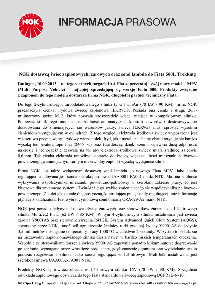 NGK dostawcą świec zapłonowych, żarowych oraz sond lambda do Fiata 500L Trekking Ratingen, 10.09.2013 – na tegorocznych targach IAA Fiat zaprezentuje swój nowy model – MPV (Multi Purpose Vehicle) – najlepiej sprzedającą się wersję Fiata 500. Produkty związane z zapłonem do tego modelu dostarcza firma NGK, długoletni partner techniczny Fiata. Do tego 2-cylindrowego, turbodoładowanego silnika typu TwinAir (70 kW / 90 KM), firma NGK przeznaczyła cienką, irydową świecę zapłonową ILKR9G8. Posiada ona cienki i długi, 26,5milimetrowy gwint M12, który pozwala zaoszczędzić więcej miejsca w kompaktowym silniku. Ponieważ silnik tego modelu ma zdolność automatycznej kontroli zaworów i dostosowywania doładowania do zmieniających się warunków jazdy, świeca ILKR9G8 musi sprostać wysokim ciśnieniom występującym w cylindrach. Z tego względu elektroda środkowa świecy wyposażona jest w laserowo przyspawany, irydowy wierzchołek. Iryd, jako metal szlachetny charakteryzuje się bardzo wysoką temperaturą topnienia (2466 °C) oraz twardością, dzięki czemu zapewnia dużą odporność na erozję i jednocześnie zezwala na to, aby elektroda środkowa świecy miała średnicę zaledwie 0,6 mm. Tak cienka elektroda umożliwia dotarcie do świecy większej ilości mieszanki paliwowopowietrznej, gwarantując tym samym niezawodny zapłon i wysoką wydajność silnika. Firma NGK jest także wyłącznym dostawcą sond lambda do nowego Fiata MPV. Jako sonda regulująca instalowana jest sonda szerokopasmowa UAA0001-FA001 marki NTK. Ma ona zdolność wykrywania współczynnika mieszanki powietrzno-paliwowej w szerokim zakresie pracy, co jest kluczowe dla zmiennego systemu TwinAir i jego szybko zmieniającego się współczynnika paliwowopowietrznego. Z kolei jako sondę diagnostyczną, kontrolującą pracę sondy regulującej oraz informację płynącą z katalizatora, Fiat wybrał cyrkonową sond binarną OZA629-A2 marki NTK. NGK jest ponadto jedynym dostawcą świec żarowych oraz sterowników żarzenia do 1,3-litrowego silnika MultiJet2 Fiata (62 kW / 85 KM). W tym 4-cylindrowym silniku instalowana jest świeca żarowa Y9001AS oraz sterownik żarzenia R41GK. System Advanced Quick Glow System (AQGS), stworzony przez NGK, umożliwił ograniczenie średnicy rurki grzejnej świecy Y9001AS do jedynie 3,5 milimetrów i osiąganie temperatury pracy 1000 °C w zaledwie 2 sekundy. Wszystko to składa się na niezawodny zapłon omawianego silnika diesla nawet w bardzo niskich temperaturach otoczenia. Wspólnie ze sterownikami żarzenia świeca Y9001AS zapewnia ponadto kilkuminutowe dogrzewanie po zapłonie, wymagane przez włoskiego producenta, gdyż znacznie ogranicza ono wydzielanie spalin podczas rozgrzewania silnika. Jako sonda regulująca w 1,3-litrowym MultiJet2 instalowana jest szerokopasmowa UAA0002-FA001 NTK. Produkty NGK są również obecne w 1,4-litrowym silniku 16V (70 kW / 90 KM). Specjalista od układu zapłonowego dostarcza do tego Fiata standardową świecę zapłonową DCPR7E-N-10. NGK Spark Plug Europe GmbH Sp.z o.o.•ul. T.Rejtana 17 lok.10•02-516 Warszawa•Tel. +48 22 646 35 60•www.ngkntk.pl Informacje dodatkowe: Firma NGK jest wiodącym światowym producentem świec zapłonowych oraz sond lambda, posiadającym fabryki i biura handlowe we wszystkich częściach świata. Zatrudnia 10.000 pracowników, którzy przyczyniają się do obrotów w wysokości ok. 2,0 miliardów euro. NGK jest obecna na wszystkich kontynentach, posiada 8 centrów handlowych, 11 zakładów produkcyjnych oraz 14 biur handlowych. Bliższych informacji na temat sprzedaży produktów NGK udzielają importerzy i dystrybutorzy – adresy na stronie www.ngkntk.pl. Wrzesień 2013 Druk bezpłatny – Prosimy o egzemplarz darmowy NGK Spark Plug Europe GmbH Dział Prasowy Harkortstr. 41, 40880 Ratingen Niemcy Tel.: (+49)2102/974-102, E-Mail: [email protected] Informacje w Polsce tel. (022) 646 35 60 www.ngkntk.pl NGK Spark Plug Europe GmbH Sp.z o.o.•ul. T.Rejtana 17 lok.10•02-516 Warszawa•Tel. +48 22 646 35 60•www.ngkntk.pl