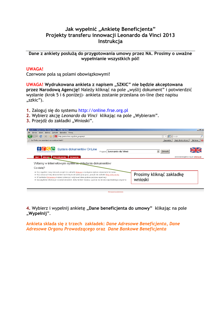 Jak wypełnić „Ankietę Beneficjenta” Projekty transferu innowacji Leonardo da Vinci 2013 Instrukcja Dane z ankiety posłużą do przygotowania umowy przez NA. Prosimy o uważne wypełnianie wszystkich pól! UWAGA! Czerwone pola są polami obowiązkowymi! UWAGA! Wydrukowana ankieta z napisem „SZKIC” nie będzie akceptowana przez Narodową Agencję! Należy kliknąć na pole „wyślij dokument” i potwierdzić wysłanie (krok 5 i 6 poniżej)- ankieta zostanie przesłana on-line (bez napisu „szkic”). 1. Zaloguj się do systemu http://online.frse.org.pl 2. Wybierz akcję Leonardo da Vinci klikając na pole „Wybieram”. 3. Przejdź do zakładki „Wnioski”. Prosimy kliknąć zakładkę wnioski 4. Wybierz i wypełnij ankietę „Dane beneficjenta do umowy” klikając na pole „Wypełnij”. Ankieta składa się z trzech zakładek: Dane Adresowe Beneficjenta, Dane Adresowe Organu Prowadzącego oraz Dane Bankowe Beneficjenta (LDV/2013/TOI/ANK ) LDV/2011/TOI/ANKLDV/2011/TOI/ANK Dane Adresowe Beneficjenta Dane Adresowe Beneficjenta Należy wypełnić wszystkie pola. Nr projektu- prosimy wpisać numer projektu podany przez NA w piśmie z wynikami selekcji Hasło weryfikacyjne - 9 znaków (liter i/lub cyfr). Prosimy wpisać hasło podane przez NA w piśmie z wynikami selekcji Dane Adresowe Organu Prowadzącego Instytucje (np. szkoły) posiadające organ prowadzący prosimy o podanie danych organu. UWAGA: Prosimy o podawanie poprawnych nazw organów prowadzących, tj. np. Województwo Mazowieckie (a nie Urząd Wojewódzki), Gmina Liszki (a nie Urząd Gminy), Miasto Siedlce (a nie Urząd Miasta), Powiat Skarżyski (a nie Starostwo Powiatowe). Instytucje nie posiadające organu prowadzącego wybierają „nie”. Dane Bankowe Beneficjenta Należy podać dokładne dane rachunku bankowego, na który zostanie przekazane dofinansowanie (w podanym formacie: XX XXXX XXXX XXXX XXXX XXXX XXXX). W celu uniknięcia strat wynikających z różnic kursowych, zalecane jest prowadzenie na potrzeby projektu konta walutowego w euro. 5. Po wypełnieniu wszystkich obowiązkowych rubryk, należy kliknąć pole „Wyślij dokument”. 6. Potwierdź opcję wysyłania dokumentu klikając na pole „Tak, wyślij dokument”ankieta zostanie przesłana on-line. 7. Kliknij na „Drukuj” w celu wydrukowania dokumentu. W razie pytań prosimy o kontakt: [email protected].