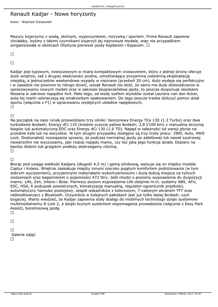 AutoRok.PL / DesignForum.PL Renault Kadjar - Nowe horyzonty Autor: Wojciech Sierpowski Mazury kojarzymy z wodą, słońcem, wypoczynkiem, rozrywką i sportem. Firma Renault zapewne chciałaby, byśmy z takimi czynnikami kojarzyli jej najnowsze modele, więc nie przypadkiem zorganizowała w okolicach Olsztyna pierwsze jazdy Kajdarem i Espacem. Kadjar jest typowym, nowoczesnym w miarę kompaktowym crossoverem, który z jednej strony oferuje duże wnętrze, zaś z drugiej właściwości jezdne, umożliwiające przyjemną codzienną eksploatację miejską, a jednocześnie weekendowe wypady w nieznane (prześwit 20 cm). Auto wydaje się perfekcyjne i w zasadzie nie powinno to nikogo dziwić, wszak Renault nie dość, że samo ma duże doświadczenie w opracowywaniu nowych modeli oraz w zakresie bezpieczeństwa jazdy, to jeszcze dysponuje zasobami Nissana w zakresie napędów 4x4. Mało tego, od kiedy szefem stylistów został Laurens van den Acker, auta tej marki odznaczają się smakowitym opakowaniem. Do tego jeszcze trzeba doliczyć pomoc dział sportu (włącznie z F1) w opracowaniu wydajnych układów napędowych. Na początek na nasz rynek przewidziano trzy silniki: benzynowy Energy TCe 130 (1.2 Turbo) oraz dwa turbodiesle – Energy dCi 110 (średnie zużycie paliwa – 3,8 l/100 km) z manualną skrzynią biegów lub automatyczną EDC oraz Energy dCi 130 (1.6 TD). Napęd w zależności od wersji płynie na przednie koła lub na wszystkie. W tym drugim przypadku dostępne są trzy tryby pracy: 2WD, Auto, 4WD Lock. Doskonałość rozwiązania sprawia, że podczas normalnej jazdy po asfaltowej lub nawet szutrowej nawierzchni nie wyczuwamy, jaki rodzaj napędu mamy, czy też jaka jego funkcja działa. Dopiero na bardzo śliskim lub grząskim podłożu dostrzegamy różnicę. Biorąc pod uwagę wielkość Kadjara (długość 4,5 m) i gamę silnikową, wpisuje się on między modele Captur i Koleos. Wnętrze zaskakuje między innymi szeroko pojętym komfortem podróżowania (w tym dobrym wyciszeniem), przyjemnymi materiałami wykończeniowymi i dużą ilością miejsca na tylnych siedzeniach oraz bagażnikiem o pojemności 472 litry. Jeśli chodzi o poziomy wyposażenia do dyspozycji mamy: Life, Zen, Intens i Bose. Pierwszy poziom wyposażenia Life obejmie m.in. systemy ABS, AFU, ESC, HSA, 6 poduszek powietrznych, klimatyzację manualną, regulator-ogranicznik prędkości, automatyczny hamulec postojowy, zespół wskaźników z kolorowym, 7-calowym ekranem TFT oraz radioodtwarzacz z Bluetooth. Oczywiście w kolejnych pakietach jest już tylko lepiej – czyli bogaciej. Warto wiedzieć, że Kadjar zapewnia stały dostęp do mobilnych technologii dzięki systemowi multimedialnemu R-Link 2, a dzięki licznym systemom wspomagania prowadzenia (włącznie z Easy Park Assist), bezstresową jazdę. Galeria zdjęć http://mas.auto.pl Kreator PDF Utworzono 4 March, 2017, 05:47