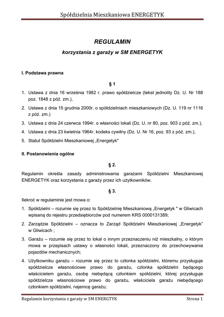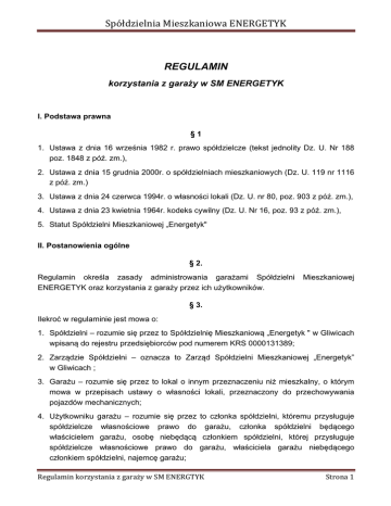 SpółdzielniaMieszkaniowaENERGETYK REGULAMIN korzystania z garaży w SM ENERGETYK I. Podstawa prawna §1 1. Ustawa z dnia 16 września 1982 r. prawo spółdzielcze (tekst jednolity Dz. U. Nr 188 poz. 1848 z póź. zm.), 2. Ustawa z dnia 15 grudnia 2000r. o spółdzielniach mieszkaniowych (Dz. U. 119 nr 1116 z póź. zm.) 3. Ustawa z dnia 24 czerwca 1994r. o własności lokali (Dz. U. nr 80, poz. 903 z póź. zm.), 4. Ustawa z dnia 23 kwietnia 1964r. kodeks cywilny (Dz. U. Nr 16, poz. 93 z póź. zm.), 5. Statut Spółdzielni Mieszkaniowej „Energetyk" II. Postanowienia ogólne § 2. Regulamin określa zasady administrowania garażami Spółdzielni ENERGETYK oraz korzystania z garaży przez ich użytkowników. Mieszkaniowej § 3. Ilekroć w regulaminie jest mowa o: 1. Spółdzielni – rozumie się przez to Spółdzielnię Mieszkaniową „Energetyk " w Gliwicach wpisaną do rejestru przedsiębiorców pod numerem KRS 0000131389; 2. Zarządzie Spółdzielni – oznacza to Zarząd Spółdzielni Mieszkaniowej „Energetyk” w Gliwicach ; 3. Garażu – rozumie się przez to lokal o innym przeznaczeniu niż mieszkalny, o którym mowa w przepisach ustawy o własności lokali, przeznaczony do przechowywania pojazdów mechanicznych; 4. Użytkowniku garażu – rozumie się przez to członka spółdzielni, któremu przysługuje spółdzielcze własnościowe prawo do garażu, członka spółdzielni będącego właścicielem garażu, osobę niebędącą członkiem spółdzielni, której przysługuje spółdzielcze własnościowe prawo do garażu, właściciela garażu niebędącego członkiem spółdzielni, najemcę garażu; RegulaminkorzystaniazgarażywSMENERGTYK Strona1 SpółdzielniaMieszkaniowaENERGETYK § 4. 1. Korzystanie z garaży administrowanych przez Spółdzielnię może być realizowane na następujących podstawach prawnych: 1) spółdzielczego własnościowego prawa, 2) prawa odrębnej własności, 3) prawa najmu. 2. Spółdzielcze własnościowe prawo do garażu jest ograniczonym prawem rzeczowym, prawem zbywalnym, przechodzi na spadkobierców i może być przedmiotem egzekucji. Na zbycie tego prawa nie jest wymagana zgoda Spółdzielni. 3. Odrębna własność garażu jest prawem zbywalnym, przechodzi na spadkobierców i może być przedmiotem egzekucji. Na zbycie tego prawa nie jest wymagana zgoda Spółdzielni. 4. Prawo najmu garażu nie może być przeniesione przez najemcę na inne osoby bez zgody Spółdzielni. Bez zgody Spółdzielni najemca garażu nie może także oddać go do bezpłatnego używania, ani podnająć innej osobie. Prawo to przechodzi na spadkobierców. Prawo z najmu nie może być generalnie przedmiotem egzekucji, jednak może zostać rozwiązane w razie zadłużenia. Prawo najmu garażu wygasa lub ulega rozwiązaniu w przypadkach określonych prawem i treścią zawartej umowy. 5. Garaże oddawane do korzystania na podstawie umowy najmu, oraz na podstawie spółdzielczego własnościowego prawa pozostają własnością Spółdzielni. 6. Do spółdzielczego własnościowego prawa do garażu stosuje się odpowiednie przepisy prawa o spółdzielczym własnościowym prawie do lokalu o innym przeznaczeniu niż lokal mieszkalny. III. Spółdzielcze własnościowe prawo do garażu i prawo odrębnej własności garażu. §5 1. Spółdzielcze własnościowe prawa do garażu ustanowione zgodnie z prawem na podstawie wcześniej obowiązujących przepisów zachowują swoją ważność. Nie ustanawia się nowych spółdzielczych własnościowych praw do garaży. 2. Przekazanie garażu przez Spółdzielnię na odrębną własność użytkownika następuje w drodze umowy zawartej w formie aktu notarialnego, w następujących przypadkach: a) w przypadkach określonych ustawami lub Statutem, albo b) w innych przypadkach uznanych za uzasadnione przez Zarząd Spółdzielni, po podjęciu stosownej uchwały przez Walne Zgromadzenie Członków. RegulaminkorzystaniazgarażywSMENERGTYK Strona2 SpółdzielniaMieszkaniowaENERGETYK 3. Osoby, które nabyły spółdzielcze własnościowe prawo do garażu lub prawo odrębnej własności garażu na jakiejkolwiek podstawie (np. w drodze darowizny, dziedziczenia, zapisu, wzajemnej zamiany lub kupna), wstępują we wszelkie prawa i obowiązki dotychczasowych użytkowników garażu. 4. Umowa zbycia spółdzielczego własnościowego prawa lub prawa odrębnej własności garażu zawierana jest w formie aktu notarialnego. 5. Osoba, której przysługuje spółdzielcze własnościowe prawo do garażu może wynajmować lub oddawać w bezpłatne używanie cały lub części garażu bez zgody spółdzielni, chyba że byłoby to związane ze zmianą sposobu korzystania z garażu lub przeznaczenia garażu bądź jego części na inny cel niż przechowywanie pojazdów mechanicznych. 6. W razie wynajęcia lub oddania garażu w bezpłatne używanie osobie trzeciej zarówno osoba, której przysługuje spółdzielcze własnościowe prawo do garażu, lub prawo jego odrębnej własności jak i osoba trzecia są zobowiązane wobec Spółdzielni do tego by garaż używany był zgodnie z niniejszym Regulaminem. 7. Jeżeli wynajęcie lub oddanie w bezpłatne używanie, o którym mowa w pkt. 5 i 6 powyżej, miałoby wpływ na wysokość opłat z tytułu eksploatacji garażu na rzecz spółdzielni, osoby, którym przysługuje spółdzielcze własnościowe prawo do garażu lub prawo jego odrębnej własności obowiązane są do pisemnego powiadomienia spółdzielni o tej czynności. 8. Umowy zawarte przez osobę, której przysługuje spółdzielcze własnościowe prawo do garażu, w sprawie korzystania z garażu lub jego części wygasają z mocy prawa najpóźniej z chwilą wygaśnięcia spółdzielczego prawa do tego lokalu. 9. Na zmianę sposobu korzystania z garażu lub przeznaczenia garażu lub jego części na inny cel niż przechowywanie pojazdów mechanicznych wymagana jest zgoda Spółdzielni. IV. Najem garażu §6 1. Garaże, stanowiące własność Spó