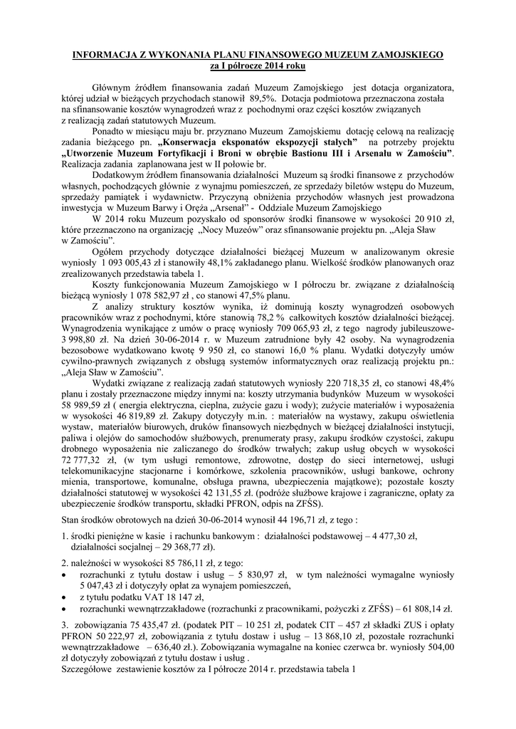 INFORMACJA Z WYKONANIA PLANU FINANSOWEGO MUZEUM ZAMOJSKIEGO za I półrocze 2014 roku Głównym źródłem finansowania zadań Muzeum Zamojskiego jest dotacja organizatora, której udział w bieżących przychodach stanowił 89,5%. Dotacja podmiotowa przeznaczona została na sfinansowanie kosztów wynagrodzeń wraz z pochodnymi oraz części kosztów związanych z realizacją zadań statutowych Muzeum. Ponadto w miesiącu maju br. przyznano Muzeum Zamojskiemu dotację celową na realizację zadania bieżącego pn. „Konserwacja eksponatów ekspozycji stałych” na potrzeby projektu „Utworzenie Muzeum Fortyfikacji i Broni w obrębie Bastionu III i Arsenału w Zamościu”. Realizacja zadania zaplanowana jest w II połowie br. Dodatkowym źródłem finansowania działalności Muzeum są środki finansowe z przychodów własnych, pochodzących głównie z wynajmu pomieszczeń, ze sprzedaży biletów wstępu do Muzeum, sprzedaży pamiątek i wydawnictw. Przyczyną obniżenia przychodów własnych jest prowadzona inwestycja w Muzeum Barwy i Oręża „Arsenał” - Oddziale Muzeum Zamojskiego W 2014 roku Muzeum pozyskało od sponsorów środki finansowe w wysokości 20 910 zł, które przeznaczono na organizację „Nocy Muzeów” oraz sfinansowanie projektu pn. „Aleja Sław w Zamościu”. Ogółem przychody dotyczące działalności bieżącej Muzeum w analizowanym okresie wyniosły 1 093 005,43 zł i stanowiły 48,1% zakładanego planu. Wielkość środków planowanych oraz zrealizowanych przedstawia tabela 1. Koszty funkcjonowania Muzeum Zamojskiego w I półroczu br. związane z działalnością bieżącą wyniosły 1 078 582,97 zł , co stanowi 47,5% planu. Z analizy struktury kosztów wynika, iż dominują koszty wynagrodzeń osobowych pracowników wraz z pochodnymi, które stanowią 78,2 % całkowitych kosztów działalności bieżącej. Wynagrodzenia wynikające z umów o pracę wyniosły 709 065,93 zł, z tego nagrody jubileuszowe3 998,80 zł. Na dzień 30-06-2014 r. w Muzeum zatrudnione były 42 osoby. Na wynagrodzenia bezosobowe wydatkowano kwotę 9 950 zł, co stanowi 16,0 % planu. Wydatki dotyczyły umów cywilno-prawnych związanych z obsługą systemów informatycznych oraz realizacją projektu pn.: „Aleja Sław w Zamościu”. Wydatki związane z realizacją zadań statutowych wyniosły 220 718,35 zł, co stanowi 48,4% planu i zostały przeznaczone między innymi na: koszty utrzymania budynków Muzeum w wysokości 58 989,59 zł ( energia elektryczna, cieplna, zużycie gazu i wody); zużycie materiałów i wyposażenia w wysokości 46 819,89 zł. Zakupy dotyczyły m.in. : materiałów na wystawy, zakupu oświetlenia wystaw, materiałów biurowych, druków finansowych niezbędnych w bieżącej działalności instytucji, paliwa i olejów do samochodów służbowych, prenumeraty prasy, zakupu środków czystości, zakupu drobnego wyposażenia nie zaliczanego do środków trwałych; zakup usług obcych w wysokości 72 777,32 zł, (w tym usługi remontowe, zdrowotne, dostęp do sieci internetowej, usługi telekomunikacyjne stacjonarne i komórkowe, szkolenia pracowników, usługi bankowe, ochrony mienia, transportowe, komunalne, obsługa prawna, ubezpieczenia majątkowe); pozostałe koszty działalności statutowej w wysokości 42 131,55 zł. (podróże służbowe krajowe i zagraniczne, opłaty za ubezpieczenie środków transportu, składki PFRON, odpis na ZFŚS). Stan środków obrotowych na dzień 30-06-2014 wynosił 44 196,71 zł, z tego : 1. środki pieniężne w kasie i rachunku bankowym : działalności podstawowej – 4 477,30 zł, działalności socjalnej – 29 368,77 zł). 2. należności w wysokości 85 786,11 zł, z tego: rozrachunki z tytułu dostaw i usług – 5 830,97 zł, w tym należności wymagalne wyniosły 5 047,43 zł i dotyczyły opłat za wynajem pomieszczeń, z tytułu podatku VAT 18 147 zł, rozrachunki wewnątrzzakładowe (rozrachunki z pracownikami, pożyczki z ZFŚS) – 61 808,14 zł. 3. zobowiązania 75 435,47 zł. (podatek PIT – 10 251 zł, podatek CIT – 457 zł składki ZUS i opłaty PFRON 50 222,97 zł, zobowiązania z tytułu dostaw i usług – 13 868,10 zł, pozostałe rozrachunki wewnątrzzakładowe – 636,40 zł.). Zobowiązania wymagalne na koniec czerwca br. wyniosły 504,00 zł dotyczyły zobowiązań z tytułu dostaw i usług . Szczegółowe zestawienie kosztów za I półrocze 2014 r. przedstawia tabela 1 Tabela 1. SPRAWOZDANIE Z REALIZACJI PLANU FINANSOWEGO W I POŁROCZU W 2014 ROKU Plan po zmianach Poz. § Wyszczególnienie 1 I. 1. 0750 0830 0920 0970 2. 2480 2800 II. 1. 4010 4110 4120 4170 2. 3020 3. 4140 4210 4260 4270 4280 4300 4350 4360 4370 4410 4420 4430 4440 4700 2 Stan środków obrotowych na dzień 01-01-2014 Środki pieniężne na rachunku bankowym i w kasie Należności Zobowiązania Przychody ogółem (1+2) Przychody własne Dochody z najmu i dzierżawy składników majątkowych Skarbu Państwa lub jednostek samorządu terytorialnego oraz innych umów o podobnym charakterze Wpływy z usług Pozostałe odsetki Przychody z innych źródeł Dotacje razem Dotacja podmiotowa z budżetu UM Zamość otrzymana przez samorządową instytucję kultury Dotacja celowa otrzymana z budżetu przez pozostałe jednostki zaliczane do sektora finansów publicznych Koszty razem (1+2) Wynagrodzenia i pochodne Wynagrodzenia osobowe pracowników Składki na ubezpieczenie społeczne Składki na Fundusz Pracy Wynagrodzenia bezosobowe Świadczenia na rzecz osób fizycznych Wydatki osobowe zaliczane do wynagrodzeń Koszty związane z realizacją zadań statutowych Wpłaty na PFRON Zakup materiałów i wyposażenia Zakup energii Zakup usług remontowych Zakup usług zdrowotnych Zakup usług pozostałych Zakup usług dostępu do sieci internet Opłaty z tyt. zakupu usług telekom. telef. kom. Opłaty z tyt. zakupu usług telekom. telef. stacjon. Podróże służbowe krajowe Podróże służbowe zagraniczne Różne opłaty i składki Odpis