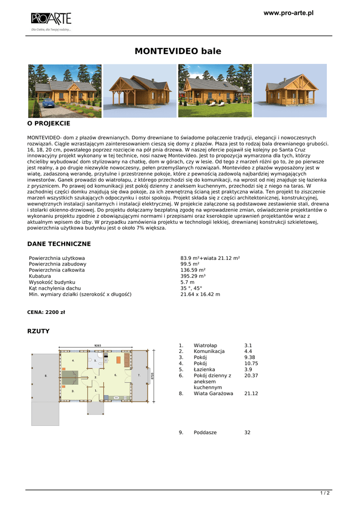 www.pro-arte.pl MONTEVIDEO bale O PROJEKCIE MONTEVIDEO- dom z płazów drewnianych. Domy drewniane to świadome połączenie tradycji, elegancji i nowoczesnych rozwiązań. Ciągle wzrastającym zainteresowaniem cieszą się domy z płazów. Płaza jest to rodzaj bala drewnianego grubości. 16, 18, 20 cm, powstałego poprzez rozcięcie na pół pnia drzewa. W naszej ofercie pojawił się kolejny po Santa Cruz innowacyjny projekt wykonany w tej technice, nosi nazwę Montevideo. Jest to propozycja wymarzona dla tych, którzy chcieliby wybudować dom stylizowany na chatkę, dom w górach, czy w lesie. Od tego z marzeń różni go to, że po pierwsze jest realny, a po drugie niezwykle nowoczesny, pełen przemyślanych rozwiązań. Montevideo z płazów wyposażony jest w wiatę, zadaszoną werandę, przytulne i przestrzenne pokoje, które z pewnością zadowolą najbardziej wymagających inwestorów. Ganek prowadzi do wiatrołapu, z którego przechodzi się do komunikacji, na wprost od niej znajduje się łazienka z prysznicem. Po prawej od komunikacji jest pokój dzienny z aneksem kuchennym, przechodzi się z niego na taras. W zachodniej części domku znajdują się dwa pokoje, za ich zewnętrzną ścianą jest praktyczna wiata. Ten projekt to ziszczenie marzeń wszystkich szukających odpoczynku i ostoi spokoju. Projekt składa się z części architektonicznej, konstrukcyjnej, wewnętrznych instalacji sanitarnych i instalacji elektrycznej. W projekcie załączone są podstawowe zestawienie stali, drewna i stolarki okienno-drzwiowej. Do projektu dołączamy bezpłatną zgodę na wprowadzenie zmian, oświadczenie projektantów o wykonaniu projektu zgodnie z obowiązującymi normami i przepisami oraz kserokopie uprawnień projektantów wraz z aktualnym wpisem do izby. W przypadku zamówienia projektu w technologii lekkiej, drewnianej konstrukcji szkieletowej, powierzchnia użytkowa budynku jest o około 7% większa. DANE TECHNICZNE Powierzchnia użytkowa Powierzchnia zabudowy Powierzchnia całkowita Kubatura Wysokość budynku Kąt nachylenia dachu Min. wymiary działki (szerokość x długość) 83.9 m²+wiata 21.12 m² 99.5 m² 136.59 m² 395.29 m³ 5.7 m 35 °, 45° 21.64 x 16.42 m CENA: 2200 zł RZUTY 1. 2. 3. 4. 5. 6. 3.1 4.4 9.38 10.75 3.9 20.37 8. Wiatrołap Komunikacja Pokój Pokój Łazienka Pokój dzienny z aneksem kuchennym Wiata Garażowa 9. Poddasze 32 21.12 1/2 www.pro-arte.pl tel. (32) 43-50-829, 502 575 920, [email protected], www.pro-arte.pl 2/2 Powered by TCPDF (www.tcpdf.org)