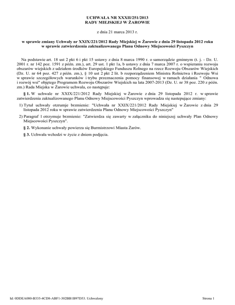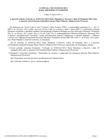 UCHWAŁA NR XXXII/251/2013 RADY MIEJSKIEJ W ŻAROWIE z dnia 21 marca 2013 r. w sprawie zmiany Uchwały nr XXIX/221/2012 Rady Miejskiej w Żarowie z dnia 29 listopada 2012 roku w sprawie zatwierdzenia zaktualizowanego Planu Odnowy Miejscowości Pyszczyn Na podstawie art. 18 ust 2 pkt 6 i pkt 15 ustawy z dnia 8 marca 1990 r. o samorządzie gminnym (t. j. - Dz. U. 2001 r. nr 142 poz. 1591 z późn. zm.), art. 29 ust. 1 pkt 1a, b ustawy z dnia 7 marca 2007 r. o wspieraniu rozwoju obszarów wiejskich z udziałem środków Europejskiego Funduszu Rolnego na rzecz Rozwoju Obszarów Wiejskich (Dz. U. nr 64 poz. 427 z późn. zm.), § 10 ust 2 pkt 2 lit. b rozporządzeniem Ministra Rolnictwa i Rozwoju Wsi w sprawie szczegółowych warunków i trybu przeznaczenia pomocy finansowej w ramach działania " Odnowa i rozwój wsi" objętego Programem Rozwoju Obszarów Wiejskich na lata 2007-2013 (Dz. U. nr 38 poz. 220 z późn. zm.) Rada Miejska w Żarowie uchwala, co następuje: § 1. W uchwale nr XXIX/221/2012 Rady Miejskiej w Żarowie z dnia 29 listopada 2012 r. w sprawie zatwierdzenia zaktualizowanego Planu Odnowy Miejscowości Pyszczyn wprowadza się nastepujące zmiany: 1) Tytuł uchwały otzrumje brzmienie: "Uchwała nr XXIX/221/2012 Rady Miejskiej w Żarowie z dnia 29 listopada 2012 roku w sprawie zatwierdzenia Planu Odnowy Miejscowości Pyszczyn" 2) Paragraf 1 otrzymuje brzmienie: "Zatwierdza się zawarty w załączniku do niniejszej uchwały Plan Odnowy Miejscowości Pyszczyn". § 2. Wykonanie uchwały powierza się Burmistrzowi Miasta Żarów. § 3. Uchwała wchodzi w życie z dniem podjęcia. Id: 0DDEA080-B335-4CD8-ABF1-302BB1B97D53. Uchwalony Strona 1 Uzasadnienie Na podstwie art. 29 ust 1 pkt 1 Ustawy z dnia 7 marca 2007 roku o wspieraniu rozwoju obszarów wiejskich z udziałem środków Europejskiego Funduszu Rolnego na rzecz Rozwoju Obszraów Wiejskich wydane zostało Rozporządzenie Ministra Rolnictwa i Rozwoju Wsi z dnia 1 kwietnia 2010 r. zmieniające Rozporządzenie Ministra Rolnictwa i Rozwoju wsi z dnia 14 lutego 2008 r. w sprawie szczegółowych warunków i trybu przyzanania pomocy finansowej w ramach działania " Odnowa i rozwój wsi". Na podstawie § 10 ust.2 pkt 2 ww. rozporządzenia podczas składania wniosku o przyznanie pomocy w ramach programu Rozowju Obszarów Wiejskich, działanie "Odnowa i rozwój wsi" dołącza się Plan Odnowy Miejscowości. Dokument ten stanowi sformalizowanie kierunków dążeń mieszkańców sólectwa do poprawy jakości i warunków życia oraz pracy we własnej miejscowości. Jest także wyrazem planowania kształtu, gdzie priorytetem jest integralność wsi jako jednostki osadniczej i harmonizacja podstawowych funkcji wsi: mieszkalnej, produkcji i usług oraz wypoczynku i rekreacji. W celu skutecznego aplikowania o środki zewnętrzne niezbędna jest zmiana błędnego zapisu uchwały Rady Miejskiej w Żarowie nr XXIX/221/2012 z dnia 29 listopada 2012 r. w sprawie zatwierdzenia zaktualizowanego Planu Odnowy Miesjcowości Pyszczyn. Z uwagi na powyższe przesłanki uznaje się uzasadninoe podjęcie niniejszej uchwały. Sporządziła: Adriana Kowalczyk Referent ds. wsi i rolnictwa Id: 0DDEA080-B335-4CD8-ABF1-302BB1B97D53. Uchwalony Strona 1