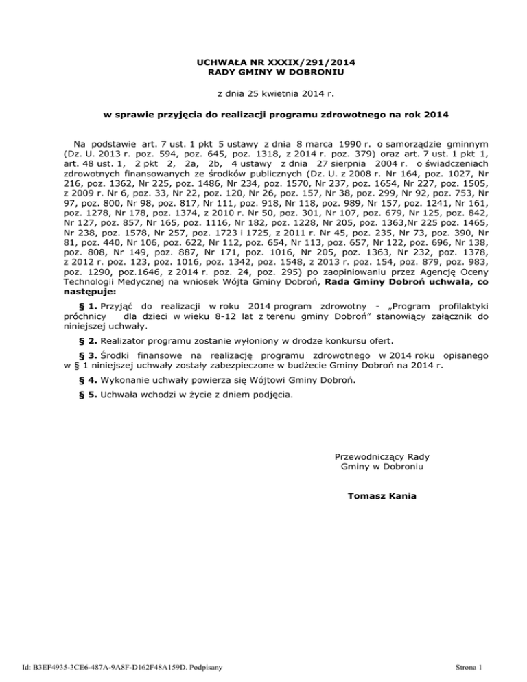 UCHWAŁA NR XXXIX/291/2014 RADY GMINY W DOBRONIU z dnia 25 kwietnia 2014 r. w sprawie przyjęcia do realizacji programu zdrowotnego na rok 2014 Na podstawie art. 7 ust. 1 pkt 5 ustawy z dnia 8 marca 1990 r. o samorządzie gminnym (Dz. U. 2013 r. poz. 594, poz. 645, poz. 1318, z 2014 r. poz. 379) oraz art. 7 ust. 1 pkt 1, art. 48 ust. 1, 2 pkt 2, 2a, 2b, 4 ustawy z dnia 27 sierpnia 2004 r. o świadczeniach zdrowotnych finansowanych ze środków publicznych (Dz. U. z 2008 r. Nr 164, poz. 1027, Nr 216, poz. 1362, Nr 225, poz. 1486, Nr 234, poz. 1570, Nr 237, poz. 1654, Nr 227, poz. 1505, z 2009 r. Nr 6, poz. 33, Nr 22, poz. 120, Nr 26, poz. 157, Nr 38, poz. 299, Nr 92, poz. 753, Nr 97, poz. 800, Nr 98, poz. 817, Nr 111, poz. 918, Nr 118, poz. 989, Nr 157, poz. 1241, Nr 161, poz. 1278, Nr 178, poz. 1374, z 2010 r. Nr 50, poz. 301, Nr 107, poz. 679, Nr 125, poz. 842, Nr 127, poz. 857, Nr 165, poz. 1116, Nr 182, poz. 1228, Nr 205, poz. 1363,Nr 225 poz. 1465, Nr 238, poz. 1578, Nr 257, poz. 1723 i 1725, z 2011 r. Nr 45, poz. 235, Nr 73, poz. 390, Nr 81, poz. 440, Nr 106, poz. 622, Nr 112, poz. 654, Nr 113, poz. 657, Nr 122, poz. 696, Nr 138, poz. 808, Nr 149, poz. 887, Nr 171, poz. 1016, Nr 205, poz. 1363, Nr 232, poz. 1378, z 2012 r. poz. 123, poz. 1016, poz. 1342, poz. 1548, z 2013 r. poz. 154, poz. 879, poz. 983, poz. 1290, poz.1646, z 2014 r. poz. 24, poz. 295) po zaopiniowaniu przez Agencję Oceny Technologii Medycznej na wniosek Wójta Gminy Dobroń, Rada Gminy Dobroń uchwala, co następuje: § 1. Przyjąć do realizacji w roku 2014 program zdrowotny - „Program profilaktyki próchnicy dla dzieci w wieku 8-12 lat z terenu gminy Dobroń” stanowiący załącznik do niniejszej uchwały. § 2. Realizator programu zostanie wyłoniony w drodze konkursu ofert. § 3. Środki finansowe na realizację programu zdrowotnego w 2014 roku opisanego w § 1 niniejszej uchwały zostały zabezpieczone w budżecie Gminy Dobroń na 2014 r. § 4. Wykonanie uchwały powierza się Wójtowi Gminy Dobroń. § 5. Uchwała wchodzi w życie z dniem podjęcia. Przewodniczący Rady Gminy w Dobroniu Tomasz Kania Id: B3EF4935-3CE6-487A-9A8F-D162F48A159D. Podpisany Strona 1 Załącznik Nr 1 do Uchwały Nr XXXIX/291/2014 Rady Gminy w Dobroniu z dnia 25 kwietnia 2014 r. "Program profilaktyki próchnicy dla dzieci w wieku 8-12 lat z terenu gminy Dobroń" ANKIETA Wyrażam zgodę na udział dziecka w Programie Profilaktyki Próchnicy dla dzieci w wieku 8-12 lat z terenu Gminy Dobroń Okres realizacji programu: 2014 r. Autor programu: Urząd Gminy w Dobroniu ul. 11 Listopada 9 95-082 Dobroń woj. łódzkie 1. Opis problemu zdrowotnego Próchnica zębów jest bakteryjną chorobą zakaźną, która polega na demineralizacji oraz proteolitycznym rozpadzie twardych tkanek zęba. Do jej powstania i rozwoju przyczyniają się bakterie, nieodpowiednia higiena jamy ustnej, niewłaściwe odżywianie, a także uwarunkowania genetyczne. Nieleczona próchnica jest istotnym źródłem infekcji dla całego organizmu. Próchnica stanowi poważny problem społeczny dotykający dzieci już we wczesnym okresie rozwoju, a częstość jej występowania rośnie wraz z wiekiem. W Polsce, jako jednym z nielicznych krajów Europy, nie udało się obniżyć zapadalności na próchnicę wśród dzieci. Choroba próchnicowa i zapalenie dziąseł nadal dotyczy 90 % dzieci w wieku szkolnym. Zgodnie z przeprowadzonymi badaniami stwierdzono, iż najczęściej próchnica atakuje uzębienie dzieci w wieku 7 – 12 lat, gdzie średni przyrost zachorowalności wynosi trochę ponad 35 % (Szpringer – Nodzak). Jak wynika z raportu Ministerstwa Zdrowia „Monitorowanie stanu zdrowia jamy ustnej populacji polskiej w latach 2013-2015”, Polska nadal pozostaje w czołówce niechlubnego rankingu, najwyższej zachorowalności na próchnicę u dzieci. Najgorzej sytuacja ta wygląda w przypadku 6-latków (współczynnik PUWz 5,1). Wskaźnik PUWz dla 12-latków z krajów Unii Europejskiej, dla Polski wynosi 3,5 (Gazeta Lekarska Pismo Izb Lekarskich 05.2012 ISSN 0867-2146, str. 26). Odsetek uczniów w wieku 12 lat, z co najmniej jednym zębem stałym usuniętym z powodu próchnicy, sięga 4 % i zwiększa się wraz z wiekiem. Nieleczona próchnica może doprowadzić do rozwoju wielu chorób zębów oraz chorób ogólnoustrojowych, dlatego też tak ważne jest dbanie o higienę jamy ustnej. Prawidłowa i systematyczna higiena jamy ustnej umożliwia w około 50 % zahamowanie przyrostu nowych ubytków próchnicowych (Kunzel) likwidując destrukcyjny wpływ płytki nazębnej. Osiągnięcie poprawy stanu uzębienia dzieci jest możliwe poprzez promocję zachowań prozdrowotnych oraz objęcie jak największej liczby dzieci profesjonalną opieką stomatologiczną z zastosowaniem zabiegu profilaktycznego, jakim jest lakowanie (uszczelnianie) bruzd. Lakowanie to zabieg polegający na pokryciu zębów lakiem, czyli odpowiednim materiałem, który chroni przed powstaniem płytki nazębnej. Program dotyczyć będzie dzieci w wieku 8 – 12 lat. U dzieci biorących udział w przedmiotowym Programie lakowane będą zęby szóste, z tego względu, że najczęściej to właśnie one ulegają próchnicy w pierwszej kolejności. Id: B3EF4935-3CE6-487A-9A8F-D162F48A159D. Podpisany Strona 1 W chwili obecnej lakowanie pierwszych trzonowców stałych w ramach świadczeń proponowanych przez Narodowy Fundusz Zdrowia jest możliwe u dzieci do ukończenia 7 roku życia. Jest to niewystarczające, ponieważ większość dzieci w tym wieku nie ma jeszcze wyrzniętych wszystkich czterech „szóstek”, dlatego też istnieje potrzeba profilaktycznego ich lakowania w późniejszych latach życia. 2. Cele Programu. 2.1. Cel główny: Celem głównym Programu jest obniżenie występowania próchnicy zębów wśród dzieci z terenu gminy Dobroń, poprzez intensyfikację działań profilaktycznych. 2.2. Cele szczegółowe : - Przeciwdziałanie rozwojowi próchnicy zębów i chorób przyzębia oraz wad