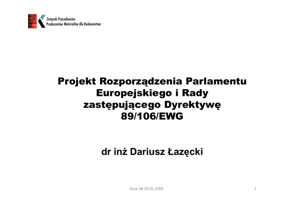 Projekt Rozporządzenia Parlamentu Europejskiego i Rady zastępującego Dyrektywę 89/106/EWG dr inŜ Dariusz Łazęcki Ossa 28-29.05.2009 1 Prawo SYSTEM EUROPEJSKI Dyrektywa Rady 89/106/EWG SYSTEM KRAJOWY Ustawa o wyrobach budowlanych Ossa 28-29.05.2009 2 Prawo (system europejski) Cechy dyrektyw nowego podejścia (przed 1985 r. były dyrektywy starego podejścia) określenie wymagań zasadniczych (podstawowych) dla obiektu postanowienia dotyczące informowania odbiorcy o właściwościach i ograniczeniach stosowania wyrobu określenie systemów oceny (atestacji) zgodności określenie warunków notyfikowania jednostek upowaŜnionych do wykonywania zadań z zakresu atestacji zgodności nałoŜenie obowiązku wskazania krajowych organów sprawujących nadzór nad rynkiem obowiązek znakowania CE Oprócz Dyrektywy obejmującej materiały budowlane (89/106/EWG) Jest ponad 20 dyrektyw nowego podejścia dotyczących m.in. maszyn, zabawek, wyrobów medycznych, elektrycznych i elektronicznych Ossa 28-29.05.2009 3 Prawo (system europejski) Klasyczne dyrektywy nowego podejścia Sposób formułowania wymagań Wymagania zasadnicze dotyczą wyrobów Wymagania zasadnicze dotyczą obiektów budowlanych (które składają się z wyrobów) Zgodność wyrobu z wymaganiami dyrektywy moŜna uzyskać: Zgodność wyrobu z wymaganiami dyrektywy moŜna uzyskać na podstawie: Bezpośrednio Sposób wykazania zgodności z dyrektywą Dyrektywa 89/106/EWG W wyniku załoŜenia zgodności z dyrektywą Zgodności z normą zharmonizowaną (hEN) z dyrektywą Zgodności z europejską aprobatą techniczną (w przypadku braku hEN) Określona data wdroŜenia dyrektywy Termin wdroŜenia ustalany odrębnie dla kaŜdej zharmonizowanej specyfikacji technicznej Globalne podejście do oceny zgodności (moduły A - H) Specyficzne systemy oceny (zaświadczania) zgodności związane z zamierzonym zastosowaniem wyrobu Sposób wdroŜenia Sposób podejścia do oceny zgodności Ossa 28-29.05.2009 4 Prawo (system krajowy) Przepis Dz.U. Data Dyrektywa Rady nr 89/106/EWG w sprawie zbliŜenia przepisów prawnych i administracyjnych państw Dz.U. L40 członkowskich dotyczących wyrobów budowlanych Dz.U.L40 z dnia 11.02.1989 Ustawa prawo budowlane Dz.U.1994.89.414 Ustawa z dnia 7.07.1994 Ustawa o wyrobach budowlanych Dz.U.2004.92.881 Ustawa z dnia 16.04.2004 Ustawa o systemie oceny zgodności Dz.U.2002.166.1360 Ustawa z dnia 30.08.2002 Ossa 28-29.05.2009 5 Oznakowanie Oznakowanie Oznacza zgodność wyrobu budowlanego ze zharmonizowaną specyfikacją techniczną Oznacza zgodność wyrobu budowlanego z krajową specyfikacją techniczną zharmonizowana norma europejska (wprowadzona do zbioru Polskich Norm) europejska aprobata techniczna krajowa specyfikacja techniczna uznana przez Komisję Europejską Polska Norma aprobata techniczna Oznacza, Ŝe przeprowadzono właściwą procedurę oceny zgodności i wystawiono europejską deklarację zgodności WE UmoŜliwia umieszczenie wyrobu budowlanego na jednolitym rynku europejskim (w tym w Polsce) Oznacza, Ŝe przeprowadzono właściwą procedurę oceny zgodności i wystawiono krajową deklarację zgodności UmoŜliwia umieszczenie wyrobu budowlanego wyłącznie na rynku krajowym UWAGA: od 13.05.2009 umieszczenie wyrobu budowlanego w jednym kraju członkowskim oznacza moŜliwość umieszczenia go w dowolnym innym kraju UE, chyba, Ŝe państwo członkowskie wykaŜe niezgodność z miejscowymi przepisami technicznymi. rozporządzenie Parlamentu Europejskiego i Rady (WE) Nr 764/2008 ustanawiające procedury dotyczące stosowania niektórych krajowych przepisów technicznych do produktów wprowadzanych legalnie do obrotu w innym państwie członkowskim oraz uchylające decyzję nr 3052/92/WE Ossa 28-29.05.2009 6 Funkcjonowanie Dyrektywy 89/106/EWG – próba diagnozy • DuŜa ilość „dokumentów interpretacyjnych”. • Niespójność przepisów wprowadzających • ETA – biurokratyczna, długotrwała i kosztowna procedura. • DuŜa liczba (6) systemów oceny zgodności. • Nierównowaga praw i obowiązków uczestników rynku we wprowadzaniu wyrobu budowlanego na rynek (producent – dystrybutor – architekt – inwestor). • Ograniczenie w dostępie wyrobów do rynków lokalnych poprzez konieczność spełnienia dodatkowych wymagań przez wyrób przed dopuszczeniem go do stosowania na tym rynku. • Dość dobre funkcjonowanie Dyrektywy wewnątrz „nowych” krajów członkowskich i złe funkcjonowanie pomiędzy „starymi” i „nowymi”. • Jednolity rynek europejski materiałów budowlanych nie istnieje. Ossa 28-29.05.2009 7 Rozporządzenie zastępujące Dyrektywę – dlaczego zmiana? • Ograniczenie moŜliwości „interpretacyjnych” • Przywrócenie wiarygodności oznakowania CE i jakości systemu akredytacji • • • • • • • • • jednostek notyfikowanych Denotyfikacja jednostek DąŜenie do zredukowania ilości a przede wszystkim kosztów badań Jednolity język techniczny Nowa definicja wyrobu innowacyjnego i ETA tylko dla wyrobów innowacyjnych Wzmocnienie kontroli rynku Wyraźny zakaz stosowania barier w obrocie w krajach członkowskich wyrobów oznakowanych CE Nie włączanie do systemu dodatkowych oznaczeń obowiązkowych i wymagań krajowych/lokalnych Promowanie rozwiązań IT w obrocie informacjami Uproszczenie procedur i zmniejszenie obciąŜeń administracyjnych dla przedsiębiorstw Ossa 28-29.05.2009 8 Rozporządzenie zastępujące Dyrektywę – proponowane rozwiązania w projekcie • • • Przywrócenie wiarygodności oznakowania CE i jakości systemu akredytacji jednostek notyfikowanych Propozycja innych zasad oceny wyrobów budowlanych produkowanych przez małe i średnie przedsiębiorstwa. Faktycznie CE będzie więc oznaczało co innego dla wyrobów produkowanych przez róŜne przedsiębiorstwa (duŜe-małe) Nie wolno obniŜać wymagań i stosować róŜnych kryteriów oceny dla samych wyrobów Denotyfikacja jednostek Nie jest jasno określone z 