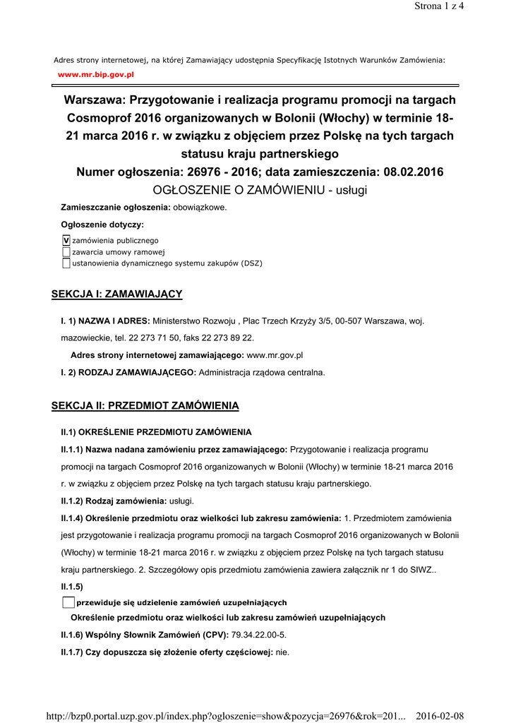 Strona 1 z 4 Adres strony internetowej, na której Zamawiający udostępnia Specyfikację Istotnych Warunków Zamówienia: www.mr.bip.gov.pl Warszawa: Przygotowanie i realizacja programu promocji na targach Cosmoprof 2016 organizowanych w Bolonii (Włochy) w terminie 1821 marca 2016 r. w związku z objęciem przez Polskę na tych targach statusu kraju partnerskiego Numer ogłoszenia: 26976 - 2016; data zamieszczenia: 08.02.2016 OGŁOSZENIE O ZAMÓWIENIU - usługi Zamieszczanie ogłoszenia: obowiązkowe. Ogłoszenie dotyczy: V zamówienia publicznego zawarcia umowy ramowej ustanowienia dynamicznego systemu zakupów (DSZ) SEKCJA I: ZAMAWIAJĄCY I. 1) NAZWA I ADRES: Ministerstwo Rozwoju , Plac Trzech Krzyży 3/5, 00-507 Warszawa, woj. mazowieckie, tel. 22 273 71 50, faks 22 273 89 22. Adres strony internetowej zamawiającego: www.mr.gov.pl I. 2) RODZAJ ZAMAWIAJĄCEGO: Administracja rządowa centralna. SEKCJA II: PRZEDMIOT ZAMÓWIENIA II.1) OKREŚLENIE PRZEDMIOTU ZAMÓWIENIA II.1.1) Nazwa nadana zamówieniu przez zamawiającego: Przygotowanie i realizacja programu promocji na targach Cosmoprof 2016 organizowanych w Bolonii (Włochy) w terminie 18-21 marca 2016 r. w związku z objęciem przez Polskę na tych targach statusu kraju partnerskiego. II.1.2) Rodzaj zamówienia: usługi. II.1.4) Określenie przedmiotu oraz wielkości lub zakresu zamówienia: 1. Przedmiotem zamówienia jest przygotowanie i realizacja programu promocji na targach Cosmoprof 2016 organizowanych w Bolonii (Włochy) w terminie 18-21 marca 2016 r. w związku z objęciem przez Polskę na tych targach statusu kraju partnerskiego. 2. Szczegółowy opis przedmiotu zamówienia zawiera załącznik nr 1 do SIWZ.. II.1.5) przewiduje się udzielenie zamówień uzupełniających Określenie przedmiotu oraz wielkości lub zakresu zamówień uzupełniających II.1.6) Wspólny Słownik Zamówień (CPV): 79.34.22.00-5. II.1.7) Czy dopuszcza się złożenie oferty częściowej: nie. http://bzp0.portal.uzp.gov.pl/index.php?ogloszenie=show&pozycja=26976&rok=201... 2016-02-08 Strona 2 z 4 II.1.8) Czy dopuszcza się złożenie oferty wariantowej: nie. II.2) CZAS TRWANIA ZAMÓWIENIA LUB TERMIN WYKONANIA: Zakończenie: 21.03.2016. SEKCJA III: INFORMACJE O CHARAKTERZE PRAWNYM, EKONOMICZNYM, FINANSOWYM I TECHNICZNYM III.1) WADIUM Informacja na temat wadium: Zamawiający nie wymaga wniesienia wadium III.2) ZALICZKI III.3) WARUNKI UDZIAŁU W POSTĘPOWANIU ORAZ OPIS SPOSOBU DOKONYWANIA OCENY SPEŁNIANIA TYCH WARUNKÓW III. 3.1) Uprawnienia do wykonywania określonej działalności lub czynności, jeżeli przepisy prawa nakładają obowiązek ich posiadania Opis sposobu dokonywania oceny spełniania tego warunku Zamawiający nie precyzuje opisu sposobu dokonywania oceny spełniania tego warunku III.3.2) Wiedza i doświadczenie Opis sposobu dokonywania oceny spełniania tego warunku Zamawiający nie precyzuje opisu sposobu dokonywania oceny spełniania tego warunku III.3.3) Potencjał techniczny Opis sposobu dokonywania oceny spełniania tego warunku Zamawiający nie precyzuje opisu sposobu dokonywania oceny spełniania tego warunku III.3.4) Osoby zdolne do wykonania zamówienia Opis sposobu dokonywania oceny spełniania tego warunku Zamawiający nie precyzuje opisu sposobu dokonywania oceny spełniania tego warunku III.3.5) Sytuacja ekonomiczna i finansowa Opis sposobu dokonywania oceny spełniania tego warunku Zamawiający nie precyzuje opisu sposobu dokonywania oceny spełniania tego warunku III.4) INFORMACJA O OŚWIADCZENIACH LUB DOKUMENTACH, JAKIE MAJĄ DOSTARCZYĆ WYKONAWCY W CELU POTWIERDZENIA SPEŁNIANIA WARUNKÓW UDZIAŁU W POSTĘPOWANIU ORAZ NIEPODLEGANIA WYKLUCZENIU NA PODSTAWIE ART. 24 UST. 1 USTAWY III.4.1) W zakresie wykazania spełniania przez wykonawcę warunków, o których mowa w art. 22 ust. 1 ustawy, oprócz oświadczenia o spełnianiu warunków udziału w postępowaniu należy przedłożyć: III.4.2) W zakresie potwierdzenia niepodlegania wykluczeniu na podstawie art. 24 ust. 1 ustawy, należy przedłożyć: http://bzp0.portal.uzp.gov.pl/index.php?ogloszenie=show&pozycja=26976&rok=201... 2016-02-08 Strona 3 z 4 • oświadczenie o braku podstaw do wykluczenia; • aktualny odpis z właściwego rejestru lub z centralnej ewidencji i informacji o działalności gospodarczej, jeżeli odrębne przepisy wymagają wpisu do rejestru lub ewidencji, w celu wykazania braku podstaw do wykluczenia w oparciu o art. 24 ust. 1 pkt 2 ustawy, wystawiony nie wcześniej niż 6 miesięcy przed upływem terminu składania wniosków o dopuszczenie do udziału w postępowaniu o udzielenie zamówienia albo składania ofert; III.4.3) Dokumenty podmiotów zagranicznych Jeżeli wykonawca ma siedzibę lub miejsce zamieszkania poza terytorium Rzeczypospolitej Polskiej, przedkłada: III.4.3.1) dokument wystawiony w kraju, w którym ma siedzibę lub miejsce zamieszkania potwierdzający, że: • nie otwarto jego likwidacji ani nie ogłoszono upadłości - wystawiony nie wcześniej niż 6 miesięcy przed upływem terminu składania wniosków o dopuszczenie do udziału w postępowaniu o udzielenie zamówienia albo składania ofert; III.4.4) Dokumenty dotyczące przynależności do tej samej grupy kapitałowej • lista podmiotów należących do tej samej grupy kapitałowej w rozumieniu ustawy z dnia 16 lutego 2007 r. o ochronie konkurencji i konsumentów albo informacji o tym, że nie należy do grupy kapitałowej; III.6) INNE DOKUMENTY Inne dokumenty niewymienione w pkt III.4) albo w pkt III.5) 1) pełnomocnictwo do reprezentowania wykonawcy (wykonawców występujących wspólnie), o ile ofertę składa pełnomocnik SEKCJA IV: PROCEDURA IV.1) TRYB UDZIELENIA ZAMÓWIENIA IV.1.1) Tryb udzielenia zamówienia: przetarg nieograniczony. IV.2) KRYTERIA OCENY OFERT IV.2.1) Kryteria oceny ofert: cena oraz inne kryteria związane z przedmiotem zamówienia: 1 - Cena - 55 2 - Projekt wizualizacji podwieszanego okrągłego bannera do zainstalowania nad stoiskami polskich pr