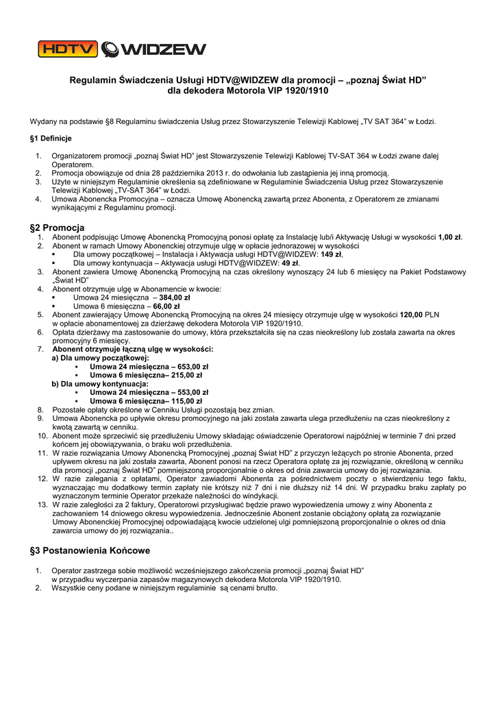 Regulamin Świadczenia Usługi HDTV@WIDZEW dla promocji – „poznaj Świat HD” dla dekodera Motorola VIP 1920/1910 Wydany na podstawie §8 Regulaminu świadczenia Usług przez Stowarzyszenie Telewizji Kablowej „TV SAT 364” w Łodzi. §1 Definicje 1. 2. 3. 4. Organizatorem promocji „poznaj Świat HD” jest Stowarzyszenie Telewizji Kablowej TV-SAT 364 w Łodzi zwane dalej Operatorem. Promocja obowiązuje od dnia 28 października 2013 r. do odwołania lub zastąpienia jej inną promocją. Użyte w niniejszym Regulaminie określenia są zdefiniowane w Regulaminie Świadczenia Usług przez Stowarzyszenie Telewizji Kablowej „TV-SAT 364” w Łodzi. Umowa Abonencka Promocyjna – oznacza Umowę Abonencką zawartą przez Abonenta, z Operatorem ze zmianami wynikającymi z Regulaminu promocji. §2 Promocja 1. 2. 3. 4. 5. 6. 7. 8. 9. 10. 11. 12. 13. Abonent podpisując Umowę Abonencką Promocyjną ponosi opłatę za Instalację lub/i Aktywację Usługi w wysokości 1,00 zł. Abonent w ramach Umowy Abonenckiej otrzymuje ulgę w opłacie jednorazowej w wysokości Dla umowy początkowej – Instalacja i Aktywacja usługi HDTV@WIDZEW: 149 zł, Dla umowy kontynuacja – Aktywacja usługi HDTV@WIDZEW: 49 zł. Abonent zawiera Umowę Abonencką Promocyjną na czas określony wynoszący 24 lub 6 miesięcy na Pakiet Podstawowy „Świat HD” Abonent otrzymuje ulgę w Abonamencie w kwocie: Umowa 24 miesięczna – 384,00 zł Umowa 6 miesięczna – 66,00 zł Abonent zawierający Umowę Abonencką Promocyjną na okres 24 miesięcy otrzymuje ulgę w wysokości 120,00 PLN w opłacie abonamentowej za dzierżawę dekodera Motorola VIP 1920/1910. Opłata dzierżawy ma zastosowanie do umowy, która przekształciła się na czas nieokreślony lub została zawarta na okres promocyjny 6 miesięcy. Abonent otrzymuje łączną ulgę w wysokości: a) Dla umowy początkowej: Umowa 24 miesięczna – 653,00 zł Umowa 6 miesięczna– 215,00 zł b) Dla umowy kontynuacja: Umowa 24 miesięczna – 553,00 zł Umowa 6 miesięczna– 115,00 zł Pozostałe opłaty określone w Cenniku Usługi pozostają bez zmian. Umowa Abonencka po upływie okresu promocyjnego na jaki została zawarta ulega przedłużeniu na czas nieokreślony z kwotą zawartą w cenniku. Abonent może sprzeciwić się przedłużeniu Umowy składając oświadczenie Operatorowi najpóźniej w terminie 7 dni przed końcem jej obowiązywania, o braku woli przedłużenia. W razie rozwiązania Umowy Abonencką Promocyjnej „poznaj Świat HD” z przyczyn leżących po stronie Abonenta, przed upływem okresu na jaki została zawarta, Abonent ponosi na rzecz Operatora opłatę za jej rozwiązanie, określoną w cenniku dla promocji „poznaj Świat HD” pomniejszoną proporcjonalnie o okres od dnia zawarcia umowy do jej rozwiązania. W razie zalegania z opłatami, Operator zawiadomi Abonenta za pośrednictwem poczty o stwierdzeniu tego faktu, wyznaczając mu dodatkowy termin zapłaty nie krótszy niż 7 dni i nie dłuższy niż 14 dni. W przypadku braku zapłaty po wyznaczonym terminie Operator przekaże należności do windykacji. W razie zaległości za 2 faktury, Operatorowi przysługiwać będzie prawo wypowiedzenia umowy z winy Abonenta z zachowaniem 14 dniowego okresu wypowiedzenia. Jednocześnie Abonent zostanie obciążony opłatą za rozwiązanie Umowy Abonenckiej Promocyjnej odpowiadającą kwocie udzielonej ulgi pomniejszoną proporcjonalnie o okres od dnia zawarcia umowy do jej rozwiązania.. §3 Postanowienia Końcowe 1. 2. Operator zastrzega sobie możliwość wcześniejszego zakończenia promocji „poznaj Świat HD” w przypadku wyczerpania zapasów magazynowych dekodera Motorola VIP 1920/1910. Wszystkie ceny podane w niniejszym regulaminie są cenami brutto. CENNIK usługi HDTV@WIDZEW dla promocji „poznaj Świat HD” dekoder Motorola 1910/1920 Cena (Brutto) PLN LP Przedmiot 1. 2. 3. 4. 5. 6. 7. Pakiet Podstawowy Świat HD* (umowa 24 miesięczna) 50,00 Pakiet Podstawowy Świat HD* (czas nieokreślony) 66,00 Opłata dzierżawy za dekoder Motorola 1910/1920 5,00 Instalacja i Aktywacja usługi HDTV@WIDZEW dla promocji 1,00 „poznaj Świat HD” z dekoderem Motorola 1910/1920 Instalacja i Aktywacja usługi HDTV@WIDZEW poza promocją „poznaj Świat HD” 150,00 Aktywacja usługi HDTV@WIDZEW dla promocji 1,00 „poznaj Świat HD” z dekoderem Motorola 1910/1920 Aktywacja usługi HDTV@WIDZEW poza promocją „poznaj Świat HD” 50,00 Opłata za rozwiązanie umowy na czas określony przed upływem terminu wygaśnięcia, w wysokości łącznej ulgi udzielonej Abonentowi, pomniejszona proporcjonalnie o okres od dnia zawarcia umowy do dnia jej rozwiązania Dla umowy początkowej Umowa 24 miesięczna 653,00 Umowa 6 miesięczna 215,00 7. Dla umowy kontynuacja 8. 9. 10. 11. 12. 13. 14. 15. 16. 17. 18. 19. 20. * Umowa 24 miesięczna 553,00 Umowa 6 miesięczna 115,00 Obsługa serwisowa obejmująca usterki z winy Operatora Wydanie nowego lub naprawa w miejsce uszkodzonego z winy Abonenta dekodera Motorola 1910/1920 Wydanie nowego w miejsce zagubionego lub zniszczonego dekodera Motorola 1910/1920 Nieterminowy zwrot udostępnionego Zestawu HDTV po zakończeniu umowy Zwrot uszkodzonego/zniszczonego z winy Abonenta dekodera Motorola 1910/1920 Brak zwrotu użyczonego dekodera Motorola 1910/1920 po zakończeniu umowy Brak zwrotu standardowego pilota do obsługi dekodera Brak zwrotu Instrukcji dekodera (polska) Brak zwrotu kabli: zasilający, Ethernet, SCART (każdy) Brak zwrotu zasilacza do dekodera Brak zwrotu oryginalnego opakowania do dekodera Korzystanie z Usług niezgodnie z Regulaminem, w szczególności publiczne rozpowszechnianie lub wykorzystywanie Usług Operatora do działalności komercyjnej. Kara za udostępnienie dekodera poza Lokalem Abonenta ( Dopłata do aktywnego pakietu STANDARD) 0,00 300,00 300,00 50,00 300,00 300,00 40,00 10,00 15,00 40,00 10,00 400,00 250,00 Cennik obowiązuje od 28.10.2013 r.