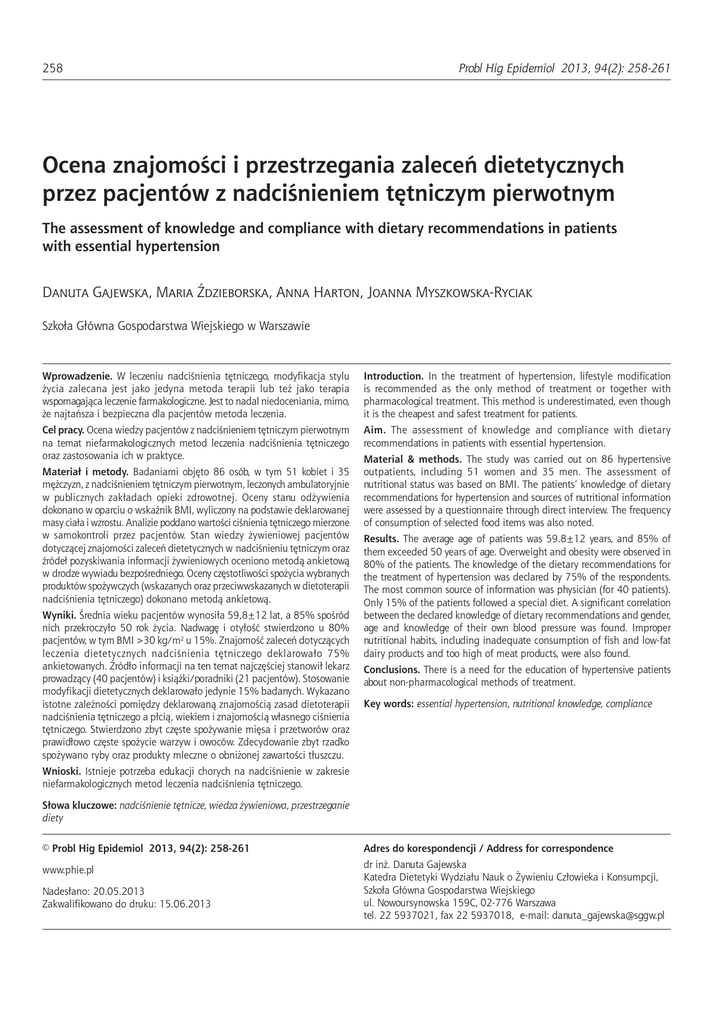 258 Probl Hig Epidemiol 2013, 94(2): 258-261 Ocena znajomości i przestrzegania zaleceń dietetycznych przez pacjentów z nadciśnieniem tętniczym pierwotnym The assessment of knowledge and compliance with dietary recommendations in patients with essential hypertension Danuta Gajewska, Maria Ździeborska, Anna Harton, Joanna Myszkowska-Ryciak Szkoła Główna Gospodarstwa Wiejskiego w Warszawie Wprowadzenie. W leczeniu nadciśnienia tętniczego, modyfikacja stylu życia zalecana jest jako jedyna metoda terapii lub też jako terapia wspomagająca leczenie farmakologiczne. Jest to nadal niedoceniania, mimo, że najtańsza i bezpieczna dla pacjentów metoda leczenia. Introduction. In the treatment of hypertension, lifestyle modification is recommended as the only method of treatment or together with pharmacological treatment. This method is underestimated, even though it is the cheapest and safest treatment for patients. Cel pracy. Ocena wiedzy pacjentów z nadciśnieniem tętniczym pierwotnym na temat niefarmakologicznych metod leczenia nadciśnienia tętniczego oraz zastosowania ich w praktyce. Aim. The assessment of knowledge and compliance with dietary recommendations in patients with essential hypertension. Materiał i metody. Badaniami objęto 86 osób, w tym 51 kobiet i 35 mężczyzn, z nadciśnieniem tętniczym pierwotnym, leczonych ambulatoryjnie w publicznych zakładach opieki zdrowotnej. Oceny stanu odżywienia dokonano w oparciu o wskaźnik BMI, wyliczony na podstawie deklarowanej masy ciała i wzrostu. Analizie poddano wartości ciśnienia tętniczego mierzone w samokontroli przez pacjentów. Stan wiedzy żywieniowej pacjentów dotyczącej znajomości zaleceń dietetycznych w nadciśnieniu tętniczym oraz źródeł pozyskiwania informacji żywieniowych oceniono metodą ankietową w drodze wywiadu bezpośredniego. Oceny częstotliwości spożycia wybranych produktów spożywczych (wskazanych oraz przeciwwskazanych w dietoterapii nadciśnienia tętniczego) dokonano metodą ankietową. Wyniki. Średnia wieku pacjentów wynosiła 59,8±12 lat, a 85% spośród nich przekroczyło 50 rok życia. Nadwagę i otyłość stwierdzono u 80% pacjentów, w tym BMI >30 kg/m2 u 15%. Znajomość zaleceń dotyczących leczenia dietetycznych nadciśnienia tętniczego deklarowało 75% ankietowanych. Źródło informacji na ten temat najczęściej stanowił lekarz prowadzący (40 pacjentów) i książki/poradniki (21 pacjentów). Stosowanie modyfikacji dietetycznych deklarowało jedynie 15% badanych. Wykazano istotne zależności pomiędzy deklarowaną znajomością zasad dietoterapii nadciśnienia tętniczego a płcią, wiekiem i znajomością własnego ciśnienia tętniczego. Stwierdzono zbyt częste spożywanie mięsa i przetworów oraz prawidłowo częste spożycie warzyw i owoców. Zdecydowanie zbyt rzadko spożywano ryby oraz produkty mleczne o obniżonej zawartości tłuszczu. Material & methods. The study was carried out on 86 hypertensive outpatients, including 51 women and 35 men. The assessment of nutritional status was based on BMI. The patients’ knowledge of dietary recommendations for hypertension and sources of nutritional information were assessed by a questionnaire through direct interview. The frequency of consumption of selected food items was also noted. Results. The average age of patients was 59.8±12 years, and 85% of them exceeded 50 years of age. Overweight and obesity were observed in 80% of the patients. The knowledge of the dietary recommendations for the treatment of hypertension was declared by 75% of the respondents. The most common source of information was physician (for 40 patients). Only 15% of the patients followed a special diet. A significant correlation between the declared knowledge of dietary recommendations and gender, age and knowledge of their own blood pressure was found. Improper nutritional habits, including inadequate consumption of fish and low-fat dairy products and too high of meat products, were also found. Conclusions. There is a need for the education of hypertensive patients about non-pharmacological methods of treatment. Key words: essential hypertension, nutritional knowledge, compliance Wnioski. Istnieje potrzeba edukacji chorych na nadciśnienie w zakresie niefarmakologicznych metod leczenia nadciśnienia tętniczego. Słowa kluczowe: nadciśnienie tętnicze, wiedza żywieniowa, przestrzeganie diety © Probl Hig Epidemiol 2013, 94(2): 258-261 www.phie.pl Nadesłano: 20.05.2013 Zakwalifikowano do druku: 15.06.2013 Adres do korespondencji / Address for correspondence dr inż. Danuta Gajewska Katedra Dietetyki Wydziału Nauk o Żywieniu Człowieka i Konsumpcji, Szkoła Główna Gospodarstwa Wiejskiego ul. Nowoursynowska 159C, 02-776 Warszawa tel. 22 5937021, fax 22 5937018, e-mail: [email protected] Gajewska D i wsp. Ocena znajomości i przestrzegania zaleceń dietetycznych przez pacjentów z nadciśnieniem tętniczym ... Wprowadzenie Nadciśnienie tętnicze stanowi poważy problem zdrowotny i ekonomiczny. Z Raportu WHO wynika, że w 2008 roku częstość występowania podwyższonego ciśnienia tętniczego u dorosłych powyżej 25 roku życia na świecie wynosiła 40% [1]. W Polsce na nadciśnienie tętnicze choruje około 8,6 miliona, co stanowi 29% dorosłych Polaków [2]. Szacuje się, że w niektórych grupach wiekowych wraz ze wzrostem ciśnienia o 20/10 mm Hg powyżej wartości 115/75 mm Hg ryzyko chorób sercowo-naczyniowych podwaja się. W nowej definicji nadciśnienia tętniczego, opracowanej przez The Writing Group of the American Society of Hypertension (WG-ASH) eksperci proponują, aby nadciśnienie tętnicze definiować jako zespół objawów sercowo-naczyniowych, które wynikają ze ściśle powiązanych ze sobą czynników. Obejmuje to całościową ocenę układu krążenia i ocenę innych czynników ryzyka wystąpienia nadciśnienia tętniczego [3]. W leczeniu nadciśnienia tętniczego, modyfikacja stylu życia zalecana jest