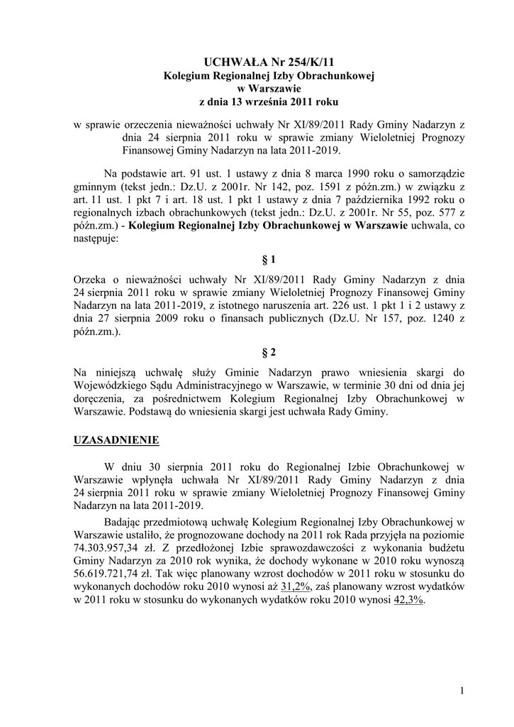 UCHWAŁA Nr 254/K/11 Kolegium Regionalnej Izby Obrachunkowej w Warszawie z dnia 13 września 2011 roku w sprawie orzeczenia nieważności uchwały Nr XI/89/2011 Rady Gminy Nadarzyn z dnia 24 sierpnia 2011 roku w sprawie zmiany Wieloletniej Prognozy Finansowej Gminy Nadarzyn na lata 2011-2019. Na podstawie art. 91 ust. 1 ustawy z dnia 8 marca 1990 roku o samorządzie gminnym (tekst jedn.: Dz.U. z 2001r. Nr 142, poz. 1591 z późn.zm.) w związku z art. 11 ust. 1 pkt 7 i art. 18 ust. 1 pkt 1 ustawy z dnia 7 października 1992 roku o regionalnych izbach obrachunkowych (tekst jedn.: Dz.U. z 2001r. Nr 55, poz. 577 z późn.zm.) - Kolegium Regionalnej Izby Obrachunkowej w Warszawie uchwala, co następuje: §1 Orzeka o nieważności uchwały Nr XI/89/2011 Rady Gminy Nadarzyn z dnia 24 sierpnia 2011 roku w sprawie zmiany Wieloletniej Prognozy Finansowej Gminy Nadarzyn na lata 2011-2019, z istotnego naruszenia art. 226 ust. 1 pkt 1 i 2 ustawy z dnia 27 sierpnia 2009 roku o finansach publicznych (Dz.U. Nr 157, poz. 1240 z późn.zm.). §2 Na niniejszą uchwałę służy Gminie Nadarzyn prawo wniesienia skargi do Wojewódzkiego Sądu Administracyjnego w Warszawie, w terminie 30 dni od dnia jej doręczenia, za pośrednictwem Kolegium Regionalnej Izby Obrachunkowej w Warszawie. Podstawą do wniesienia skargi jest uchwała Rady Gminy. UZASADNIENIE W dniu 30 sierpnia 2011 roku do Regionalnej Izbie Obrachunkowej w Warszawie wpłynęła uchwała Nr XI/89/2011 Rady Gminy Nadarzyn z dnia 24 sierpnia 2011 roku w sprawie zmiany Wieloletniej Prognozy Finansowej Gminy Nadarzyn na lata 2011-2019. Badając przedmiotową uchwałę Kolegium Regionalnej Izby Obrachunkowej w Warszawie ustaliło, że prognozowane dochody na 2011 rok Rada przyjęła na poziomie 74.303.957,34 zł. Z przedłożonej Izbie sprawozdawczości z wykonania budżetu Gminy Nadarzyn za 2010 rok wynika, że dochody wykonane w 2010 roku wynoszą 56.619.721,74 zł. Tak więc planowany wzrost dochodów w 2011 roku w stosunku do wykonanych dochodów roku 2010 wynosi aż 31,2%, zaś planowany wzrost wydatków w 2011 roku w stosunku do wykonanych wydatków roku 2010 wynosi 42,3%. 1 Ponadto ze sprawozdań z wykonania budżetu Gminy Nadarzyn za I półrocze 2011 roku wynika, że wskaźnik długu ustalony w oparciu o tytuły dłużne określone w art. 72 ustawy z dnia 27 sierpnia 2009 roku o finansach publicznych przy uwzględnieniu rozporządzenia Ministra Finansów z dnia 23 grudnia 2010 roku w sprawie szczegółowego sposobu klasyfikacji tytułów dłużnych zaliczanych do państwowego długu publicznego, w tym długu Skarbu Państwa (Dz.U. Nr 252, poz. 1692), które do kredytów i pożyczek zalicza m.in. „umowy nienazwane o terminie zapłaty dłuższym niż rok, związane z finansowaniem usług, dostaw, robót budowlanych, które wywołują skutki ekonomiczne podobne do umowy pożyczki lub kredytu”, przekracza za I półrocze limit, o którym mowa w art. 170 ustawy z dnia 30 czerwca 2005 roku o finansach publicznych, który to artykuł w oparciu o przepis art. 121 ust. 2 ustawy z dnia 29 sierpnia 2009 roku Przepisy wprowadzające ustawę o finansach publicznych, ma zastosowanie do 2013 roku włącznie. Niniejszy wskaźnik za I półrocze 2011 roku wynosi 66,38% (planowane dochody 71.384.379,34 zł; zobowiązania wg tytułów dłużnych - 47.383.604,78 zł), zaś po wyłączeniu zobowiązań zaciągniętych w związku z umową zawartą z podmiotem dysponującym środkami, o których mowa w art. 5 ust. 3 ustawy z dnia 30 czerwca 2005 roku o finansach publicznych, wskaźnik długu wynosi 63,09%. Kolegium Izby zauważa, że zgodnie z uchwałą Rady Gminy Nadarzyn z dnia 2 sierpnia 2011 w sprawie Wieloletniej Prognozy Finansowej planowany wskaźnik zadłużenia wynosił 62,50% (po uwzględnieniu wyłączeń, o których mowa wyżej). Z przedmiotowej uchwały wynika, że w związku z przyjętym planowanym wzrostem dochodów o 2.000.000,00 zł w stosunku do stanu na dzień 2 sierpnia 2011 roku, prognozowany wskaźnik zadłużenia na koniec 2011 roku wynosi 58,85% (po uwzględnieniu w/w wyłączeń). W tej sytuacji, w ocenie organu nadzoru, brak wykonania dochodów roku 2011 w 100% spowoduje wzrost wskaźnika zadłużenia, co może spowodować przekroczenie jego dopuszczalnej granicy. Mając na uwadze powyższe, zdaniem Kolegium Izby, przyjęta w przedmiotowej uchwale prognoza dochodów na poziomie 74.303.957,34 zł, tj. wyższa w stosunku do wykonanych dochodów roku ubiegłego o 31,2% nie jest realistyczna, co pociąga za sobą nierealistyczność zaplanowanych wydatków, tak więc w sposób istotny naruszony został przepis art. 226 ust. 1 pkt 1 i 2 ustawy o finansach publicznych stanowiący, iż „Wieloletnia prognoza finansowa powinna być realistyczna (…)”. Kolegium Izby posługując się definicją słowa „realistyczny” (realis znaczy „rzeczywisty”) jako „zestawiający zamierzenia, poglądy z rzeczywistością, z faktami, oparty na trzeźwym sądzie, liczący się z rzeczywistością, mający cechy realizmu” dokonało m.in. analizy istniejących danych o kształtowaniu się poziomu planowanych i wykonanych dochodów w poprzednich okresach. Przedmiotowa analiza posłużyła organowi nadzoru do oceny realistyczności prognozy finansowej, przy czym Kolegium Izby ma na uwadze to, że zawarte w wieloletniej prognozie finansowej ustalenia nie mają charakteru wiążącego, co jest oczywistą konsekwencją każdej prognozy, która sprowadza się tylko do przewidywania. 2 I tak dochody ogółem: - w 2008 roku wykonano w kwocie 56.394,7 tys. zł, tj. 97,3% planu, - w 2009 roku wykonano w kwocie 58.182,6 tys. zł, tj. 91,9% planu, - w 2010 roku wykonano w kwocie 56.619,7 tys. zł, tj. 87,3% planu. Organ nadzoru zauważa, że zaplanowanie dochodów w 2011 roku w wielkościach „wygórowanych” 74.303,9 tys. zł grozi poważnymi trudnościami przy wykonaniu budżetu, gdyż może okazać się, że część zaplanowanych i uruchomionych wydatk