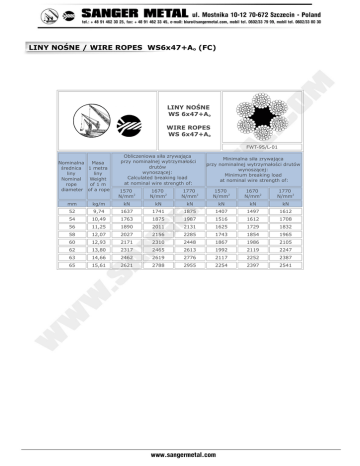 LINY NOŚNE / WIRE ROPES WS6x47+Ao (FC) LINY NOŚNE WS 6x47+Ao WIRE ROPES WS 6x47+Ao FWT-95/L-01 Nominalna Masa średnica 1 metra liny liny Nominal Weight rope of 1 m diameter of a rope Obliczeniowa siła zrywająca przy nominalnej wytrzymałości drutów wynoszącej: Calculated breaking load at nominal wire strength of: Minimalna siła zrywająca przy nominalnej wytrzymałości drutów wynoszącej: Minimum breaking load at nominal wire strength of: 1570 N/mm2 1670 N/mm2 1770 N/mm2 1570 N/mm2 1670 N/mm2 1770 N/mm2 kg/m kN kN kN kN kN kN 52 9,74 1637 1741 1875 1407 1497 1612 54 10,49 1763 1875 1987 1516 1612 1708 56 11,25 1890 2011 2131 1625 1729 1832 58 12,07 2027 2156 2285 1743 1854 1965 60 12,93 2171 2310 2448 1867 1986 2105 62 13,80 2317 2465 2613 1992 2119 2247 63 14,66 2462 2619 2776 2117 2252 2387 65 15,61 2621 2788 2955 2254 2397 2541 mm