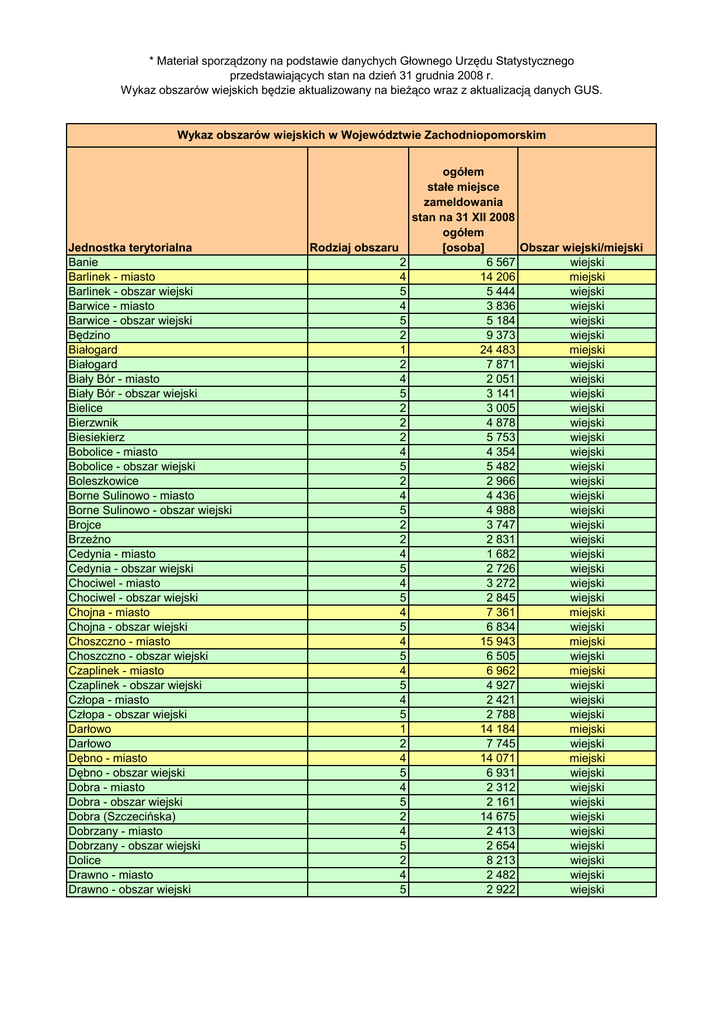 * Materiał sporządzony na podstawie danychych Głownego Urzędu Statystycznego przedstawiających stan na dzień 31 grudnia 2008 r. Wykaz obszarów wiejskich będzie aktualizowany na bieŜąco wraz z aktualizacją danych GUS. Wykaz obszarów wiejskich w Województwie Zachodniopomorskim Jednostka terytorialna Banie Barlinek - miasto Barlinek - obszar wiejski Barwice - miasto Barwice - obszar wiejski Będzino Białogard Białogard Biały Bór - miasto Biały Bór - obszar wiejski Bielice Bierzwnik Biesiekierz Bobolice - miasto Bobolice - obszar wiejski Boleszkowice Borne Sulinowo - miasto Borne Sulinowo - obszar wiejski Brojce BrzeŜno Cedynia - miasto Cedynia - obszar wiejski Chociwel - miasto Chociwel - obszar wiejski Chojna - miasto Chojna - obszar wiejski Choszczno - miasto Choszczno - obszar wiejski Czaplinek - miasto Czaplinek - obszar wiejski Człopa - miasto Człopa - obszar wiejski Darłowo Darłowo Dębno - miasto Dębno - obszar wiejski Dobra - miasto Dobra - obszar wiejski Dobra (Szczecińska) Dobrzany - miasto Dobrzany - obszar wiejski Dolice Drawno - miasto Drawno - obszar wiejski Rodziaj obszaru 2 4 5 4 5 2 1 2 4 5 2 2 2 4 5 2 4 5 2 2 4 5 4 5 4 5 4 5 4 5 4 5 1 2 4 5 4 5 2 4 5 2 4 5 ogółem stałe miejsce zameldowania stan na 31 XII 2008 ogółem [osoba] Obszar wiejski/miejski 6 567 wiejski 14 206 miejski 5 444 wiejski 3 836 wiejski 5 184 wiejski 9 373 wiejski 24 483 miejski 7 871 wiejski 2 051 wiejski 3 141 wiejski 3 005 wiejski 4 878 wiejski 5 753 wiejski 4 354 wiejski 5 482 wiejski 2 966 wiejski 4 436 wiejski 4 988 wiejski 3 747 wiejski 2 831 wiejski 1 682 wiejski 2 726 wiejski 3 272 wiejski 2 845 wiejski 7 361 miejski 6 834 wiejski 15 943 miejski 6 505 wiejski 6 962 miejski 4 927 wiejski 2 421 wiejski 2 788 wiejski 14 184 miejski 7 745 wiejski 14 071 miejski 6 931 wiejski 2 312 wiejski 2 161 wiejski 14 675 wiejski 2 413 wiejski 2 654 wiejski 8 213 wiejski 2 482 wiejski 2 922 wiejski Jednostka terytorialna Drawsko Pomorskie - miasto Drawsko Pomorskie - obszar wiejski Dygowo Dziwnów - miasto Dziwnów - obszar wiejski Golczewo - miasto Golczewo - obszar wiejski Goleniów - miasto Goleniów - obszar wiejski Gościno Gryfice - miasto Gryfice - obszar wiejski Gryfino - miasto Gryfino - obszar wiejski Grzmiąca Ińsko - miasto Ińsko - obszar wiejski Kalisz Pomorski - miasto Kalisz Pomorski - obszar wiejski Kamień Pomorski - miasto Kamień Pomorski - obszar wiejski Karlino - miasto Karlino - obszar wiejski Karnice Kobylanka Kołbaskowo Kołobrzeg Kołobrzeg Koszalin Kozielice Krzęcin Lipiany - miasto Lipiany - obszar wiejski Łobez - miasto Łobez - obszar wiejski Malechowo Manowo Marianowo Maszewo - miasto Maszewo - obszar wiejski Mielno Mieszkowice - miasto Mieszkowice - obszar wiejski Międzyzdroje - miasto Międzyzdroje - obszar wiejski Mirosławiec - miasto Mirosławiec - obszar wiejski Moryń - miasto Moryń - obszar wiejski Myślibórz - miasto Myślibórz - obszar wiejski Nowe Warpno - miasto Nowe Warpno - obszar wiejski Rodziaj obszaru 4 5 2 4 5 4 5 4 5 2 4 5 4 5 2 4 5 4 5 4 5 4 5 2 2 2 1 2 1 2 2 4 5 4 5 2 2 2 4 5 2 4 5 4 5 4 5 4 5 4 5 4 5 ogółem stałe miejsce zameldowania stan na 31 XII 2008 ogółem [osoba] Obszar wiejski/miejski 11 487 miejski 5 070 wiejski 5 589 wiejski 2 948 wiejski 1 199 wiejski 2 727 wiejski 3 390 wiejski 22 422 miejski 11 461 wiejski 5 148 wiejski 16 776 miejski 6 953 wiejski 21 423 miejski 10 020 wiejski 5 138 wiejski 2 106 wiejski 1 565 wiejski 4 179 wiejski 3 072 wiejski 9 305 miejski 5 365 wiejski 5 820 miejski 3 388 wiejski 4 153 wiejski 3 986 wiejski 9 836 wiejski 44 686 miejski 9 631 wiejski 105 107 miejski 2 638 wiejski 3 818 wiejski 4 181 wiejski 1 932 wiejski 10 678 miejski 3 852 wiejski 6 661 wiejski 6 277 wiejski 3 178 wiejski 3 173 wiejski 5 284 wiejski 4 925 wiejski 3 649 wiejski 3 929 wiejski 5 527 miejski 1 033 wiejski 2 710 wiejski 3 049 wiejski 1 642 wiejski 2 757 wiejski 11 904 miejski 9 071 wiejski 1 232 wiejski 379 wiejski Jednostka terytorialna Nowogard - miasto Nowogard - obszar wiejski Nowogródek Pomorski Osina Ostrowice Pełczyce - miasto Pełczyce - obszar wiejski Płoty - miasto Płoty - obszar wiejski Polanów - miasto Polanów - obszar wiejski Police - miasto Police - obszar wiejski Połczyn-Zdrój - miasto Połczyn-Zdrój - obszar wiejski Postomino Przelewice Przybiernów Pyrzyce - miasto Pyrzyce - obszar wiejski Radowo Małe Rąbino Recz - miasto Recz - obszar wiejski Resko - miasto Resko - obszar wiejski Rewal Rymań Sianów - miasto Sianów - obszar wiejski Siemyśl Sławno Sławno Sławoborze Stara Dąbrowa Stare Czarnowo Stargard Szczeciński Stargard Szczeciński Stepnica Suchań - miasto Suchań - obszar wiejski Szczecin Szczecinek Szczecinek Świdwin Świdwin Świerzno Świeszyno Świnoujście Trzcińsko-Zdrój - miasto Trzcińsko-Zdrój - obszar wiejski Trzebiatów - miasto Trzebiatów - obszar wiejski Tuczno - miasto Tuczno - obszar wiejski Tychowo Ustronie Morskie Rodziaj obszaru 4 5 2 2 2 4 5 4 5 4 5 4 5 4 5 2 2 2 4 5 2 2 4 5 4 5 2 2 4 5 2 1 2 2 2 2 1 2 2 4 5 1 1 2 1 2 2 2 1 4 5 4 5 4 5 2 2 ogółem stałe miejsce zameldowania stan na 31 XII 2008 ogółem [osoba] Obszar wiejski/miejski 16 912 miejski 7 831 wiejski 3 361 wiejski 2 896 wiejski 2 555 wiejski 2 741 wiejski 5 390 wiejski 4 148 wiejski 5 070 wiejski 2 971 wiejski 6 295 wiejski 33 920 miejski 7 454 wiejski 8 625 miejski 7 532 wiejski 7 116 wiejski 5 275 wiejski 5 314 wiejski 12 816 miejski 6 907 wiejski 3 825 wiejski 3 995 wiejski 3 049 wiejski 2 755 wiejski 4 405 wiejski 3 976 wiejski 3 533 wiejski 4 197 wiejski 6 626 miejski 6 799 wiejski 3 662 wiejski 13 077 miejski 9 023 wiejski 4 309 wiejski 3 652 wiejski 3 825 wiejski 70 042 miejski 11 633 wiejski 4 808 wiejski 1 477 wiejski 2 904 wiejski 399 186 miejski 38 405 miejski 10 395 wiejski 15 623 miejski 6 263 wiejski 4 308 wiejski 5 931 wiejski 40 740 miejski 2 432 wiejski 3 222 wiejski 10 327 miejski 6 642 wiejski 1 963 wiejski 3 006 wiejski 7 040 wiejski 3 580 wiejski Jednostka ter