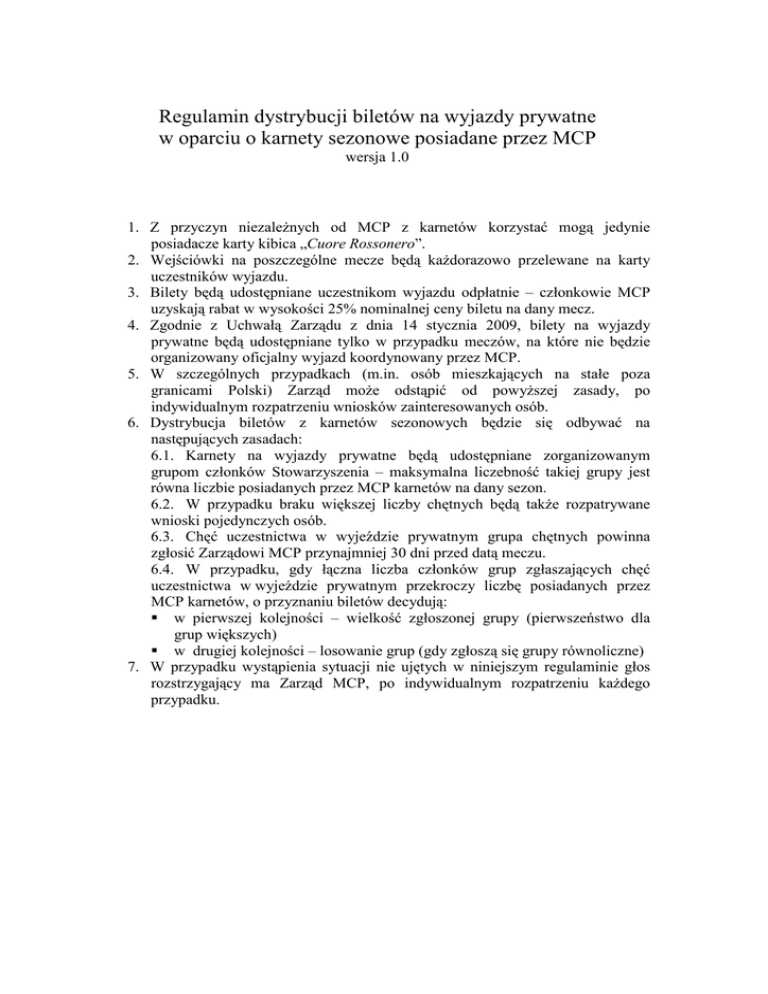 Regulamin dystrybucji biletów na wyjazdy prywatne w oparciu o karnety sezonowe posiadane przez MCP wersja 1.0 1. Z przyczyn niezaleŜnych od MCP z karnetów korzystać mogą jedynie posiadacze karty kibica „Cuore Rossonero”. 2. Wejściówki na poszczególne mecze będą kaŜdorazowo przelewane na karty uczestników wyjazdu. 3. Bilety będą udostępniane uczestnikom wyjazdu odpłatnie – członkowie MCP uzyskają rabat w wysokości 25% nominalnej ceny biletu na dany mecz. 4. Zgodnie z Uchwałą Zarządu z dnia 14 stycznia 2009, bilety na wyjazdy prywatne będą udostępniane tylko w przypadku meczów, na które nie będzie organizowany oficjalny wyjazd koordynowany przez MCP. 5. W szczególnych przypadkach (m.in. osób mieszkających na stałe poza granicami Polski) Zarząd moŜe odstąpić od powyŜszej zasady, po indywidualnym rozpatrzeniu wniosków zainteresowanych osób. 6. Dystrybucja biletów z karnetów sezonowych będzie się odbywać na następujących zasadach: 6.1. Karnety na wyjazdy prywatne będą udostępniane zorganizowanym grupom członków Stowarzyszenia – maksymalna liczebność takiej grupy jest równa liczbie posiadanych przez MCP karnetów na dany sezon. 6.2. W przypadku braku większej liczby chętnych będą takŜe rozpatrywane wnioski pojedynczych osób. 6.3. Chęć uczestnictwa w wyjeździe prywatnym grupa chętnych powinna zgłosić Zarządowi MCP przynajmniej 30 dni przed datą meczu. 6.4. W przypadku, gdy łączna liczba członków grup zgłaszających chęć uczestnictwa w wyjeździe prywatnym przekroczy liczbę posiadanych przez MCP karnetów, o przyznaniu biletów decydują: w pierwszej kolejności – wielkość zgłoszonej grupy (pierwszeństwo dla grup większych) w drugiej kolejności – losowanie grup (gdy zgłoszą się grupy równoliczne) 7. W przypadku wystąpienia sytuacji nie ujętych w niniejszym regulaminie głos rozstrzygający ma Zarząd MCP, po indywidualnym rozpatrzeniu kaŜdego przypadku.