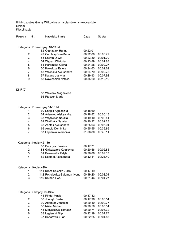 III Mistrzostwa Gminy Wilkowice w narciarstwie i snowboardzie Slalom Klasyfikacja Pozycja Nr. Nazwisko i Imię Czas Strata 00:22.01 00:22.80 00:23.80 00:23.89 00:24.28 00:24.63 00:24.79 00:29.93 00:35.20 00:00.79 00:01.79 00:01.88 00:02.27 00:02.62 00:02.78 00:07.92 00:13.19 Kategoria : Dziewczyny 14-16 lat 1 69 Knapik Agnieszka 2 64 Adamiec Aleksandra 3 63 Wójtowicz Natalia 4 61 Wolińska Natalia 5 68 Zontek Aleksandra 6 66 Arnold Dominika 7 67 Lepianka Weronika 00:18.69 00:18.82 00:19.10 00:20.92 00:25.63 00:55.55 01:06.80 00:00.13 00:00.41 00:02.23 00:06.94 00:36.86 00:48.11 Kategoria : Kobiety 21-39 1 80 Przybyła Karolina 2 83 Gnioździorz Katarzyna 3 81 Pawłowska Edyta 4 82 Kosmal Aleksandra 00:17.71 00:20.56 00:26.88 00:42.11 00:02.85 00:09.17 00:24.40 Kategoria : Kobiety 40+ 1 111 Kram-Solecka Julita 2 112 Petrulewicz-Salomon Iwona 3 110 Katana Ewa 00:17.19 00:19.20 00:21.46 00:02.01 00:04.27 Kategoria : Chłopcy 10-13 lat 1 44 Pindel Maciej 2 38 Jurczyk Błażej 3 39 Adamiec Joachim 4 36 Nikiel Michał 5 43 Matyszczyk Tomasz 6 33 Legierski Filip 7 37 Boborowski Jan 00:17.42 00:17.96 00:20.19 00:20.56 00:20.74 00:22.19 00:22.25 00:00.54 00:02.77 00:03.14 00:03.32 00:04.77 00:04.83 Kategoria : Dziewczyny 10-13 lat 1 52 Ogorzałek Hanna 2 49 CembrzyńskaMaria 3 55 Kawka Oliwia 4 54 Wypart Wiktoria 5 51 Horemska Oliwia 6 50 Kowalcze Estera 7 48 Wolińska Aleksandra 8 57 Katana Justyna 9 58 Nawieśniak Natalia DNF (2) 53 Walczak Magdalena 56 Ptaszek Maria 8 9 10 11 12 13 14 15 16 46 40 45 41 47 29 42 32 28 Strzelec Jan Gilowski Łukasz Ludwig Patryk Mularczyk Piotr Nawieśniak Mateusz Tymich Szymon Świecak Maciej Rozumikiewicz Jakub Buława Filip 00:22.33 00:24.52 00:25.17 00:25.24 00:26.15 00:27.09 00:29.10 00:35.18 00:36.02 00:04.91 00:07.10 00:07.75 00:07.82 00:08.73 00:09.67 00:11.68 00:17.76 00:18.60 Kategoria : Chłopcy 14-16 lat 1 74 Arnold Filip 2 72 Kowalcze Maciej 3 71 Kurowski Krystian 3 70 Kępys Dominik 5 76 Kula Przemysław 6 75 Cader Sebastian 7 73 Jurczyk Igor 8 77 Śpiewak Dawid 9 79 Żur Marek 10 78 Ludwig Mikołaj 00:16.23 00:16.54 00:17.09 00:17.09 00:18.49 00:20.78 00:22.06 00:22.80 00:23.31 00:24.16 00:00.31 00:00.86 00:00.86 00:02.26 00:04.55 00:05.83 00:06.57 00:07.08 00:07.93 Kategoria : Mężczyźni 17-20 lat 1 84 Nikiel Aleksander 2 85 Kurowski Patryk 3 86 Krupa Krzysztof 00:16.32 00:17.29 00:17.68 00:00.97 00:01.36 Kategoria : Mężczyźni 21-39 lat 1 92 Szymanek Daniel 2 91 Horemski Adam 3 88 Kochaj Jerzy 4 98 Legierski Wojciech 5 89 Przybyła Bartłomiej 6 99 Krupa Piotr 7 87 Tymich Grzegorz 8 94 Maślanka Michał 9 96 Michalak Mateusz 10 97 Koper Patryk 11 100 Stwora Paweł 12 95 Handzlik Michał 00:15.46 00:15.95 00:16.09 00:16.61 00:16.92 00:16.95 00:18.55 00:18.62 00:18.70 00:20.74 00:21.86 00:55.74 00:00.49 00:00.63 00:01.15 00:01.46 00:01.49 00:03.09 00:03.16 00:03.24 00:05.28 00:06.40 00:40.28 00:16.24 00:16.25 00:17.07 00:17.10 00:17.19 00:17.45 00:00.01 00:00.83 00:00.86 00:00.95 00:01.21 DNF (1) 93 Maślanka Maciej Kategoria : Mężczyźni 40+ 1 117 Salamon Jacek 2 127 Jurczyk Grzegorz 3 134 Mika Edward 4 131 Mikołajek Zbigniew 5 130 Mikołajek Wiesław 6 114 Kępys Marcin 7 8 9 10 11 12 13 14 15 16 17 18 19 20 21 22 125 119 132 124 118 135 122 121 120 133 141 129 128 143 123 136 Łaciak Franciszek Solecki Andrzej Kwaśny Piotr Kubica Stanisław Katana Tomasz Adamiec Aleksander Żur Marcin Nikiel Piotr Przybyła Janusz Katana Mieczysław Mularczyk Sylwester Kawka Piotr Herman Sławomir Grzędziski Sławomir Maślank Franciszek Nycz Tomasz 00:18.41 00:18.87 00:19.03 00:19.14 00:19.39 00:20.16 00:21.31 00:21.47 00:21.73 00:22.34 00:24.58 00:25.54 00:26.35 00:26.88 00:30.49 00:30.95 00:02.17 00:02.63 00:02.79 00:02.90 00:03.15 00:03.92 00:05.07 00:05.23 00:05.49 00:06.10 00:08.34 00:09.30 00:10.11 00:10.64 00:14.25 00:14.71 00:26.23 00:27.10 00:35.55 00:38.00 00:46.18 00:00.87 00:09.32 00:11.77 00:19.95 DSQ (1) 126 Wójtowicz Michał Kategoria : S 1 2 3 4 5 142 138 137 139 140 Szczygłowski Tomasz Pucher Piotr Szlachtowski Michał Kalarus Jakub Obtułowicz Kacper