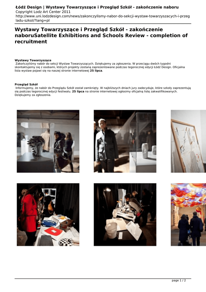 Łódź Design | Wystawy Towarzyszące i Przegląd Szkół - zakończenie naboru Copyright Lodz Art Center 2011 http://www.uni.lodzdesign.com/news/zakonczylismy-nabor-do-sekcji-wystaw-towarzyszacych-i-przeg ladu-szkol/?lang=pl Wystawy Towarzyszące i Przegląd Szkół - zakończenie naboruSatellite Exhibitions and Schools Review - completion of recruitment Wystawy Towarzyszące Zakończyliśmy nabór do sekcji Wystaw Towarzyszących. Dziękujemy za zgłoszenia. W przeciągu dwóch tygodni skontaktujemy się z osobami, których projekty zostaną zaprezentowane podczas tegorocznej edycji Łódź Design. Oficjalna lista wystaw pojawi się na naszej stronie internetowej 25 lipca. Przegląd Szkół Informujemy, że nabór do Przeglądu Szkół został zamknięty. W najbliższych dniach jury zadecyduje, które szkoły zaprezentują się podczas tegorocznej edycji festiwalu. 25 lipca na stronie internetowej ogłosimy oficjalną listę zakwalifikowanych. Dziękujemy za zgłoszenia. page 1 / 2 Łódź Design | Wystawy Towarzyszące i Przegląd Szkół - zakończenie naboru Copyright Lodz Art Center 2011 http://www.uni.lodzdesign.com/news/zakonczylismy-nabor-do-sekcji-wystaw-towarzyszacych-i-przegl adu-szkol/?lang=pl Satellite Exhibitions We have finished accepting entries to the section of accompanying exhibitions. Thank you for your applications. Within the next 2 weeks we will contact authors of the projects that will be displayed during this year's edition of the Festival. The official list of exhibitions will appear on our website on July 25th. Schools Review The recruitment for the Schoos Review has been closed. In the upcoming days, the jury will decide which schools will present themselves during the Festival. We will publish an official list of qualified schools on our web page on 10 July. Many thanks for all applications. page 2 / 2