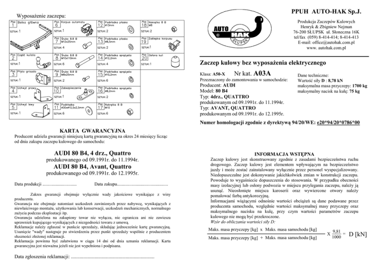 PPUH AUTO-HAK Sp.J. WyposaŜenie zaczepu: Produkcja Zaczepów Kulowych Henryk & Zbigniew Nejman 76-200 SŁUPSK ul. Słoneczna 16K tel/fax (059) 8-414-414; 8-414-413 E-mail: [email protected] www. autohak.com.pl Zaczep kulowy bez wyposaŜenia elektrycznego A03A Klasa: A50-X Nr kat. Przeznaczony do zamontowania w samochodzie: Producent: AUDI Model: 80 B4 Typ: 4drz., QUATTRO produkowanym od 09.1991r. do 11.1994r. Typ: AVANT, QUATTRO produkowanym od 09.1991r. do 12.1995r. Dane techniczne: Wartość siły D : 8,78 kN maksymalna masa przyczepy: 1700 kg maksymalny nacisk na kulę: 75 kg Numer homologacji zgodnie z dyrektywą 94/20/WE: e20*94/20*0786*00 KARTA GWARANCYJNA Producent udziela gwarancji niniejszą kartą gwarancyjną na okres 24 miesięcy licząc od dnia zakupu zaczepu kulowego do samochodu: AUDI 80 B4, 4 drz., Quattro INFORMACJA WSTĘPNA produkowanego od 09.1991r. do 11.1994r. Zaczep kulowy jest skonstruowany zgodnie z zasadami bezpieczeństwa ruchu drogowego. Zaczep kulowy jest elementem wpływającym na bezpieczeństwo jazdy i moŜe zostać zainstalowany wyłącznie przez personel wyspecjalizowany. Niedopuszczalne jest dokonywanie jakichkolwiek zmian w konstrukcji zaczepu. Powoduje to wygaśniecie dopuszczenia do stosowania. W przypadku obecności masy izolacyjnej lub osłony podwozia w miejscu przylegania zaczepu, naleŜy ją usunąć. Nieosłonięte miejsca karoserii oraz wywiercone otwory naleŜy pomalować farbą antykorozyjną. Informacjami wiąŜącymi odnośnie wartości obciąŜeń są dane podawane przez producenta samochodu, względnie wartości maksymalnej masy przyczepy oraz maksymalnego nacisku na kulę, przy czym wartości parametrów zaczepu kulowego nie mogą być przekroczone. Wzór do obliczania wartości siły D: AUDI 80 B4, Avant, Quattro produkowanego od 09.1991r. do 12.1995r. Data produkcji .............................. Data zakupu............................................. Zakres gwarancji obejmuje wyłącznie wady jakościowe wynikające z winy producenta. Gwarancja nie obejmuje natomiast uszkodzeń zawinionych przez nabywcę, wynikających z niewłaściwego montaŜu, uŜytkowania lub konserwacji, uszkodzeń mechanicznych, normalnego zuŜycia podczas eksploatacji itp. Gwarancja udzielona na zakupiony towar nie wyłącza, nie ogranicza ani nie zawiesza uprawnień kupującego wynikających z niezgodności towaru z umową. Reklamacje naleŜy zgłaszać w punkcie sprzedaŜy, składając jednocześnie kartę gwarancyjną. Usunięcie "wady" następuje po stwierdzeniu przez punkt sprzedaŜy wspólnie z producentem słuszności złoŜonej reklamacji. Reklamacja powinna być załatwiona w ciągu 14 dni od dnia uznania reklamacji. Karta gwarancyjna jest niewaŜna jeŜeli nie jest wypełniona i podpisana. Data zgłoszenia reklamacji: ................................................................... Maks. masa przyczepy [kg] x Maks. masa samochodu [kg] Maks. masa przyczepy [kg] + Maks. masa samochodu [kg] X 9,81 = 1000 D [kN] INSTRUKCJA montaŜu i eksploatacji zaczepu kulowego Oznaczenie zacisku wg ISO PN 1 L 2 + 3 31 4 R 5 58R 6 54 7 58L Kolejność czynności przy montaŜu 8 Łączenie przewodów 11 Do świateł kierunku jazdy lewych Tylne światła przeciwmgłowe Do masy pojazdu Do świateł kierunku jazdy prawych Do świateł pozycyjnych prawych Do świateł hamowania Do świateł pozycyjnych lewych 9 4 11 A 8 1 9 11 10 5 7 11 20 10 1. W celu zamontowania zaczepu naleŜy zdemontować zderzak a następnie - od zderzaka odkręcić wsporniki mocujące (nie będą ponownie montowane) - odciąć trzy wsporniki (patrz rysunek 3) - w dolnej krawędzi zderzaka, w jego osi, wyciąć fragment 80x50mm 2. Poszerzyć wejście podłuŜnic w samochodzie wypiłowując fragment jak pokazano na rysunku 2. 3. Poprzez otwory zaczepu (poz. A) przykręcić uchwyty mocujące (poz. 4 i 5) śrubami M8x25mm (poz. 9). 4. Do tak przygotowanego zaczepu przykręcić zderzak fabrycznymi śrubami pozostałymi po odkręceniu wsporników mocujących. 5. Belkę główną zaczepu (poz. 1) wraz ze zderzakiem wsunąć w tunele podłuŜnic tak aby otwory zaczepu pokryły się z fabrycznie przygotowanymi otworami i skręcić od wnętrza bagaŜnika śrubami M10x110mm (poz. 8) jak pokazano na rysunku 1. 6. Dokręcić wszystkie śruby z momentem, jak pokazano w tabeli. 7. Przykręcić korpus automatu (poz. 6) śrubami M12x25mm (poz. 7) wraz z blachą pod gniazdo (poz. 3). Zamocować kulę (poz. 2) zgodnie z instrukcją dołączaną do zaczepu z końcówką szybkodemontowalną. 8. Podłączyć przewody z gniazdka 7 – bieg. do instalacji elektrycznej zgodnie z instrukcją fabryczną samochodu (zaleca się wykonanie w ASO). 9. Uzupełnić ewentualne ubytki powłoki malarskiej zaczepu powstałe w trakcie montaŜu. L Rys. 1 A 3 6 2 Rys. 2 Zaczep kulowy przeznaczony jest do zamontowania w samochodach: AUDI 80 B4, 4 drz., Quattro, produkowanym od 09.1991r. do 11.1994r., AUDI 80 B4, Avant, Quattro, produkowanym od 09.1991r. do 12.1995r., nr katalogowy A03A i słuŜy do ciągnięcia przyczep o masie całkowitej do 1700 kg i nacisku na kulę max 75 kg. Zalecany moment skręcający dla śrub i nakrętek 8,8: M6 - 11 Nm M8 - 25 Nm M10 - 50 Nm M12 - 87 Nm M14 - 138 Nm M16 - 210 Nm UWAGA Po zamontowaniu zaczepu kulowego naleŜy uzyskać wpis w dowodzie rejestracyjnym pojazdu na „stacji kontroli pojazdów” właściwej dla miejsca zamieszkania. Samochód powinien być wyposaŜony w : -kierunkowskazy boczne -lusterka boczne o rozstawie co najmniej szerokości przyczepy Sprawdzać śruby mocujące zaczepu kulowego po około 1 000 km przebiegu eksploatacji. Kula zaczepu musi być utrzymana w czystości i konserwowana smarem stałym. Rys. 3 P