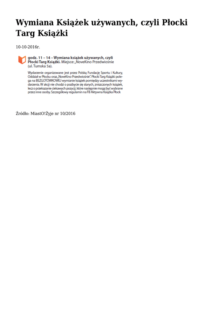 Wymiana Książek używanych, czyli Płocki Targ Książki 10-10-2016r. Źródło: MiastO!Żyje nr 10/2016