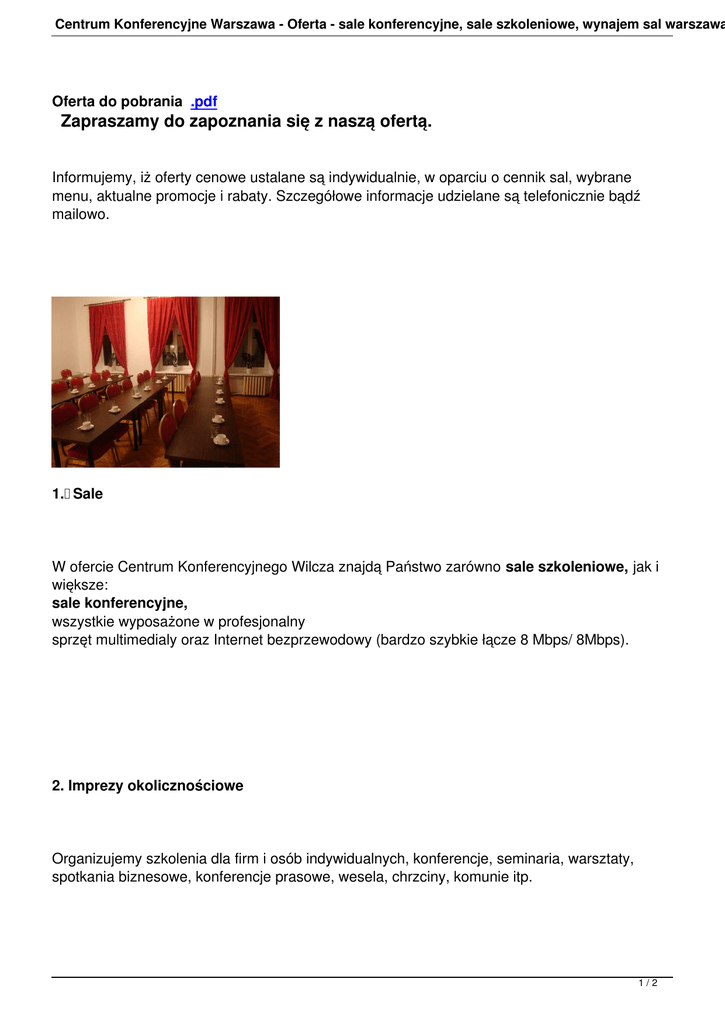 Centrum Konferencyjne Warszawa - Oferta - sale konferencyjne, sale szkoleniowe, wynajem sal warszawa Oferta do pobrania .pdf Zapraszamy do zapoznania się z naszą ofertą. Informujemy, iż oferty cenowe ustalane są indywidualnie, w oparciu o cennik sal, wybrane menu, aktualne promocje i rabaty. Szczegółowe informacje udzielane są telefonicznie bądź mailowo. 1. Sale W ofercie Centrum Konferencyjnego Wilcza znajdą Państwo zarówno sale szkoleniowe, jak i większe: sale konferencyjne, wszystkie wyposażone w profesjonalny sprzęt multimedialy oraz Internet bezprzewodowy (bardzo szybkie łącze 8 Mbps/ 8Mbps). 2. Imprezy okolicznościowe Organizujemy szkolenia dla firm i osób indywidualnych, konferencje, seminaria, warsztaty, spotkania biznesowe, konferencje prasowe, wesela, chrzciny, komunie itp. 1/2 Centrum Konferencyjne Warszawa - Oferta - sale konferencyjne, sale szkoleniowe, wynajem sal warszawa 3. Pełne zaplecze cateringowe Państwa Oferujemy wymagań bogate menu kulinarnych oraz dobrą i cenowych. zabawę. Zawsze dostosowujemy nasze propozycje do Przerwa kawowa Lunch - Przyjęcie zasiadane Konferencyjne Catering warszawie. dojazd. Centrum Obsługa wKonferencyjne Warszawie Konferencje nakonferencji Euro- 2012. obiad wWarszawa warszawie. iW szkoleń. wesele, centrum - sale Sale chrzciny, warszawy konferencyjne, konferencyjne komunia. w dzielnicy Sale szkoleniowe warszawa konferencyjne Śródmieście. cennik. w Warszawie. Centrum Dogodny w 2/2